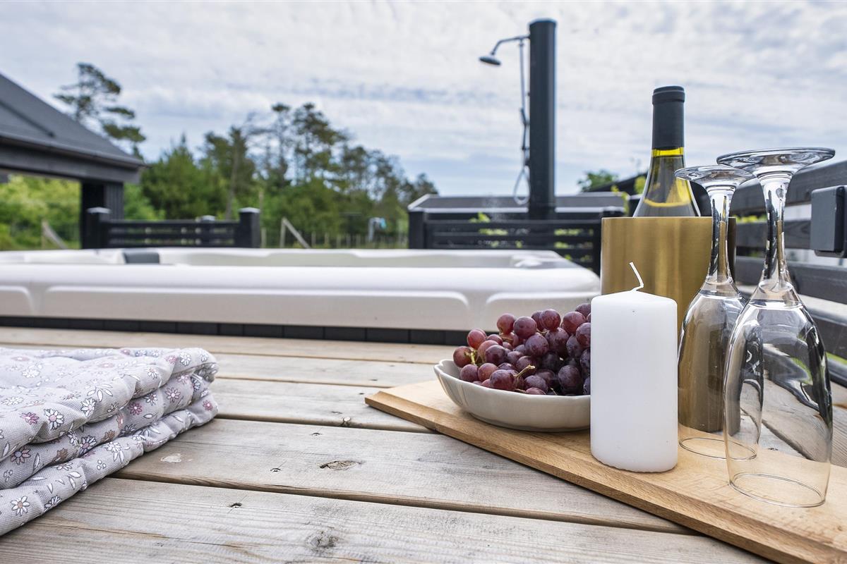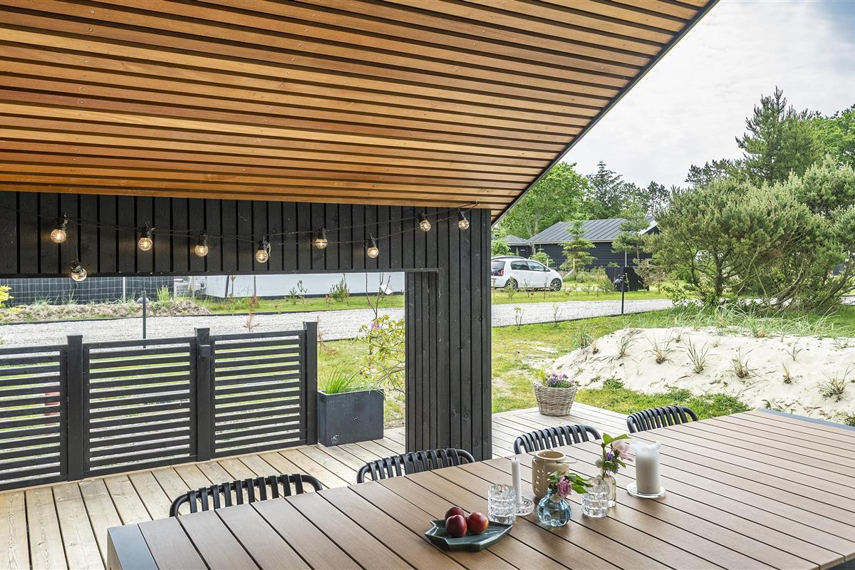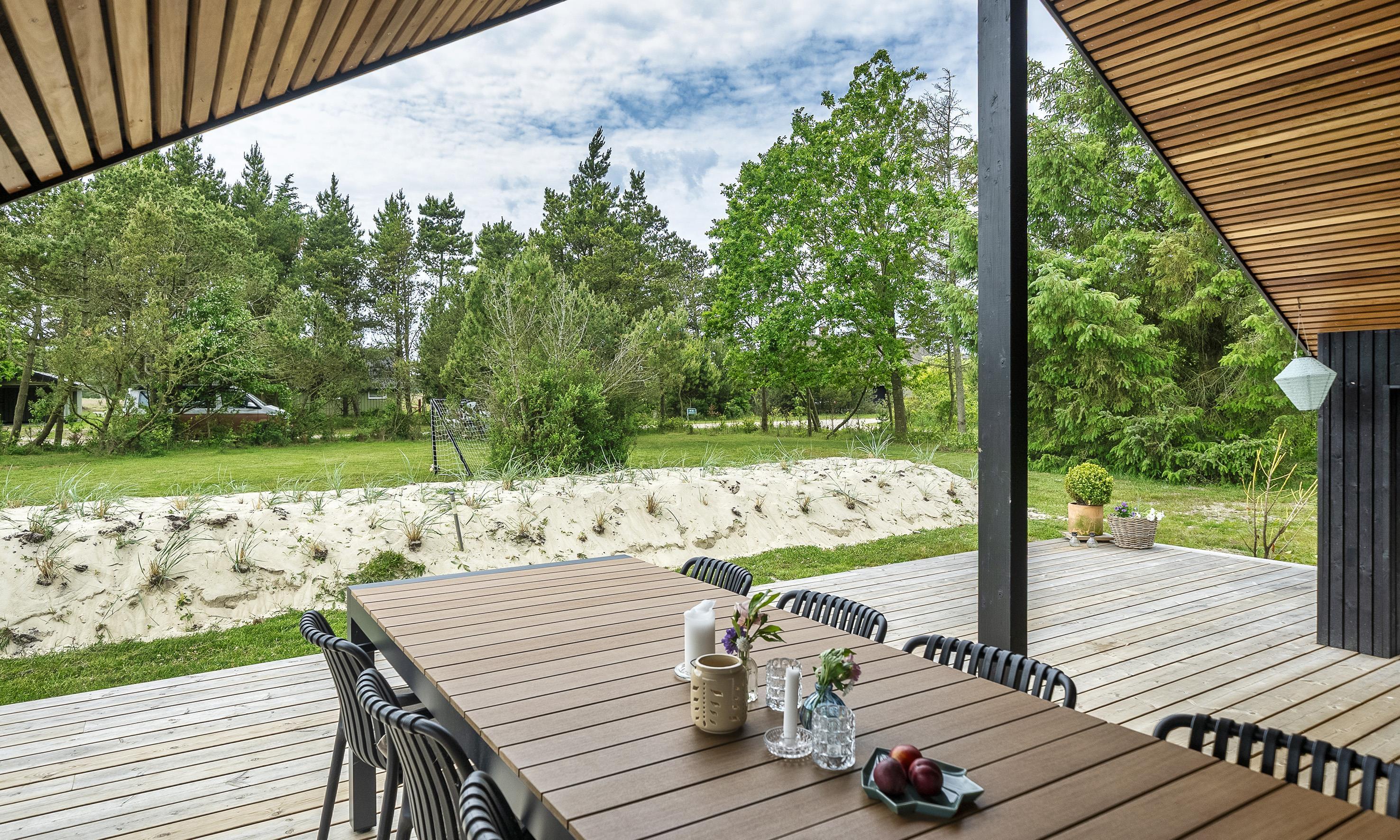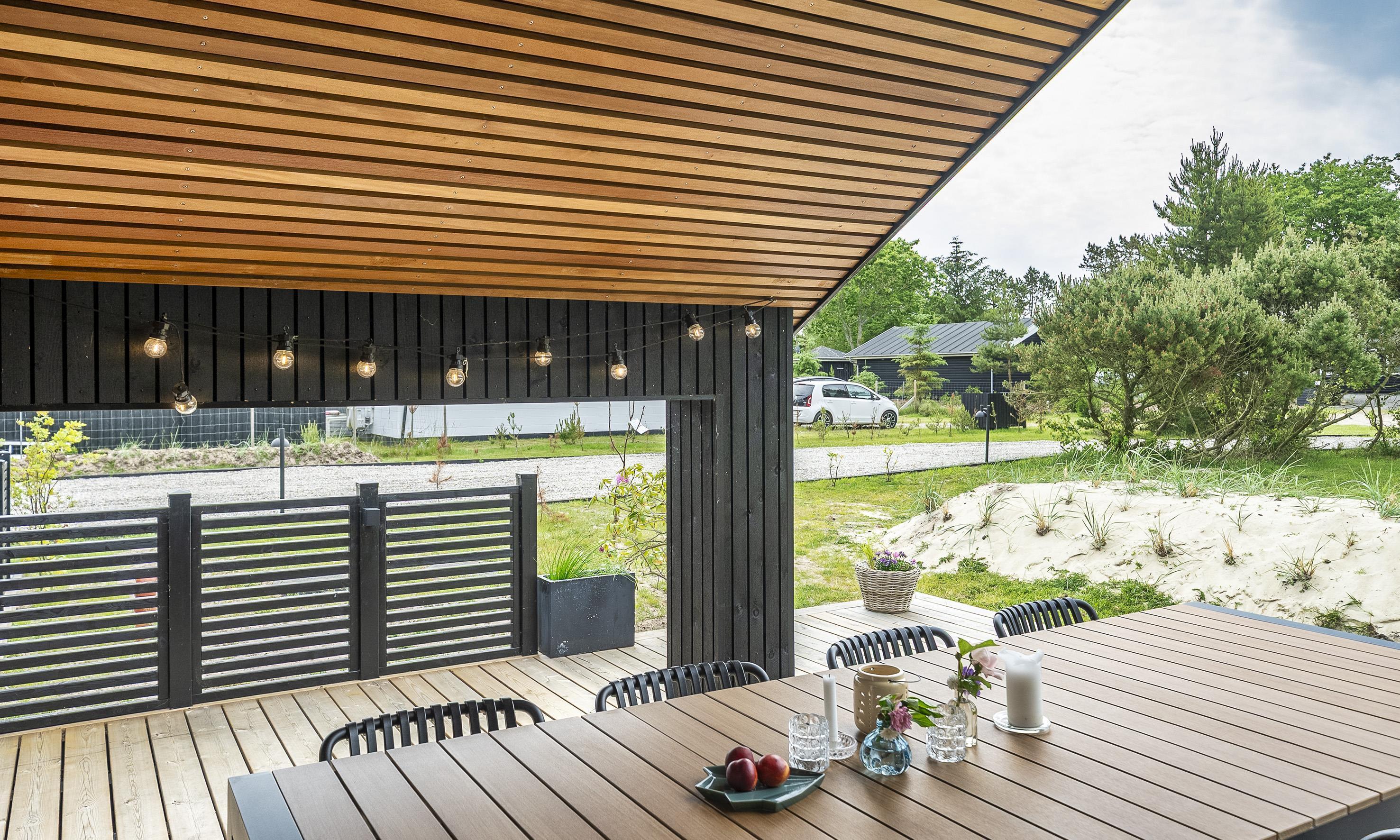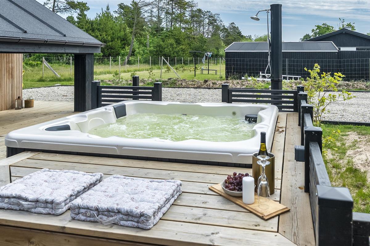 Welcome to this beautiful, newly built holiday home that combines modern comfort with classic summerhouse charm. The house is constructed of wood with a flat roof and features a large, partially covered wooden terrace where you can enjoy your holiday under the open sky – and relax in the wonderful outdoor spa.