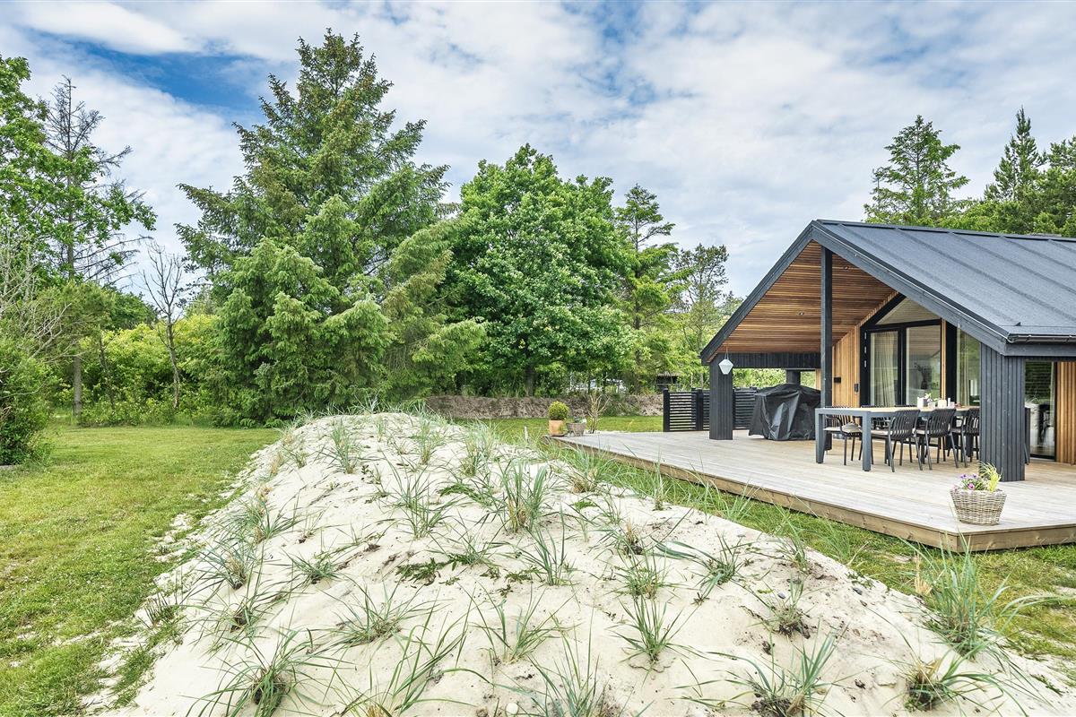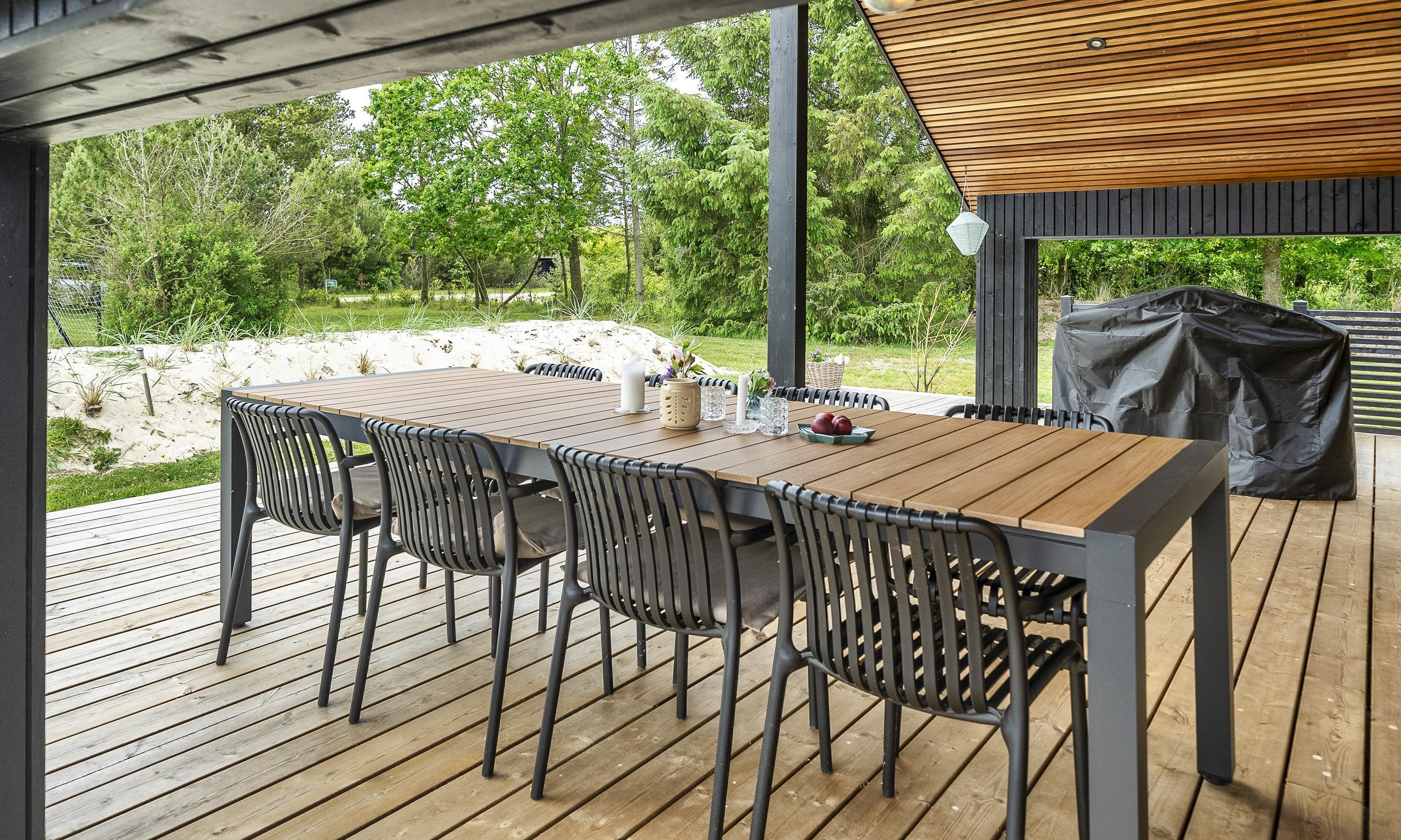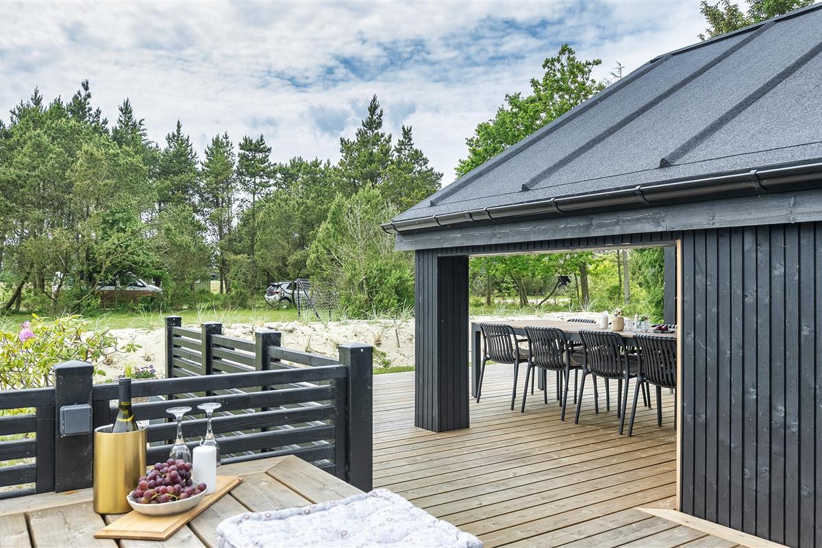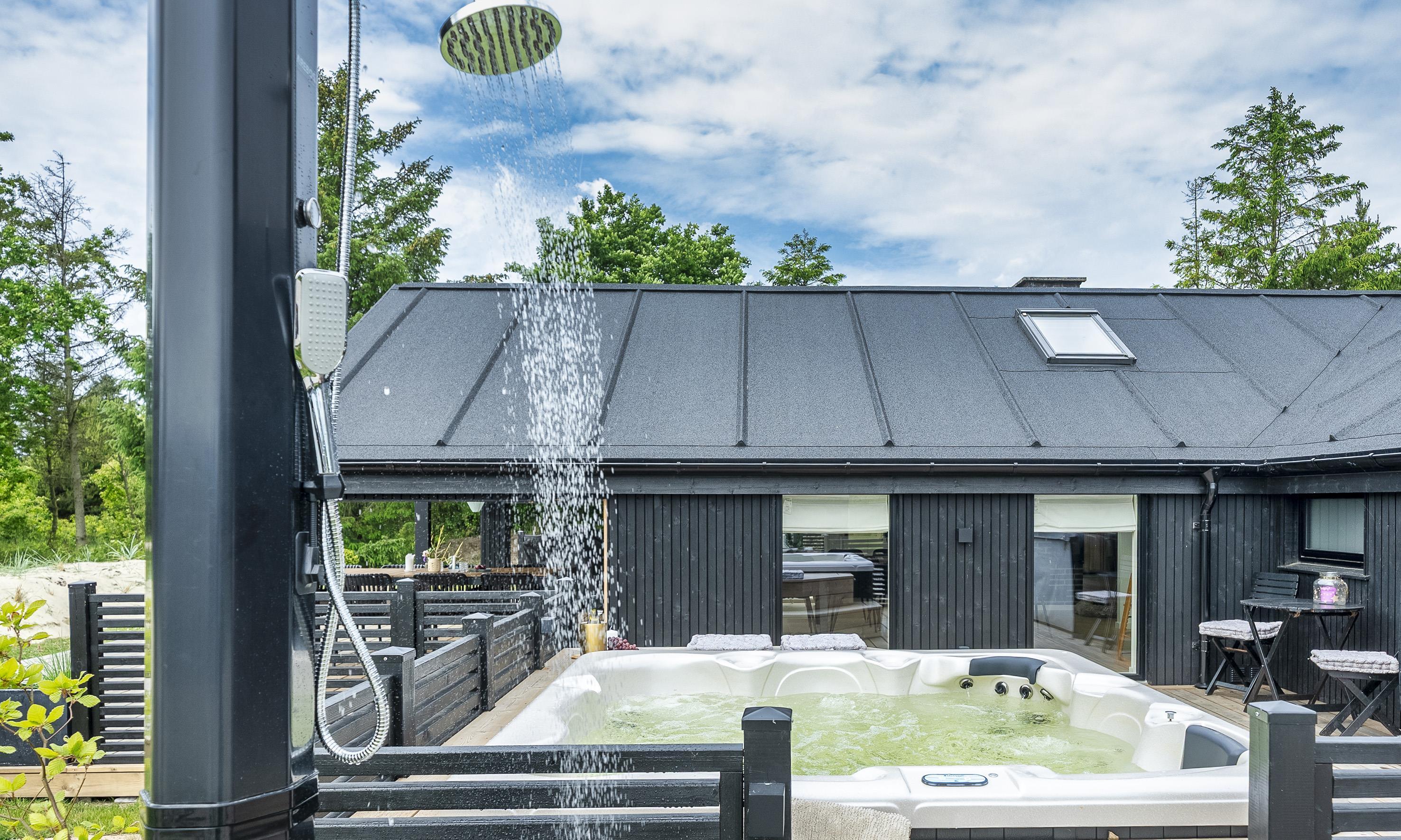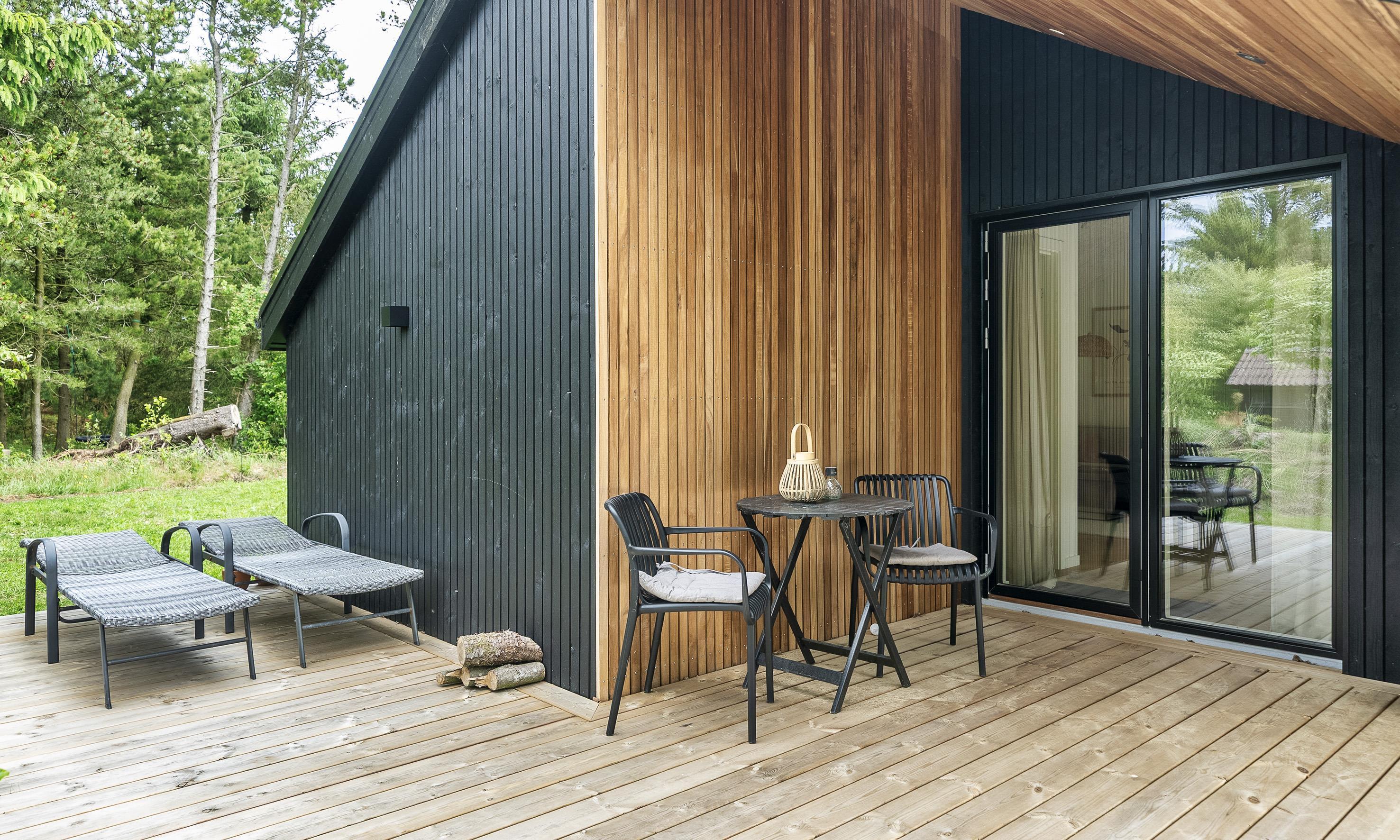 Welcome to this beautiful, newly built holiday home that combines modern comfort with classic summerhouse charm. The house is constructed of wood with a flat roof and features a large, partially covered wooden terrace where you can enjoy your holiday under the open sky – and relax in the wonderful outdoor spa.