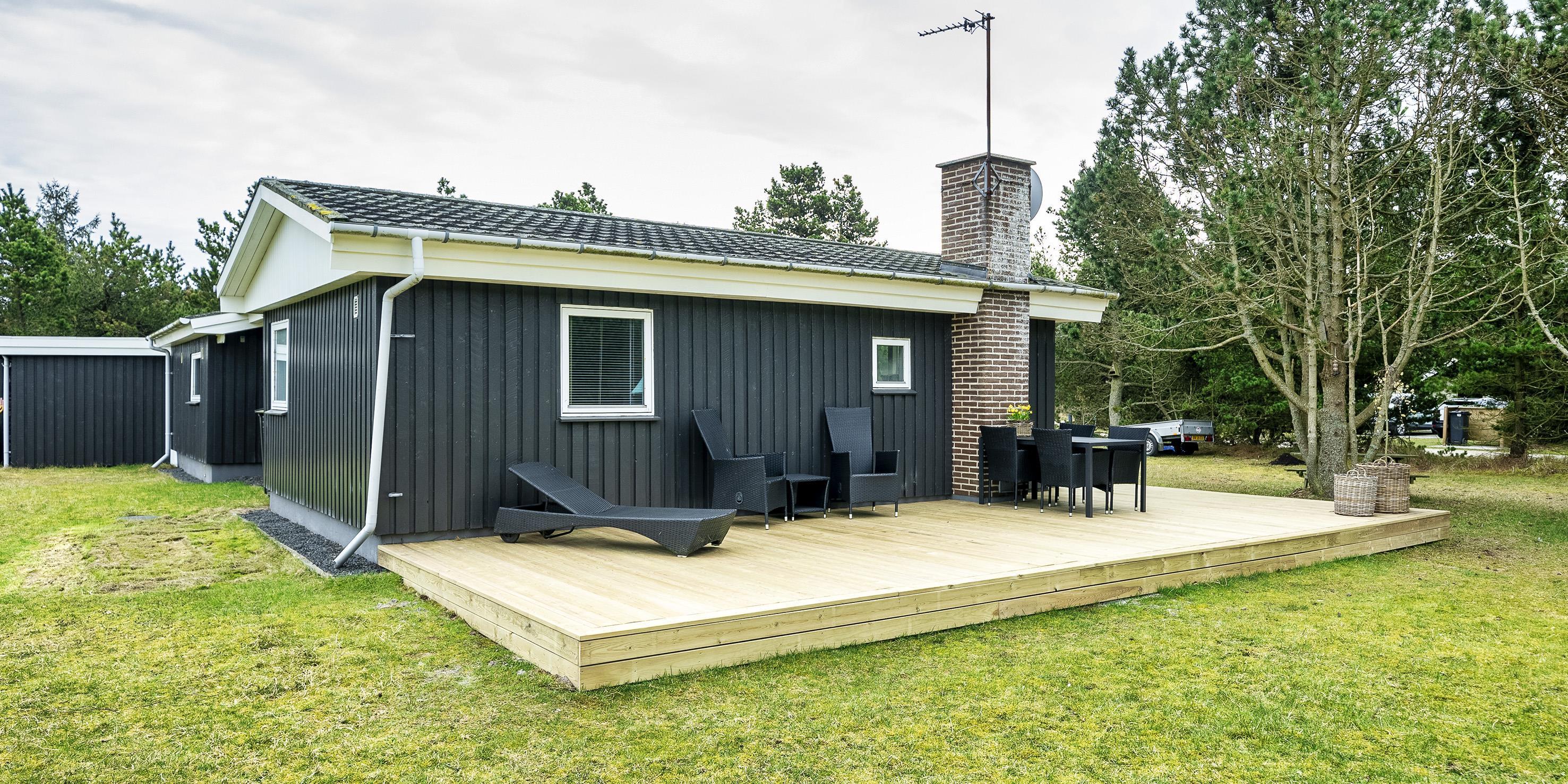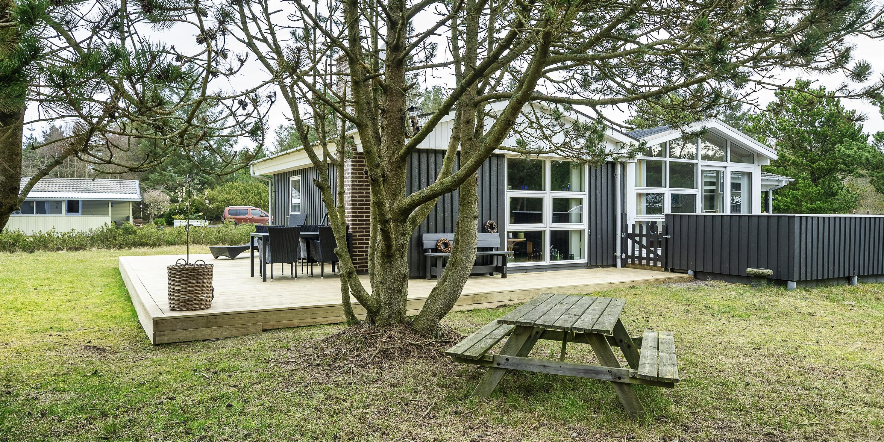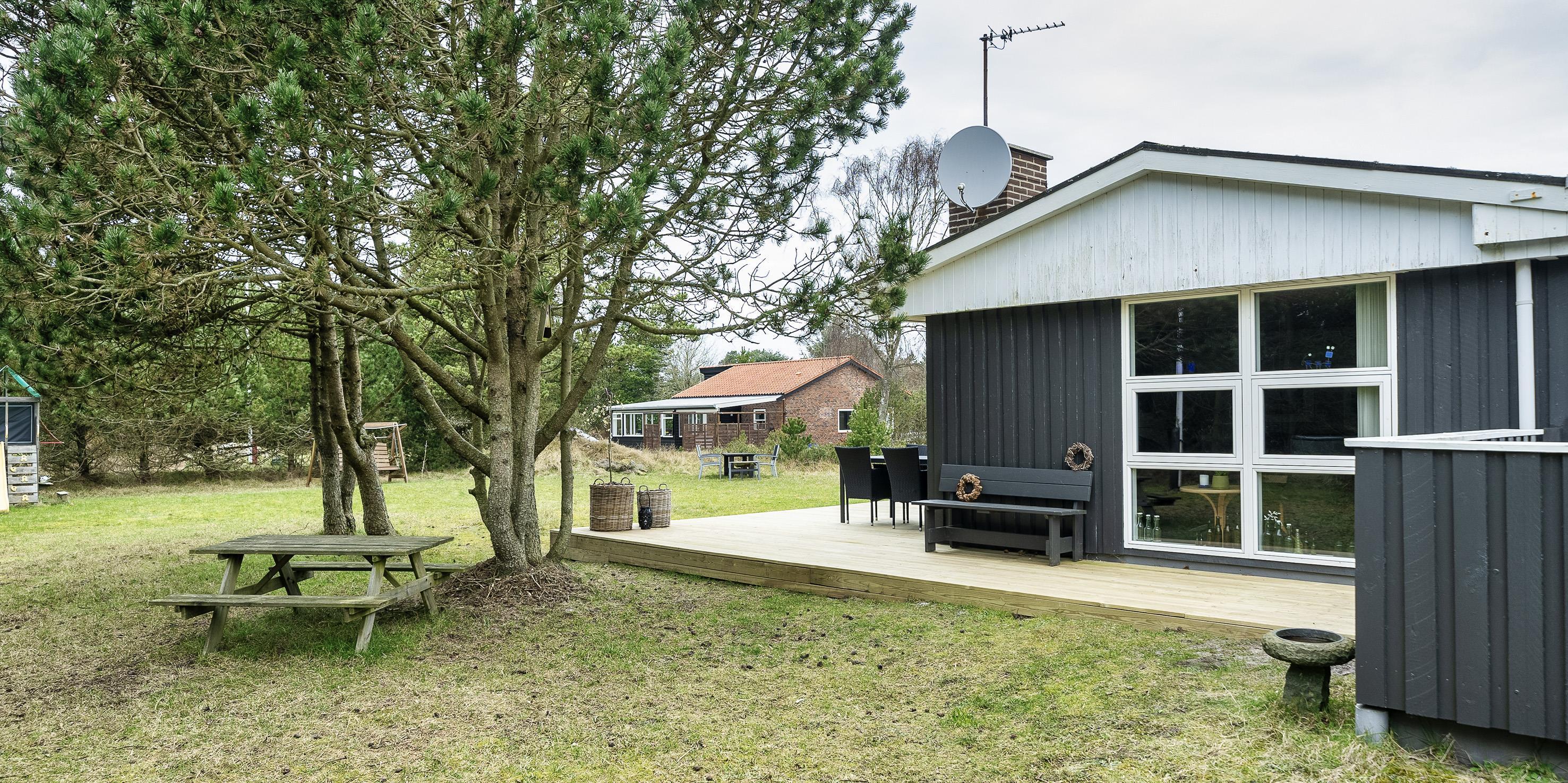 Cozy summer house for 6 people, located on 1753 m2 well-maintained land, approx. 1,500 meters from the beach. The house appears very well maintained with an extension from 1996 that contains a large living room with wood burning stove, television, Chromecast and TV (Stofa summer house package). Wireless Internet access. 1 large bedroom with 1 double bed and wardrobes. Bathroom with shower/wc and underfloor heating. From the living room you come into a raised dining room with a dining nook, and in open connection with the kitchen, which features a stove with ceramic hob, dishwasher, hood and fridge-freezer. A new kitchen has been added in 2023 and the entrance has been renovated. Conservatory with dining area. From the dining room there are also 2 bedrooms, 1 bedroom with 2 single beds and 1 bedroom with 1 bunk bed and a short single bed. Partially closed terrace and covered entrance area. Pets allowed with 2 small dogs! Smoking not allowed.! Year of construction 1967, charging station for electric cars, rebuilt in 1996. 3 bedrooms: DB + 2B + 3B.