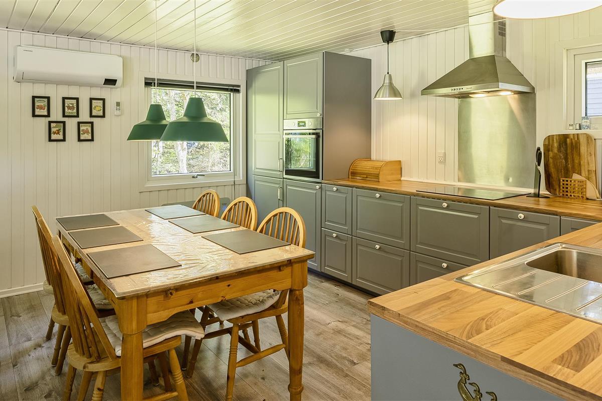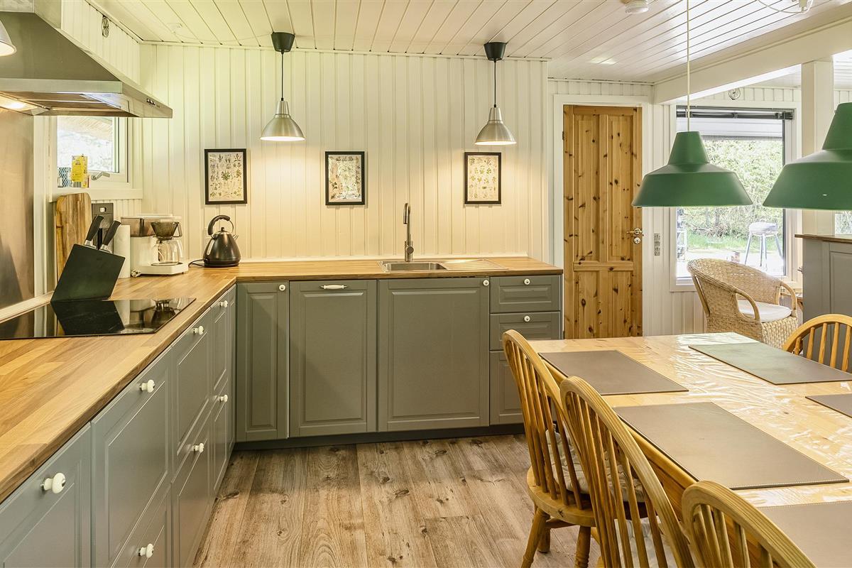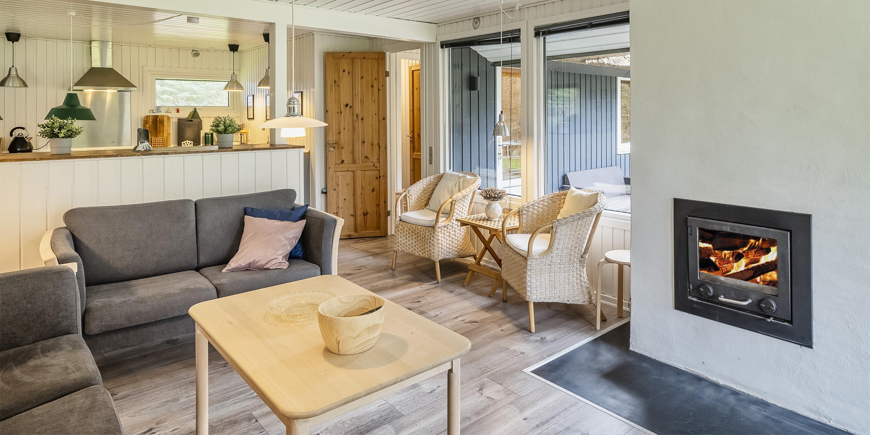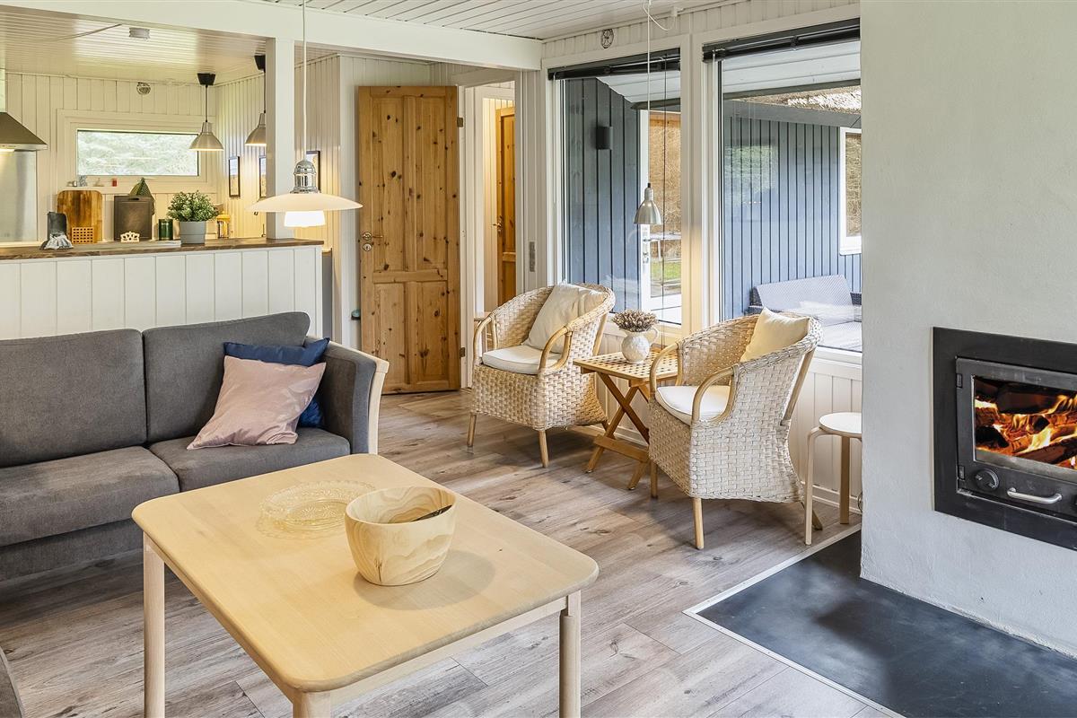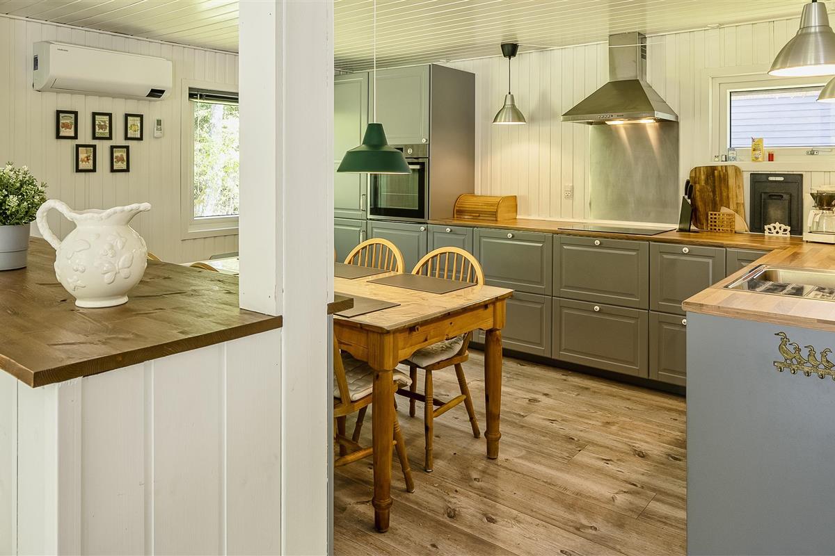 The house contains: Entrance/distribution corridor that leads into the house's kitchen-dining room. The kitchen is new from 2021 and looks like a country kitchen with a wooden worktop with dishwasher, built-in oven, ceramic hob, hood and a built-in fridge/freezer. Lovely dining area with a long table and plenty of space. The kitchen-dining room and the living room are divided by a half wall with extra cupboards. Cozy and bright living room with sofa corner with a view to Smart TV, Google mini nest and an insert fireplace that functions as a wood stove, as well as the cozy garden. There is access to the garden from a patio door in the living room. The house has wireless internet available. From the distribution corridor there is access to 3 bedrooms: DB + 2B + 2B. The house has a large, lovely wooden terrace to the south, where the sun can be enjoyed all day, there is a barbecue area and a sandbox and play stand for the little ones on the terrace. The house also has a heat pump. There is a gas grill at the house which the homeowner has made available. Gas for the barbecue must be brought.