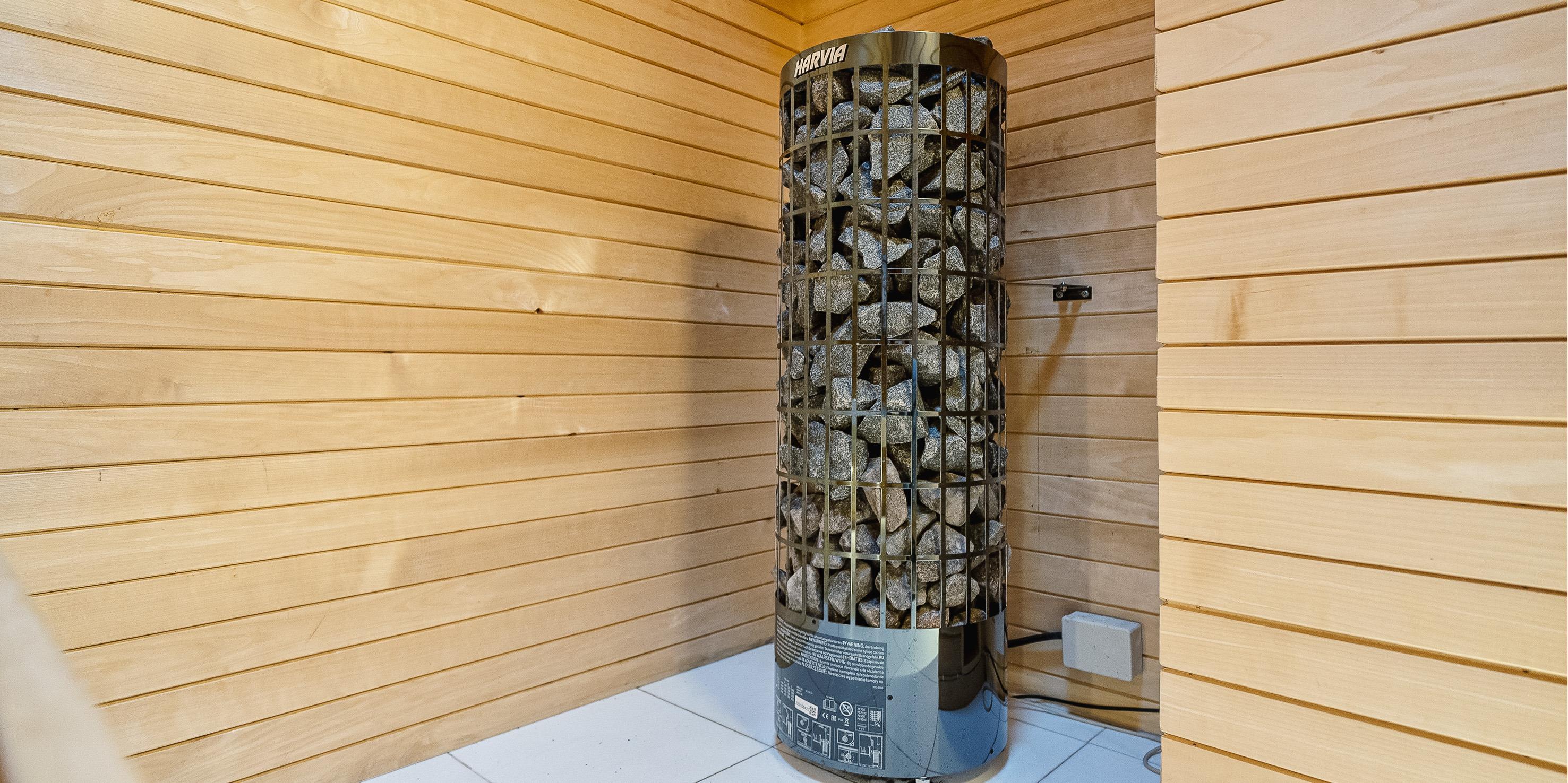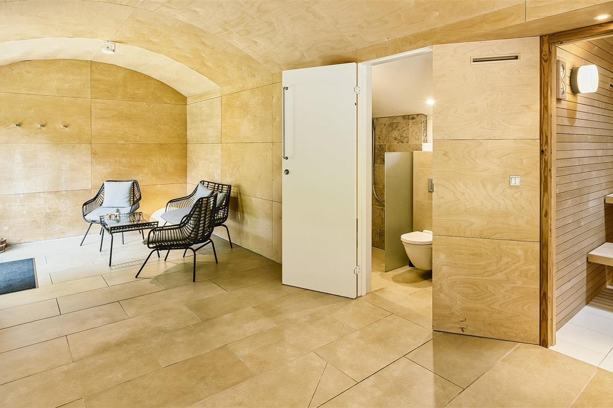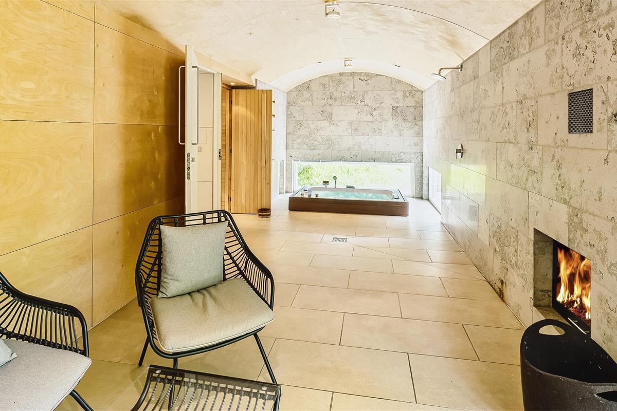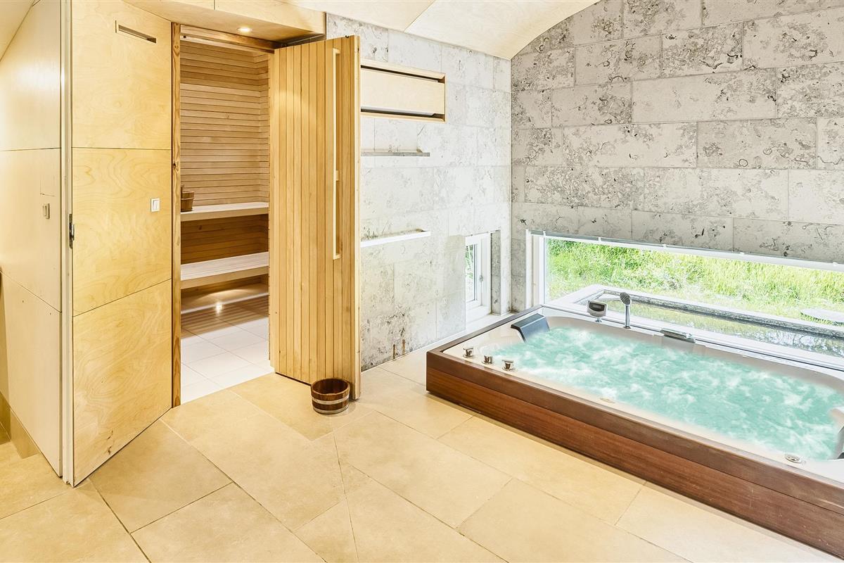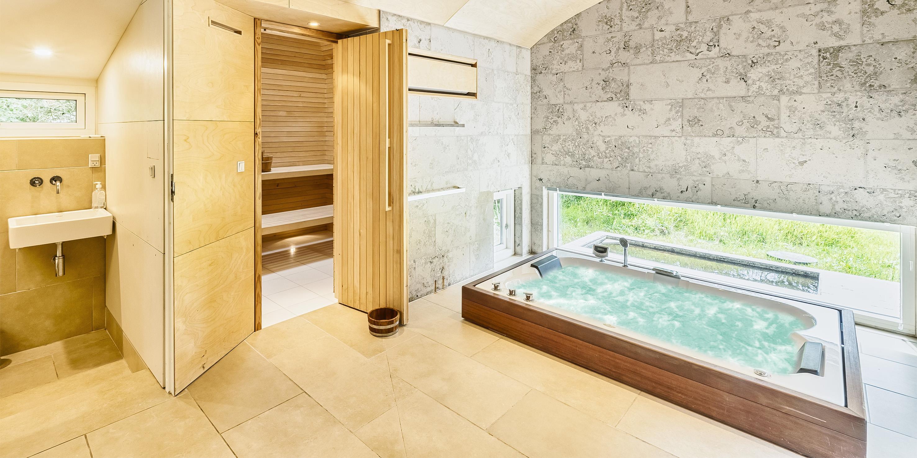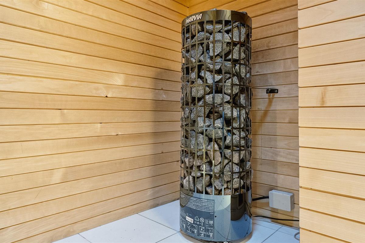 Bathroom temple with sauna, large spa, shower, toilet and wood-burning stove.