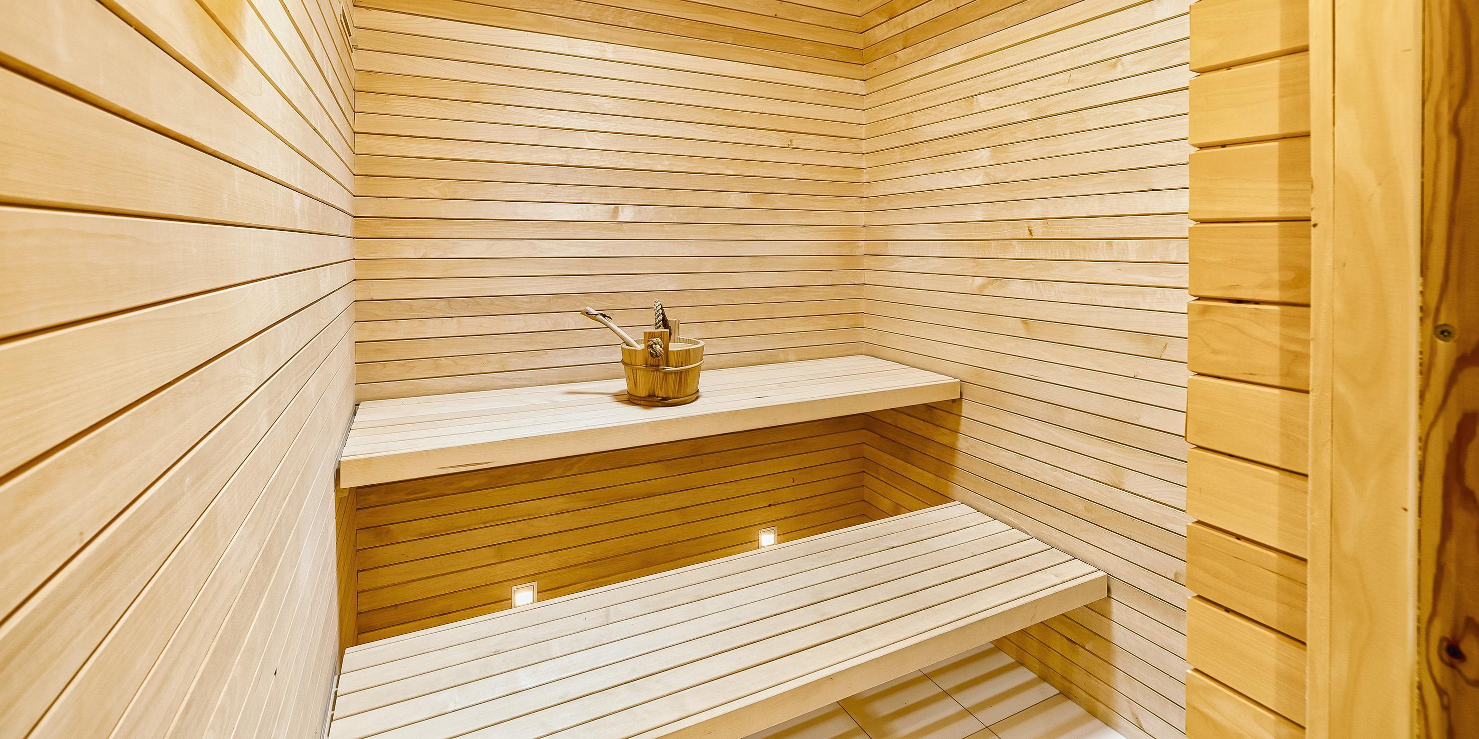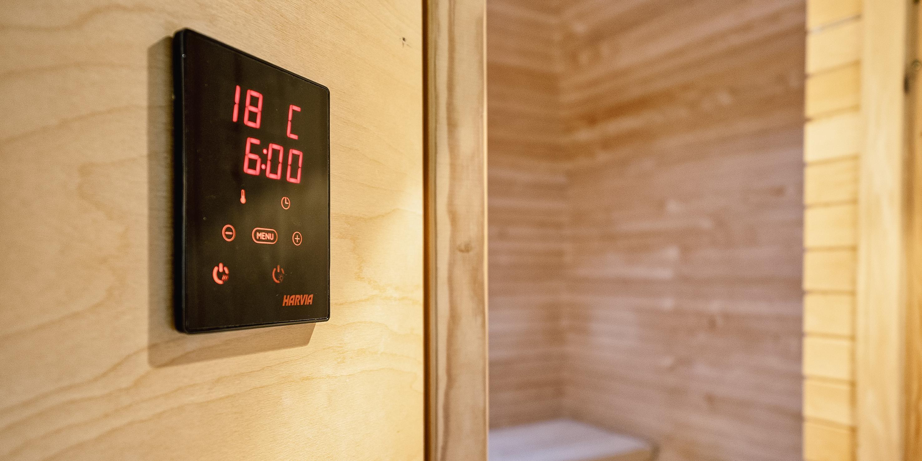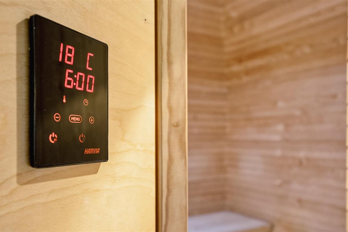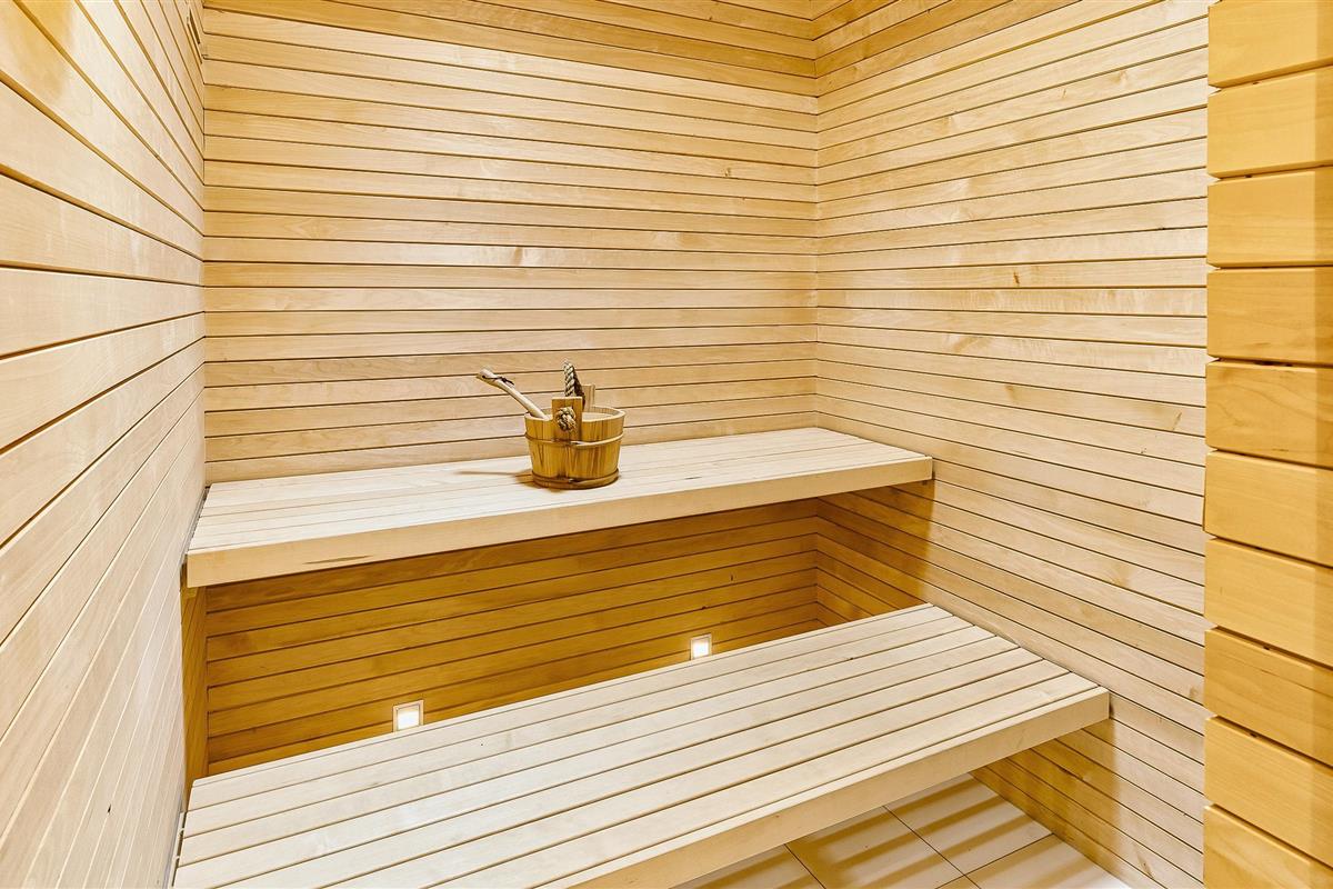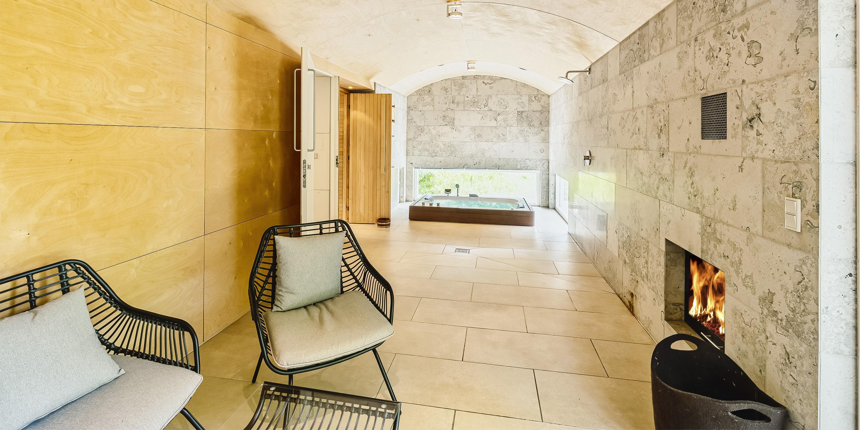 Bathroom temple with sauna, large spa, shower, toilet and wood-burning stove.