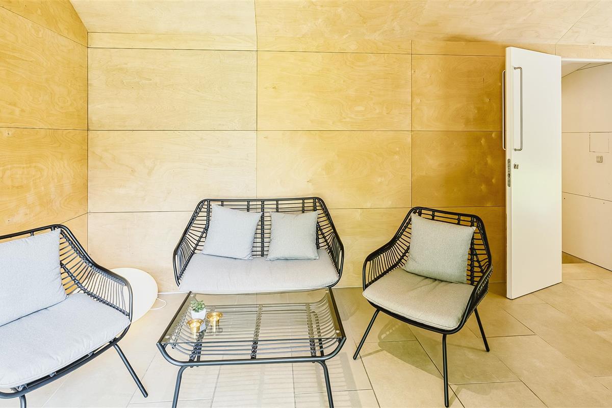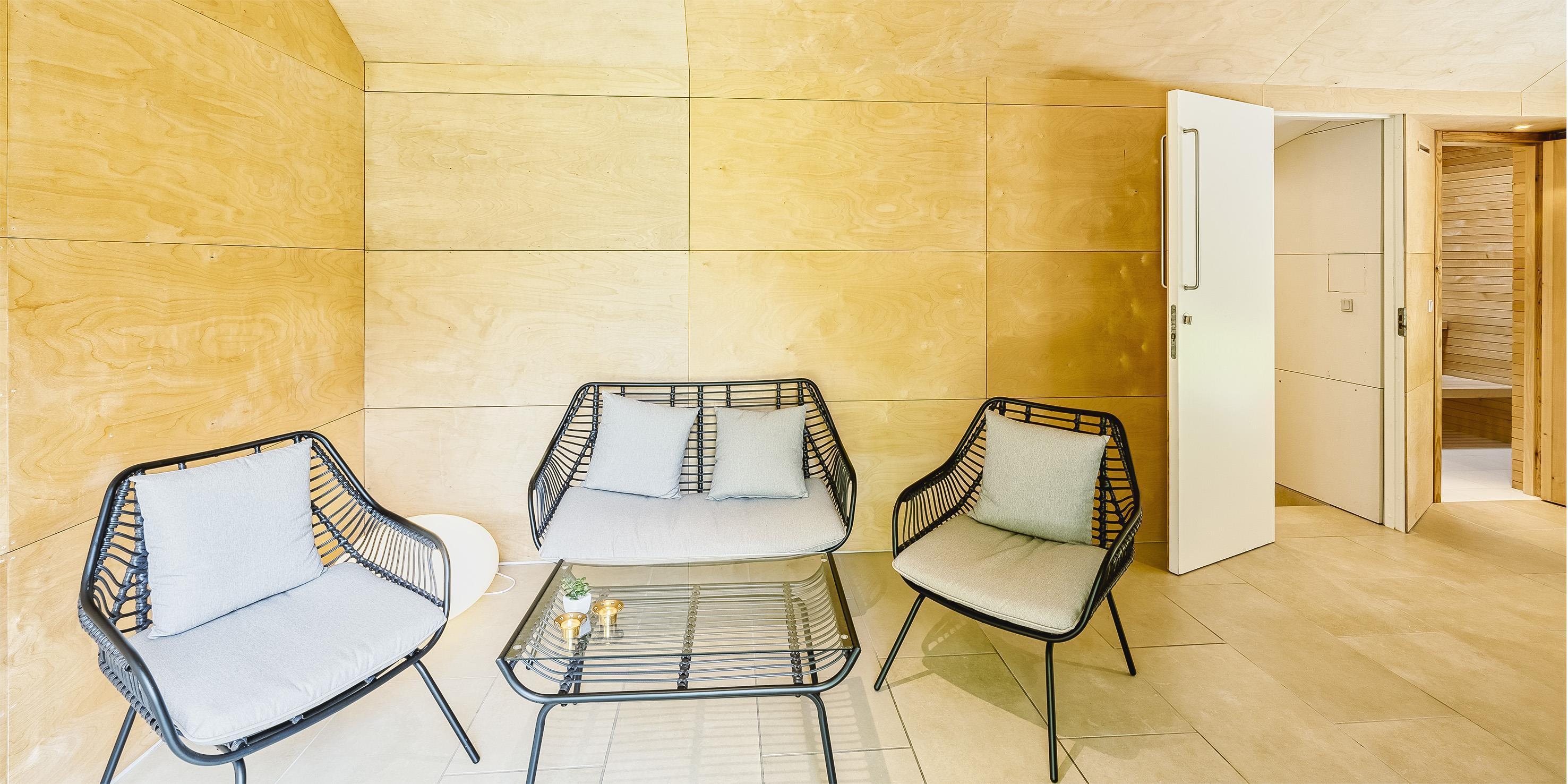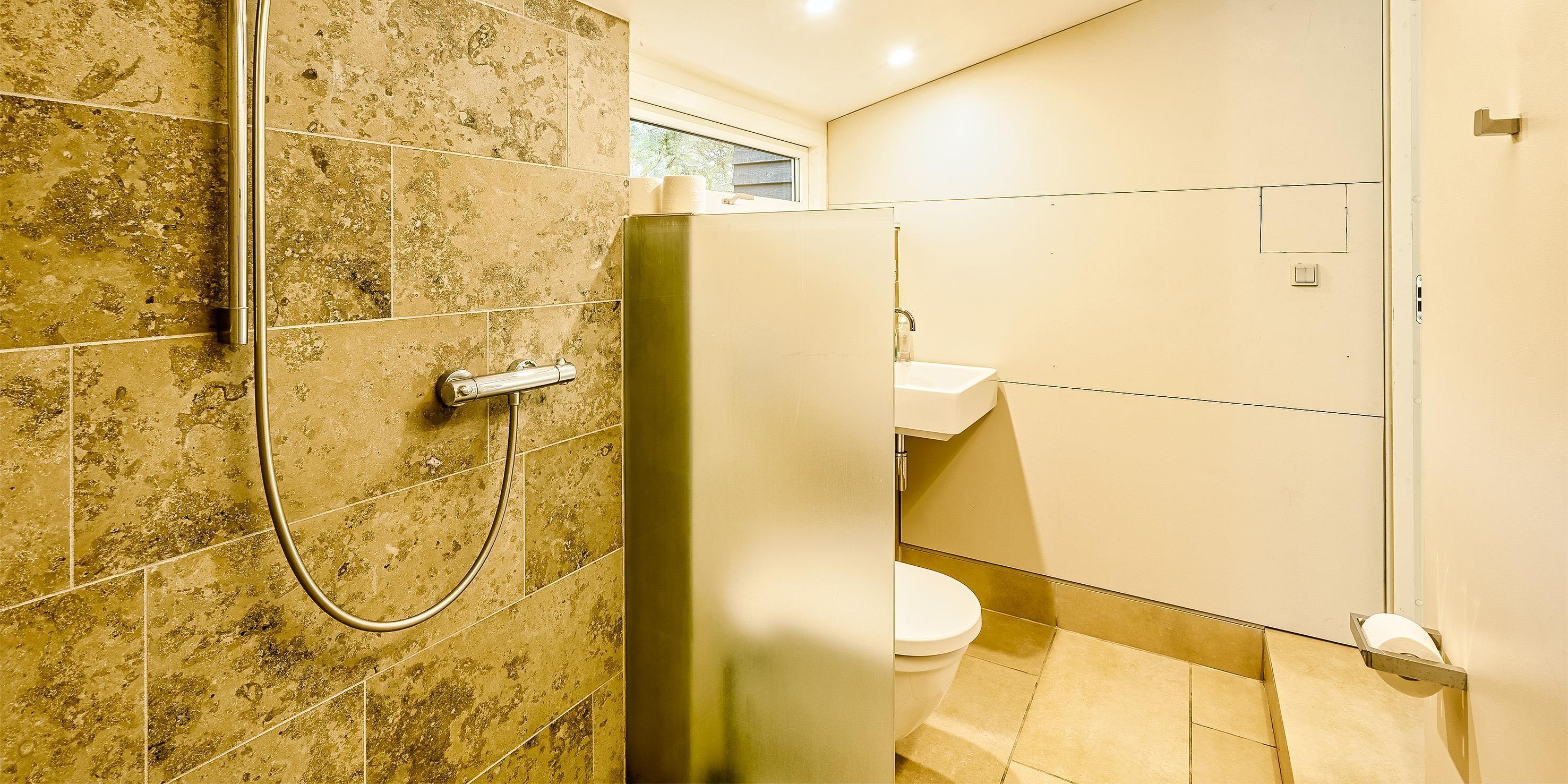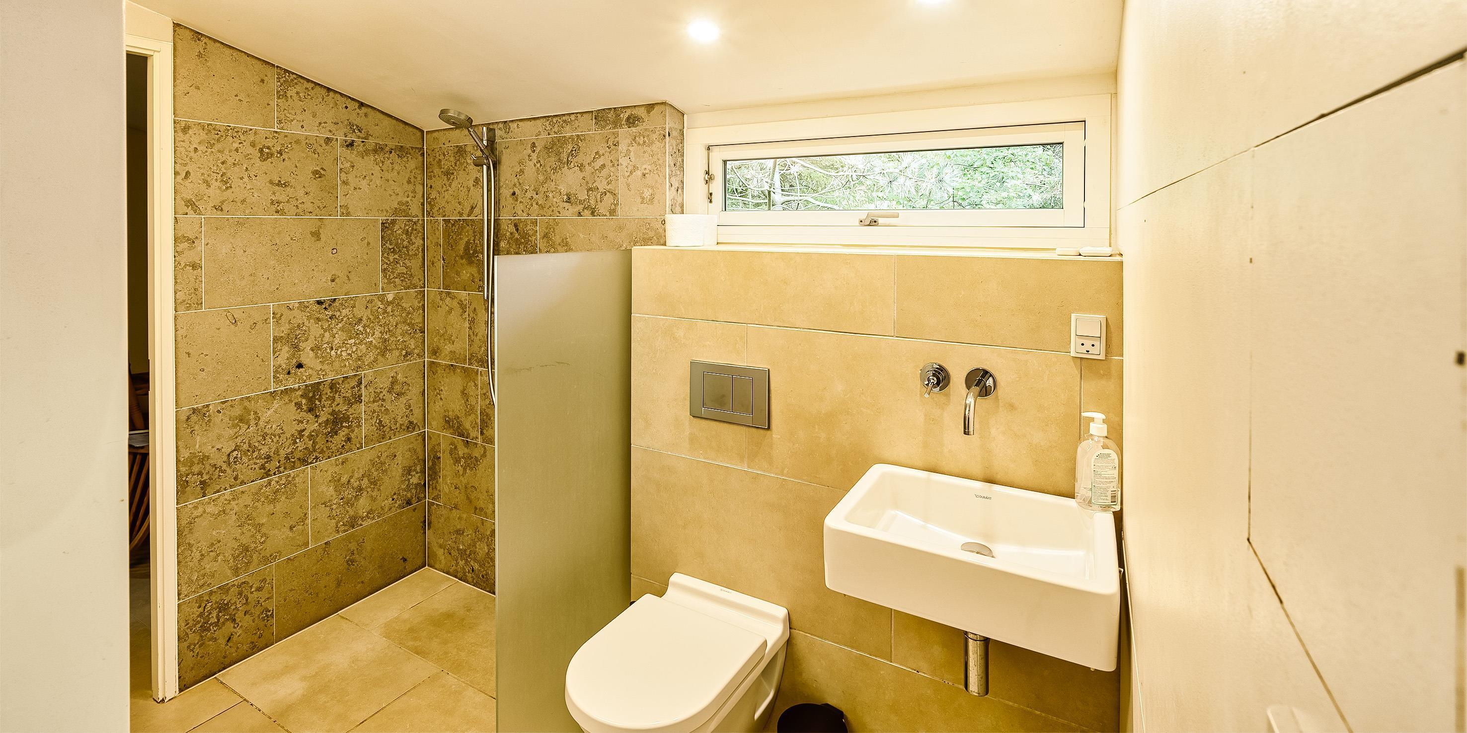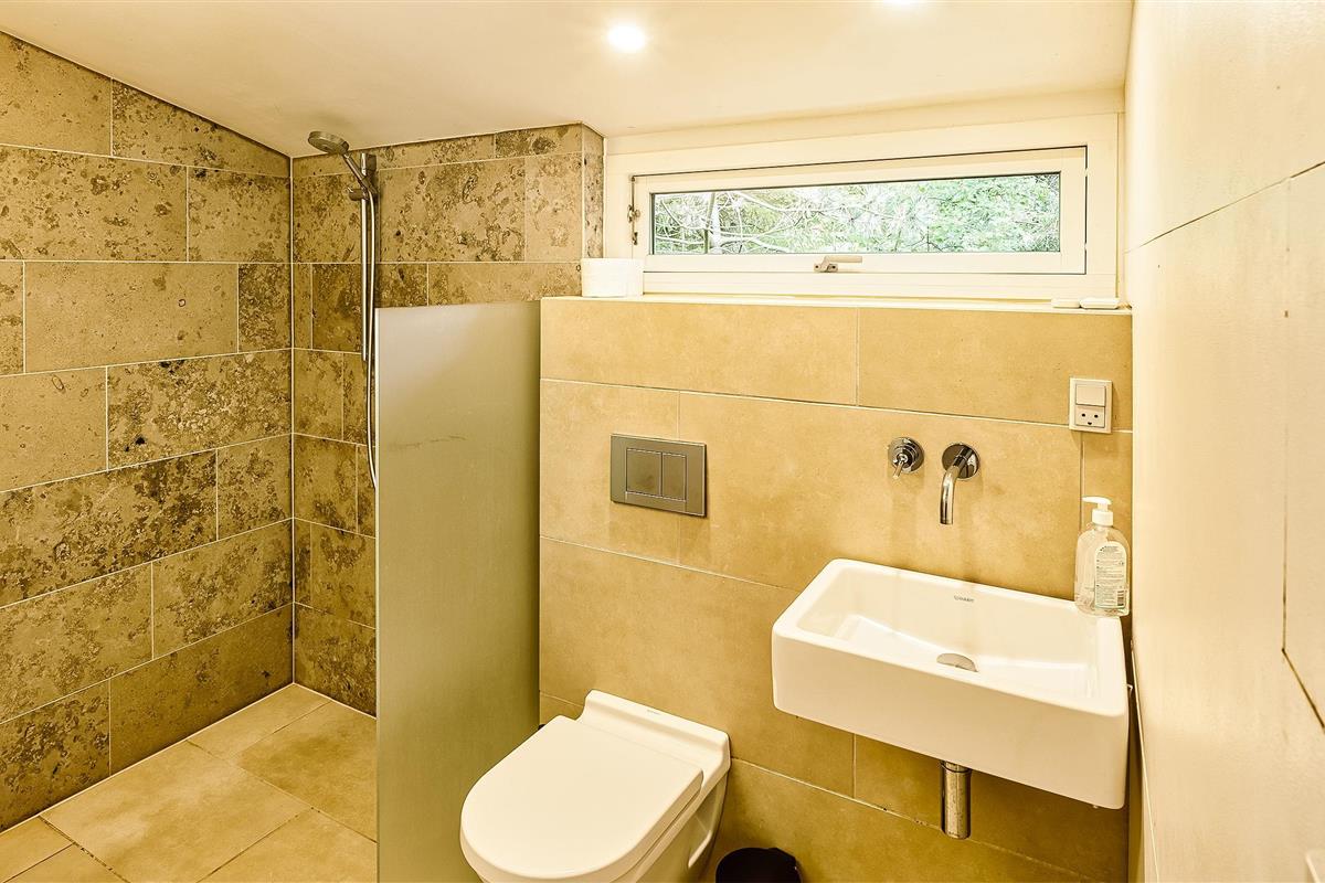 Bathroom temple with sauna, large spa, shower, toilet and wood-burning stove.