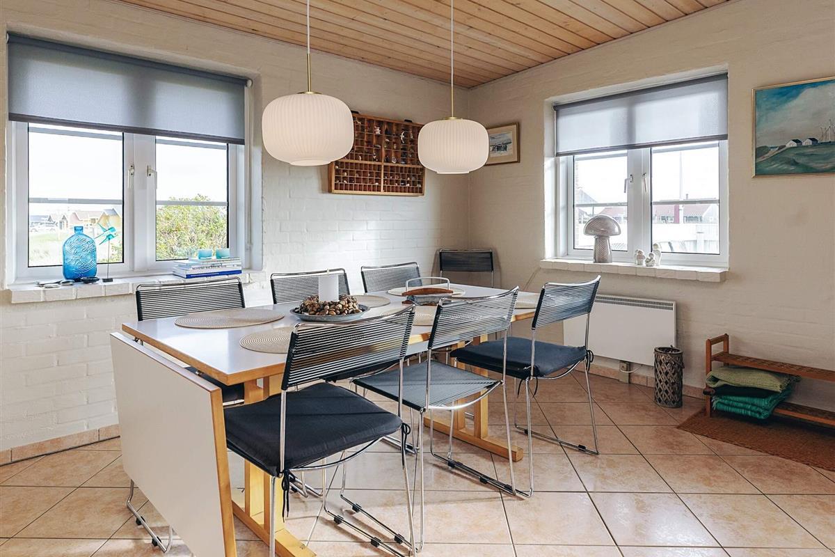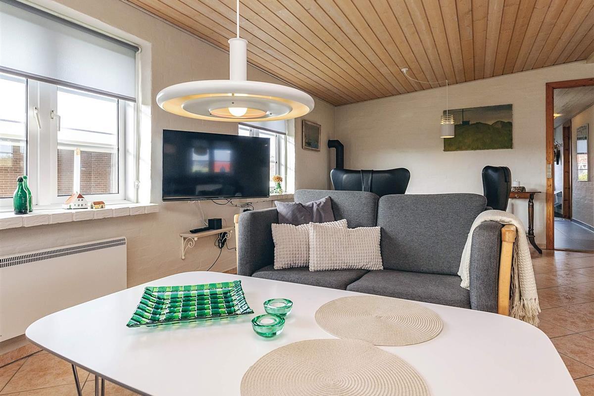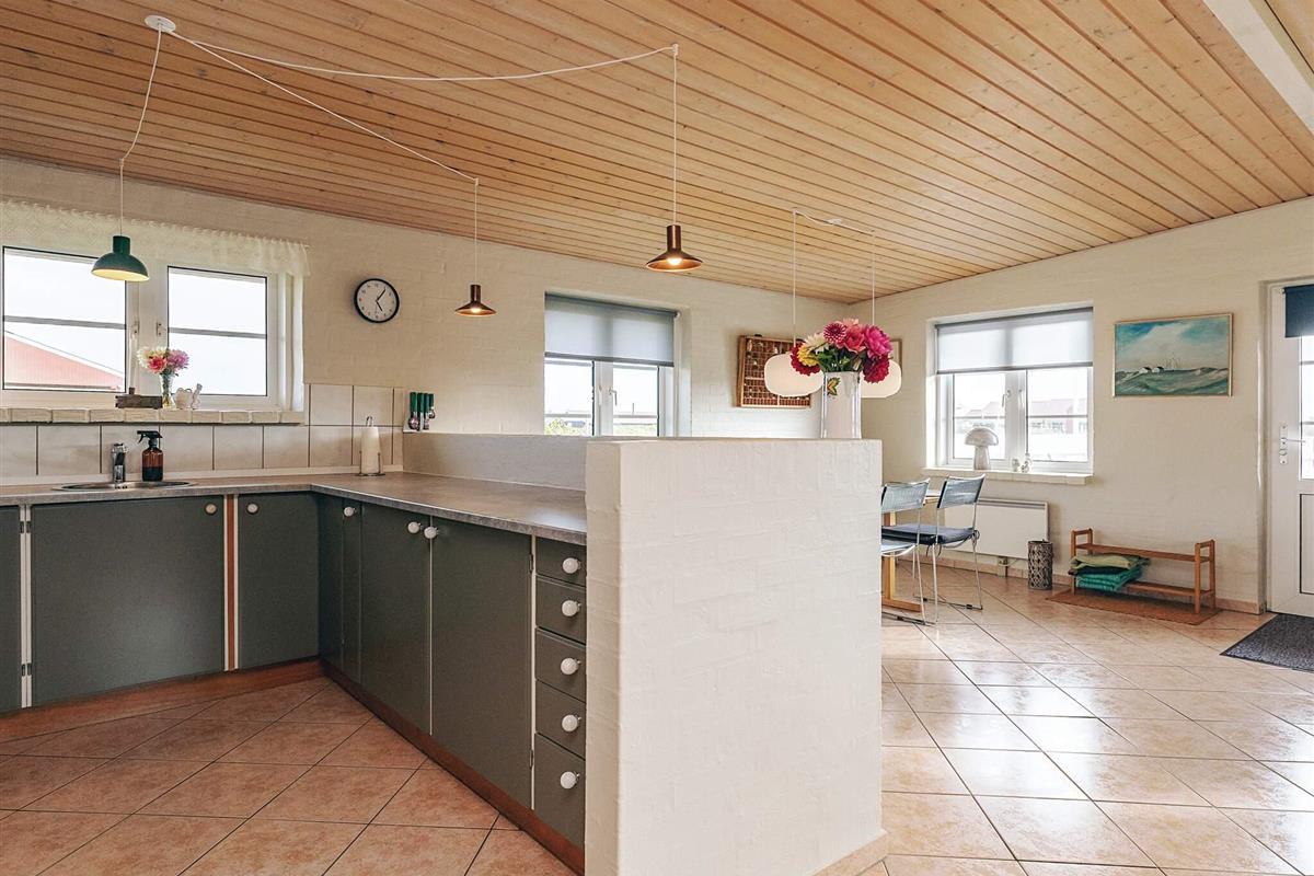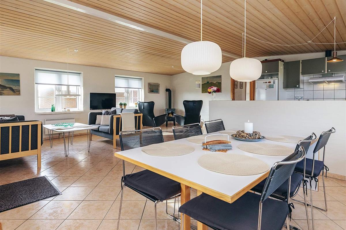 Schönes, helles Ferienhaus mit fantastischer Lage auf einem großen Naturgrundstück nur 150 m von der Nordsee entfernt. Im Jahr 2025 renoviert. Herrliche Aussicht auf die Dünen und die Umgebung. Das Haus ist gut ausgestattet und das große Wohnzimmer, das in offener Verbindung mit der Küche steht, bietet reichlich Gelegenheit, es sich drinnen gemütlich zu machen und verschiedenen Aktivitäten nachzugehen. Die geräumige Küche ist mit einem Cerankochfeld und einem Kühlschrank mit Gefrierfach ausgestattet. Ein Holzofen sorgt für Gemütlichkeit und Wärme an einem kühlen Sommerabend oder einem regnerischen Herbstabend. Das Wohnzimmer ist gut und gemütlich eingerichtet und ist der perfekte Ort zum Entspannen. Es gibt einen Fernseher mit internationalen Kanälen. Es gibt eine Satellitenschüssel am Haus. Das Haus hat 3 Schlafzimmer, eines mit einem Doppelbett (140 x 200) und zwei Einzelbetten in jedem der beiden anderen. Das Badezimmer ist mit Fußbodenheizung ausgestattet. Draußen gibt es zwei Terrassen mit Gartenmöbeln, von denen eine teilweise überdacht ist. Hier können Sie Ihr Abendbrot genießen, während die Sonne über der Nordsee untergeht. Es gibt auch eine Außendusche mit Warmwasser im Sommerhalbjahr. In den Sommermonaten gibt es ein Lebensmittelgeschäft und eine Cafeteria im Umkreis von 150 Metern, und in der nahe gelegenen Stadt Harboøre gibt es das ganze Jahr über gute Einkaufsmöglichkeiten. Nicht verfügbar für Jugendgruppen.