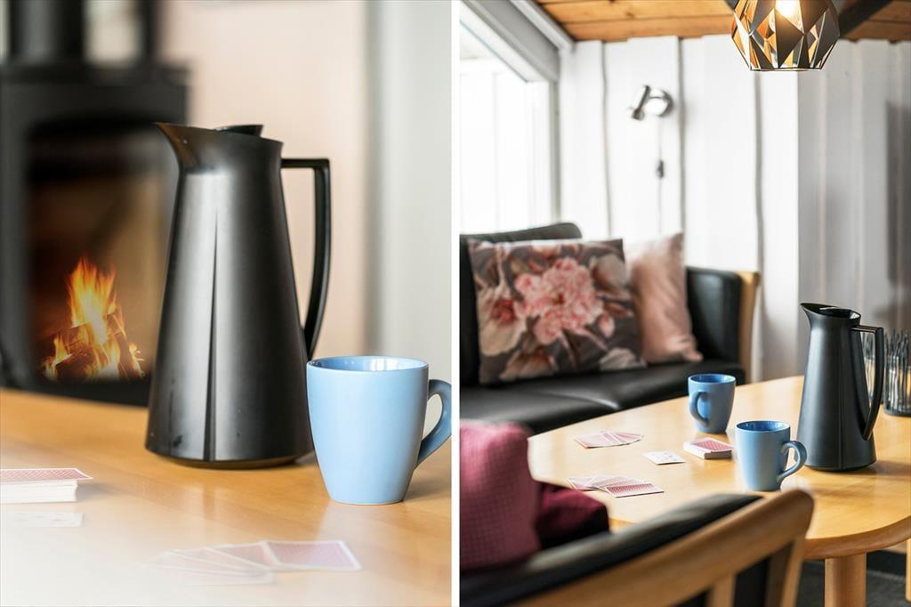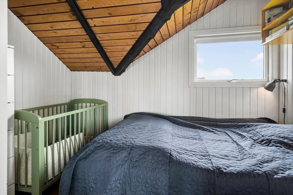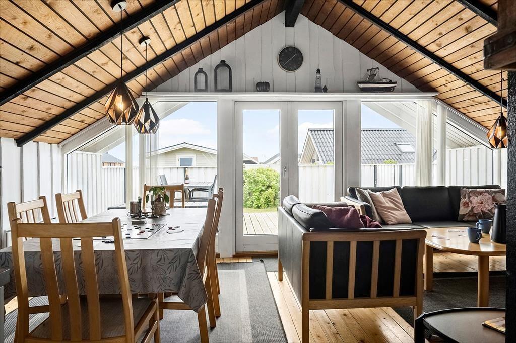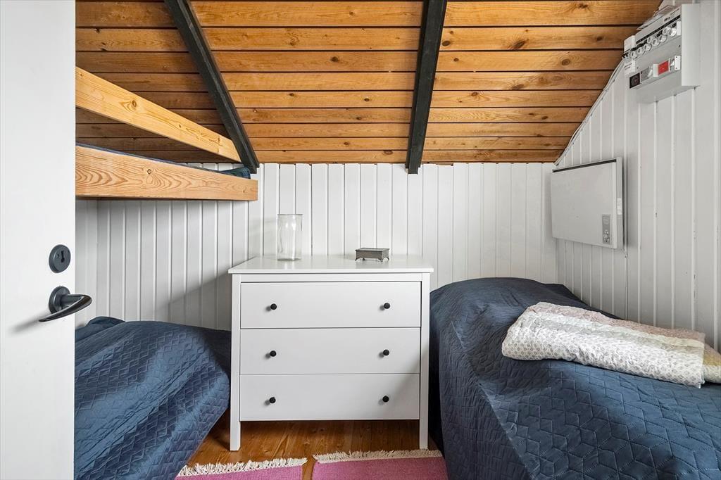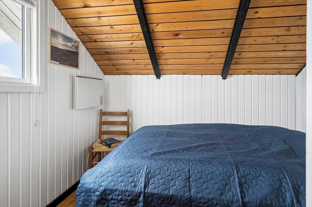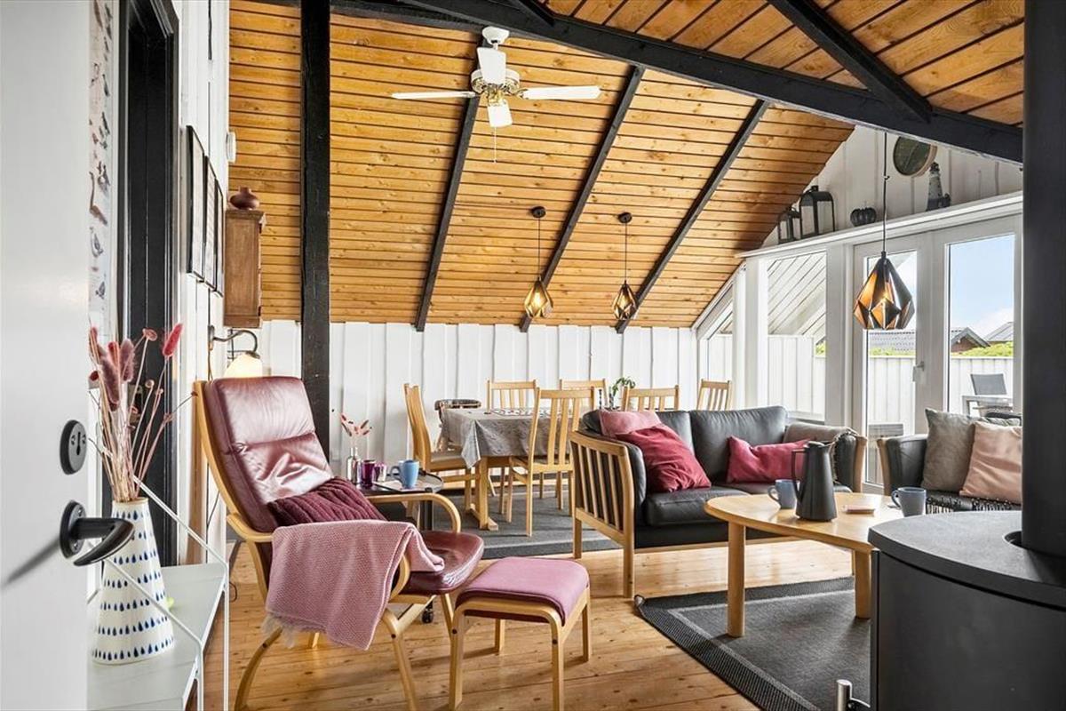 When you step into this cozy holiday home, you are greeted by a bright and inviting atmosphere. The living room and kitchen are combined in an open space, creating a spacious and pleasant living area. In the living room, you can relax in the comfortable sofa, enjoy meals at the dining table, or warm yourself by the wood-burning stove on cooler evenings. From the living room, you have direct access to the terrace, where you can enjoy your morning coffee in the fresh air. The holiday home features four bedrooms: two with double beds, one of which includes a baby cot, and two with single beds, providing flexible sleeping arrangements for family and friends. The bathroom is functional with a shower.