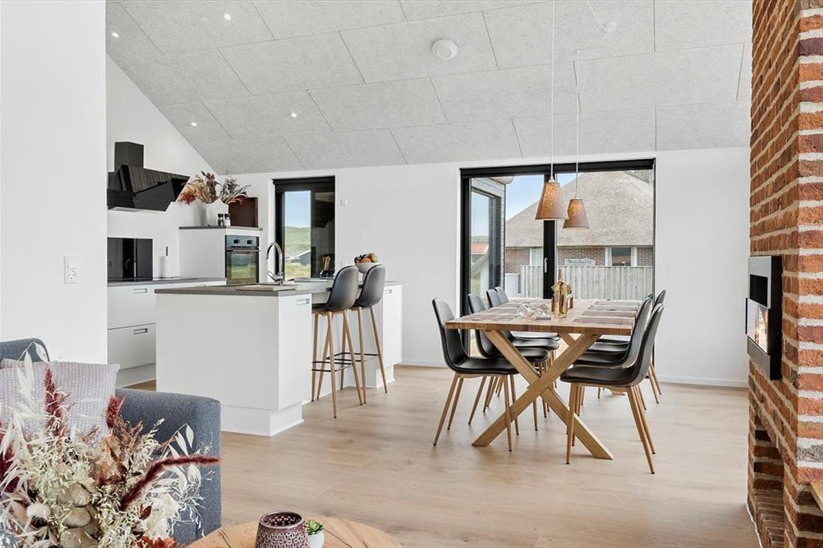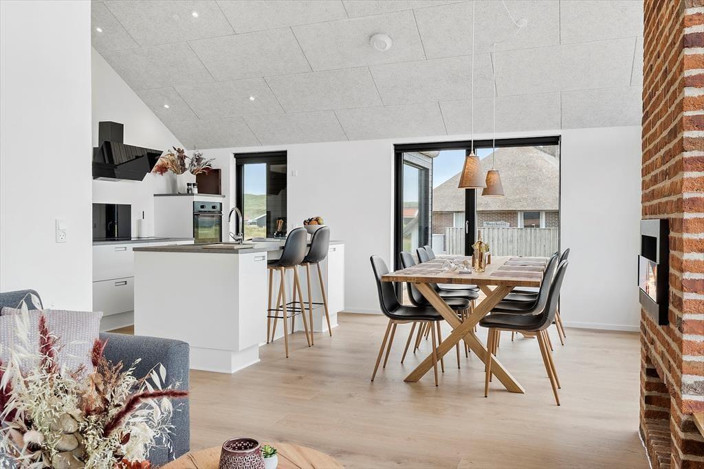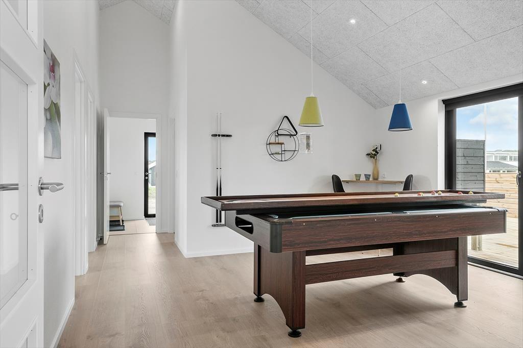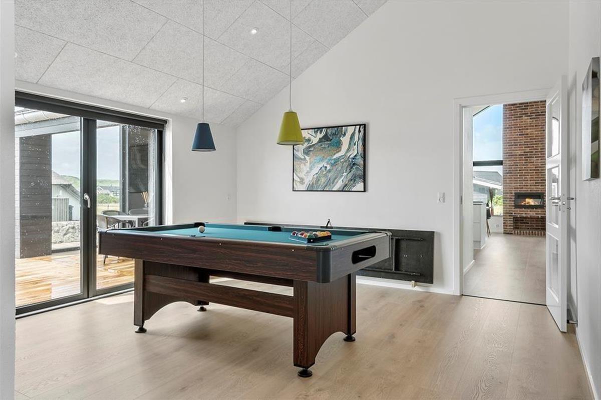 The holiday home at Vejlby Klit 34B has a wonderful atmosphere that will make you feel instantly at home. The open-plan living area seamlessly connects the kitchen, dining space and lounge, creating a cosy setting where you can gather around the atmospheric bio fireplace on cooler evenings. It’s easy to imagine the glow of the flames setting the scene for board games, chats, or perhaps a good film. If you're in the mood for a bit more entertainment, you can head to the house’s activity area, where a pool table awaits for exciting matches. The bedrooms are designed to ensure everyone enjoys a good night’s sleep, while the bright rooms and natural materials complete the feeling of authentic holiday home cosiness.