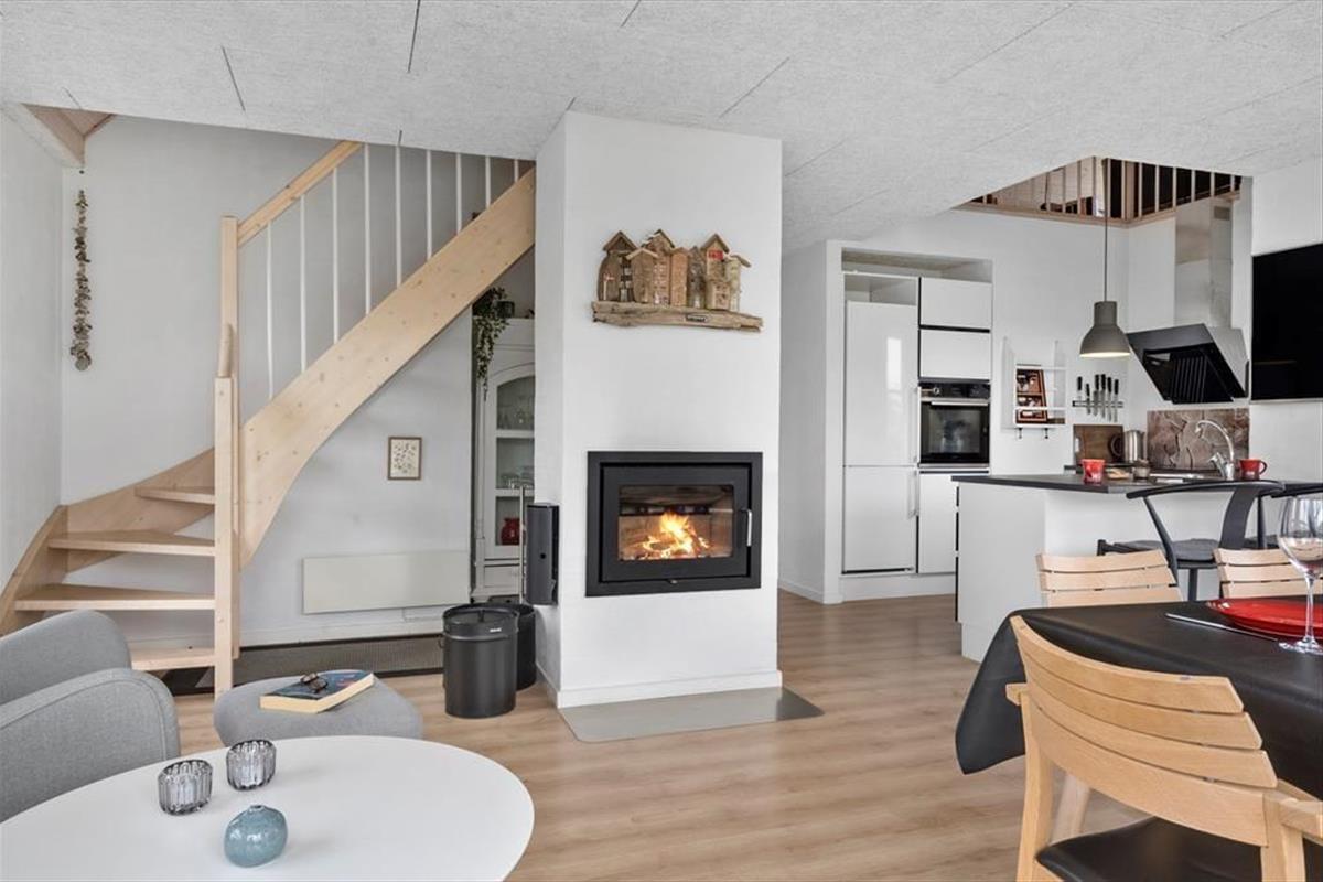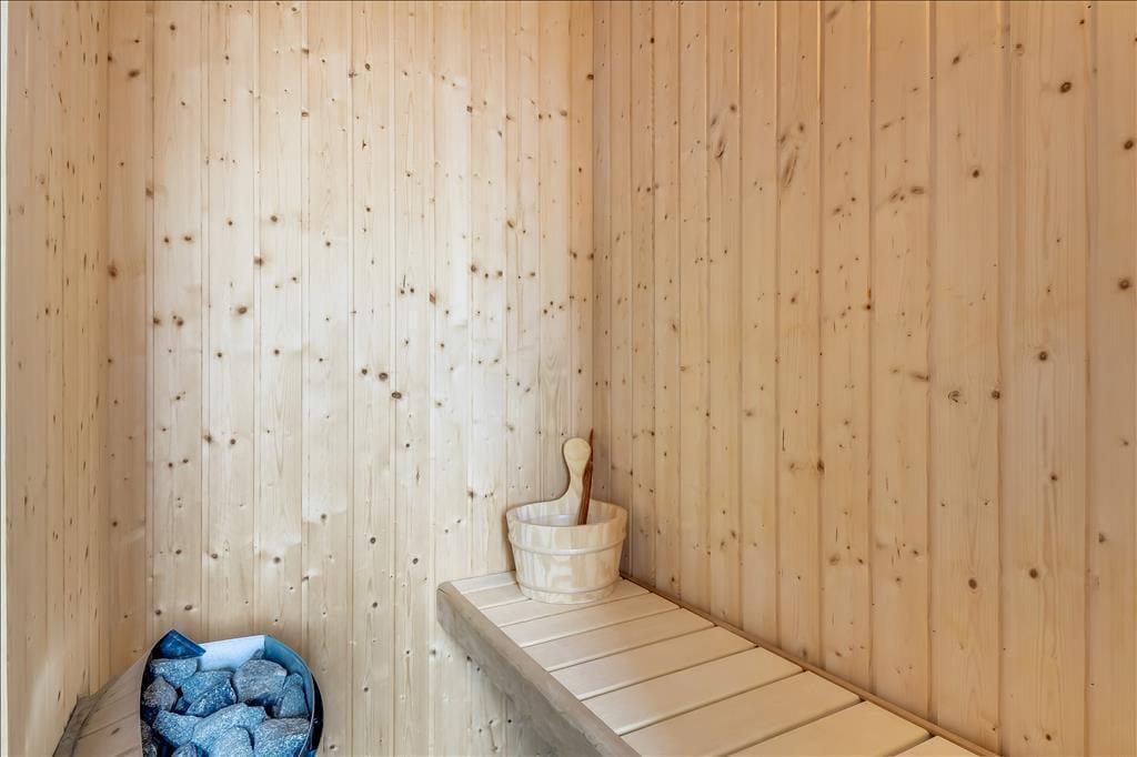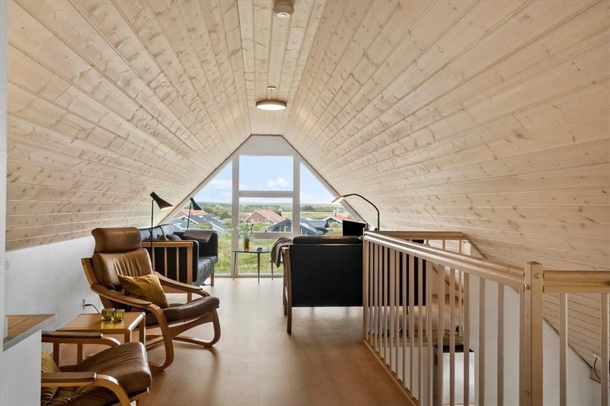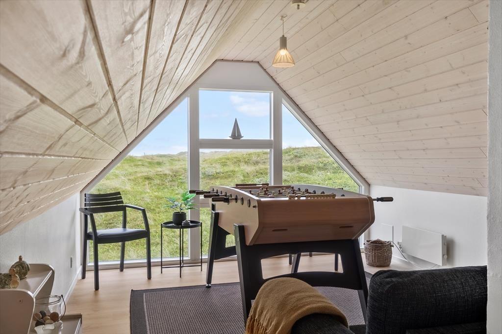 The holiday home is spread across two floors, and from the moment you step inside, you’ll notice the warm and thoughtfully designed interior. On the ground floor, the living room features a wood-burning stove and large windows that invite in natural light, creating a calm and welcoming space for family gatherings. From here, there’s direct access to the terrace, making it easy to move between indoor and outdoor living. The spa and sauna are also located on the ground floor and offer the perfect opportunity to indulge – especially after a brisk walk by the sea. Upstairs, you’ll find a bright and inviting communal space with a cosy sofa corner and a table football game, perfect for fun, laughter, and relaxed moments together. The interior exudes quality, and no matter the season, it's easy to unwind and enjoy a slower pace of life here.