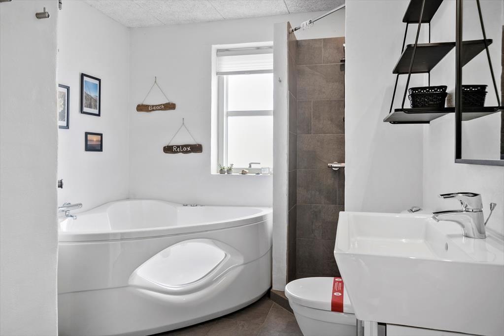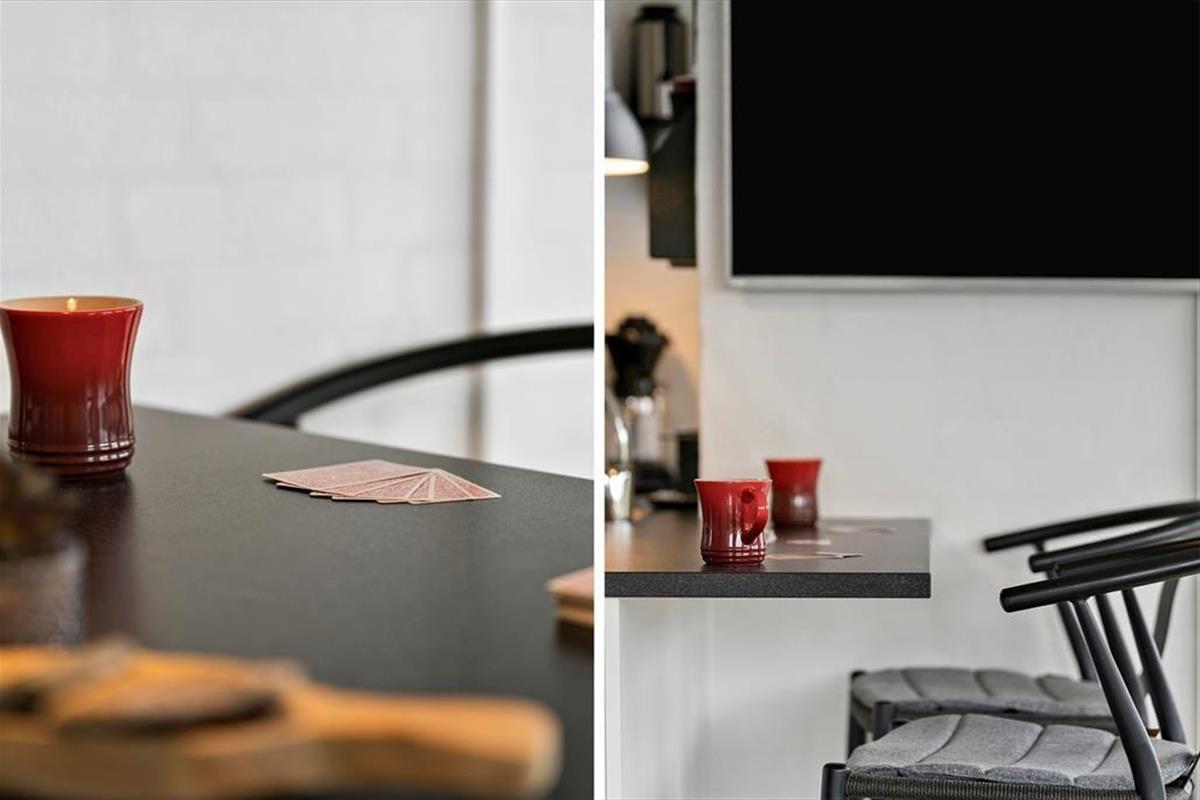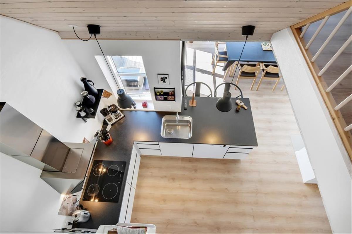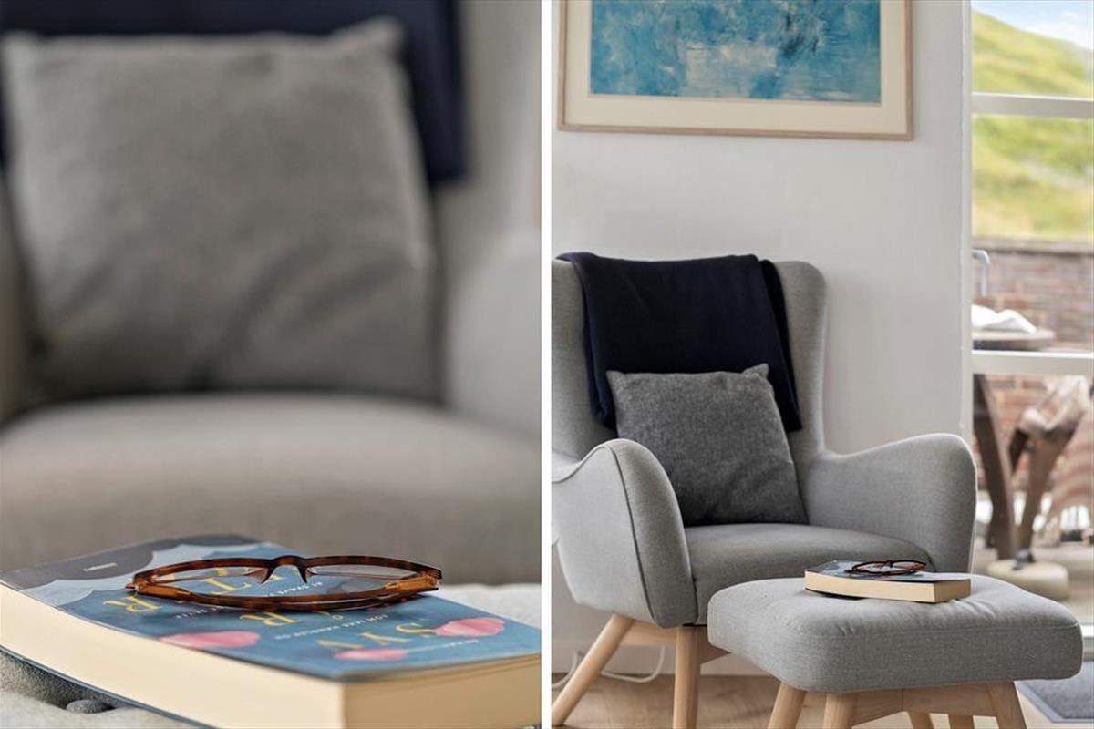 The holiday home is spread across two floors, and from the moment you step inside, you’ll notice the warm and thoughtfully designed interior. On the ground floor, the living room features a wood-burning stove and large windows that invite in natural light, creating a calm and welcoming space for family gatherings. From here, there’s direct access to the terrace, making it easy to move between indoor and outdoor living. The spa and sauna are also located on the ground floor and offer the perfect opportunity to indulge – especially after a brisk walk by the sea. Upstairs, you’ll find a bright and inviting communal space with a cosy sofa corner and a table football game, perfect for fun, laughter, and relaxed moments together. The interior exudes quality, and no matter the season, it's easy to unwind and enjoy a slower pace of life here.