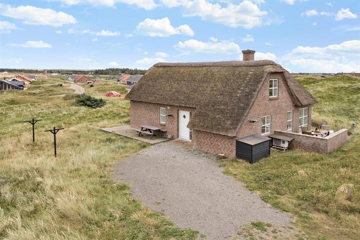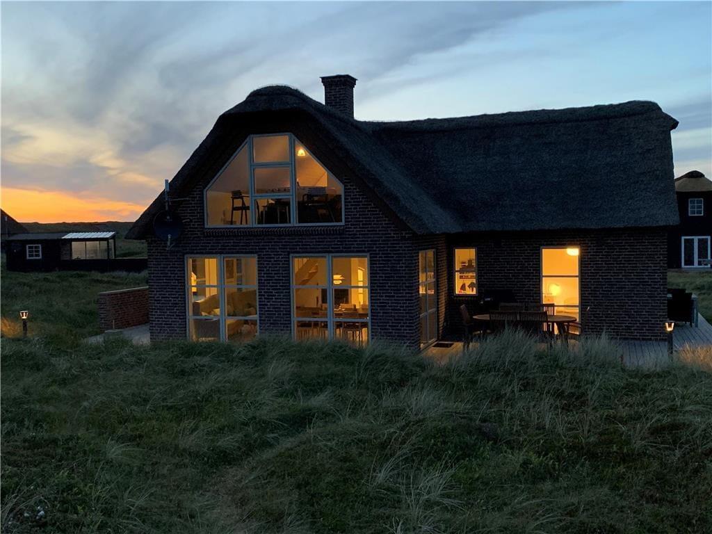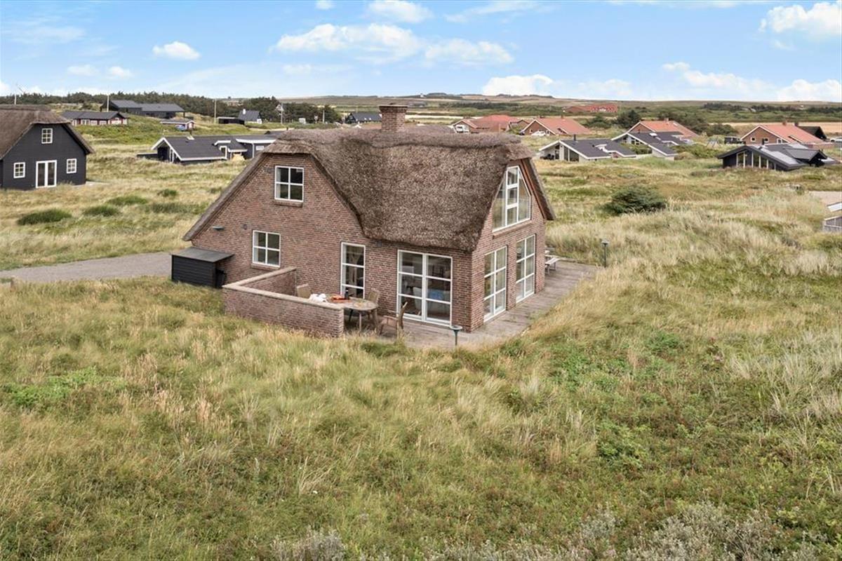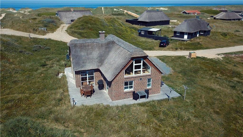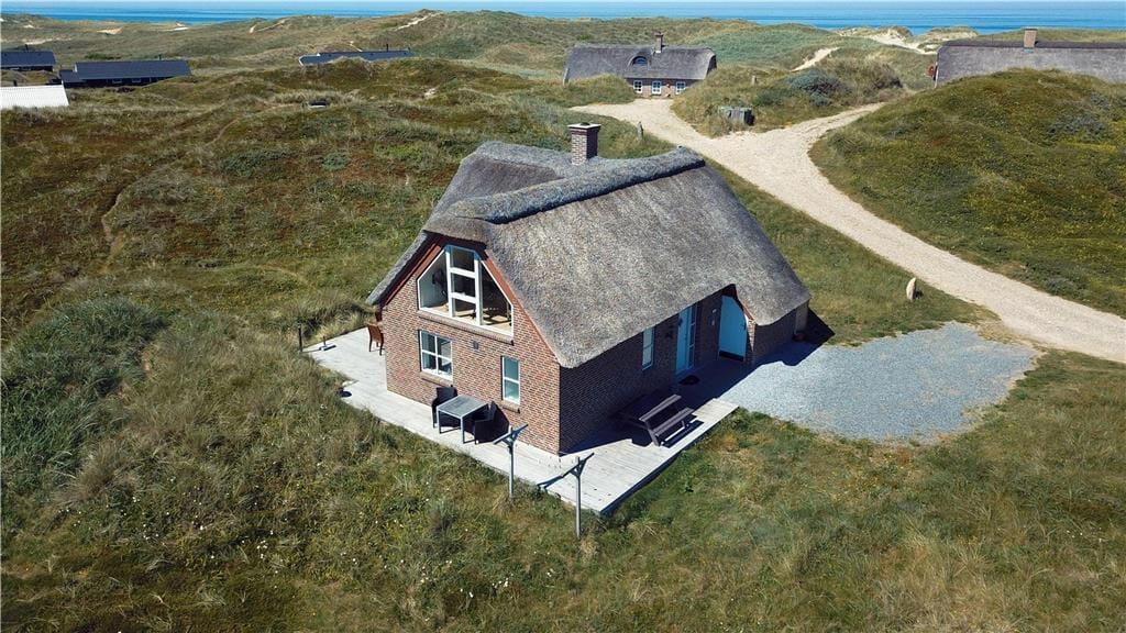 If you dream of a holiday in the heart of the wild dune landscape, where natural beauty and comfort go hand in hand, then the holiday home at Doblervej 83 in Vejlby Klit is the perfect choice. This beautifully designed thatched cottage sits on a large natural plot in the front row of dunes with views of the surrounding landscape. An indoor spa, sauna, and a cosy activity area on the first floor make it ideal for both relaxation and quality time – all year round.