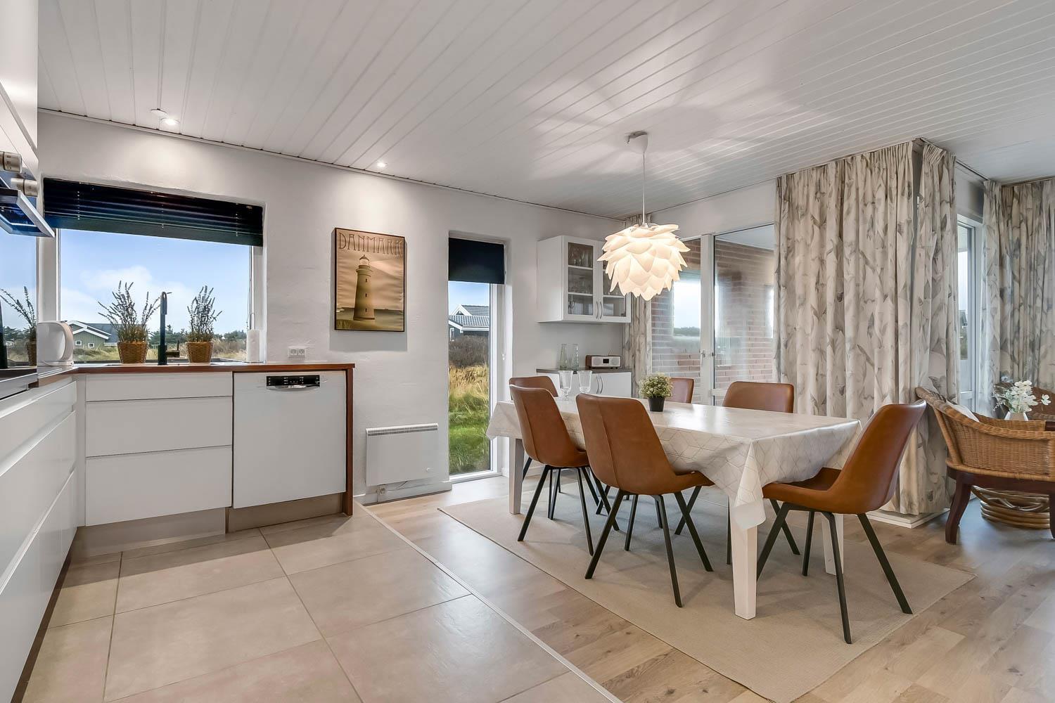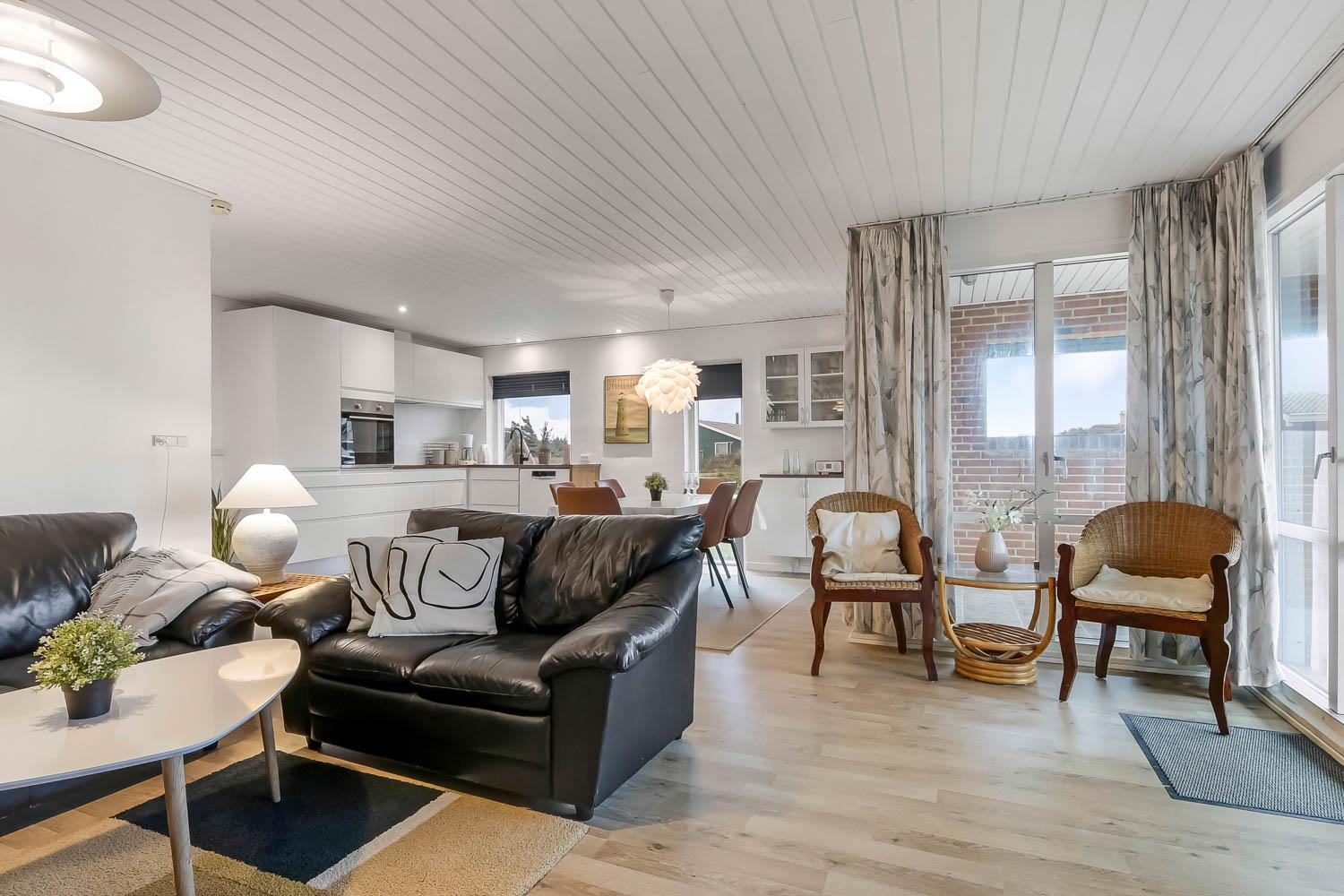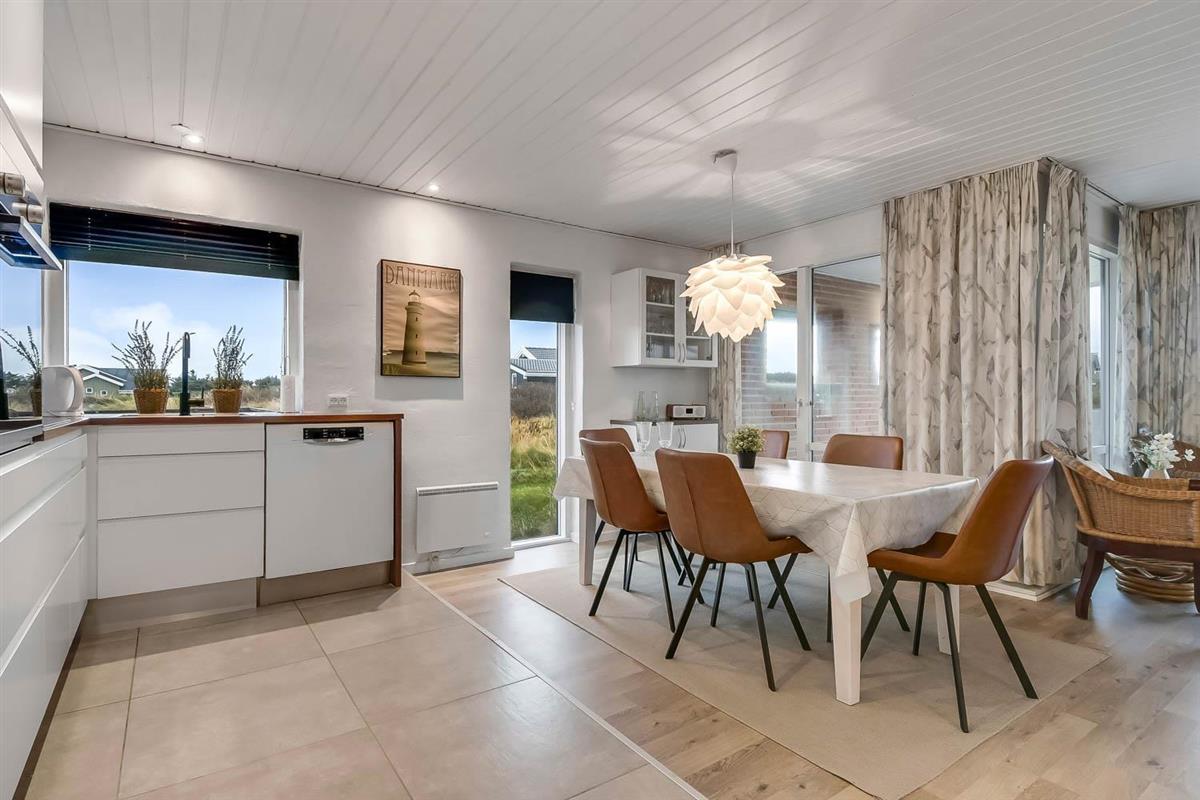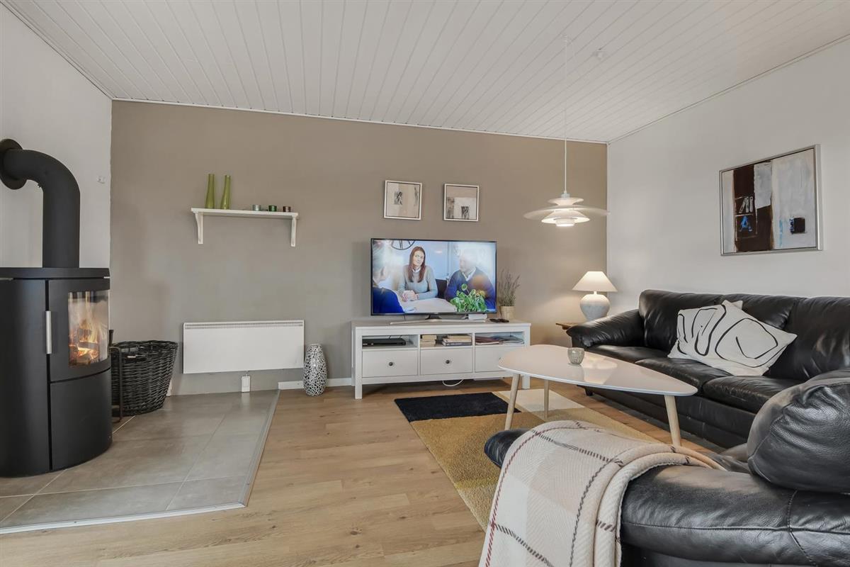 Schon wenn das Auto den Kiesweg wenige Meter vor dem Haus erreicht, sieht man schon, dass die Lage des Hauses toll ist. Ein schöner Flur heißt Sie willkommen und führt Sie direkt in einen Flur, von dem Sie Zugang zu 3 Schlafräumen und Badezimmer haben. Schöne, moderne Küchenecke. Die Küche hat alles, was man braucht, und ist mit Ceranfeld Kochplatten, eingebautem Ofen, Abzugshaube, Mikrowelle, Kühlschrank mit Gefrierfach und Geschirrspüler ausgestattet. Von der Küche führt eine Stufe hinunter zum Essbereich mit Esstisch und Stühlen. Der Wohnraum hat schöne Ledermöbel und von hier aus können Sie dänische und deutsche Programme auf dem an der Wand hängenden Flachbild-TV sehen. Ein schöner Brennofen, der für eine gute Wärme sorgt, egal zu welcher Jahreszeit. 3 Schlafräume: 1DB + 2B + 2B. Das Badezimmer ist mit Toilette, Waschbecken, Dusche und Fußbodenheizung. Das ganze Haus ist mit einem Holzboden ausgestattet. Nichtraucher-Haus. Haustiere sind nicht erlaubt.