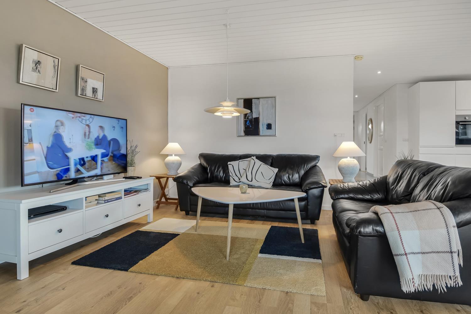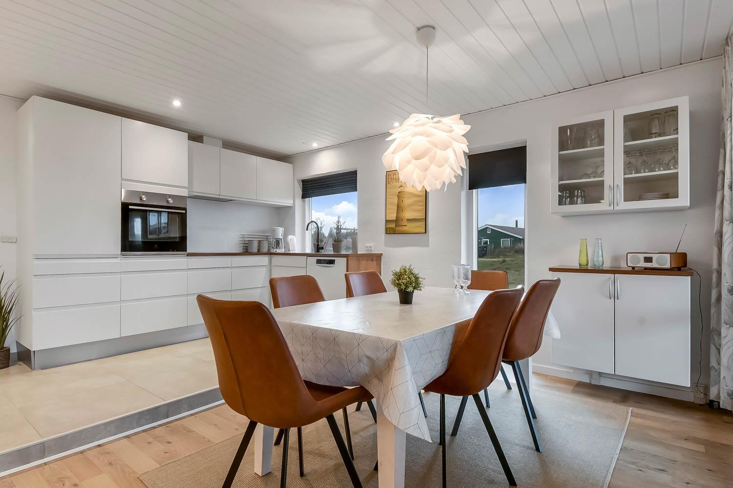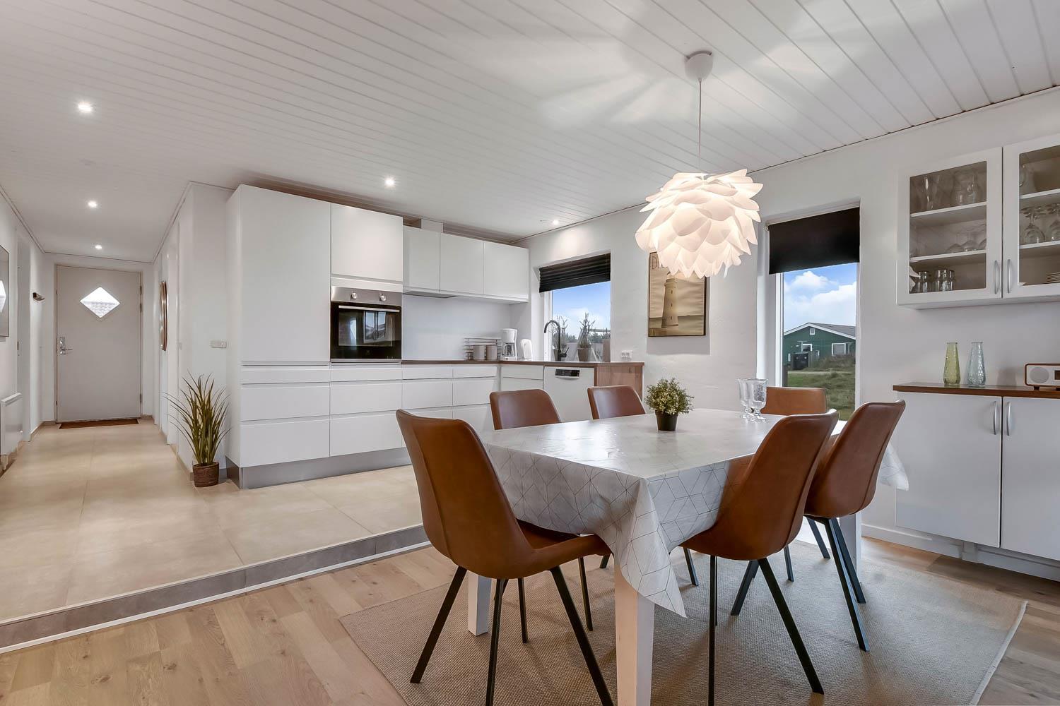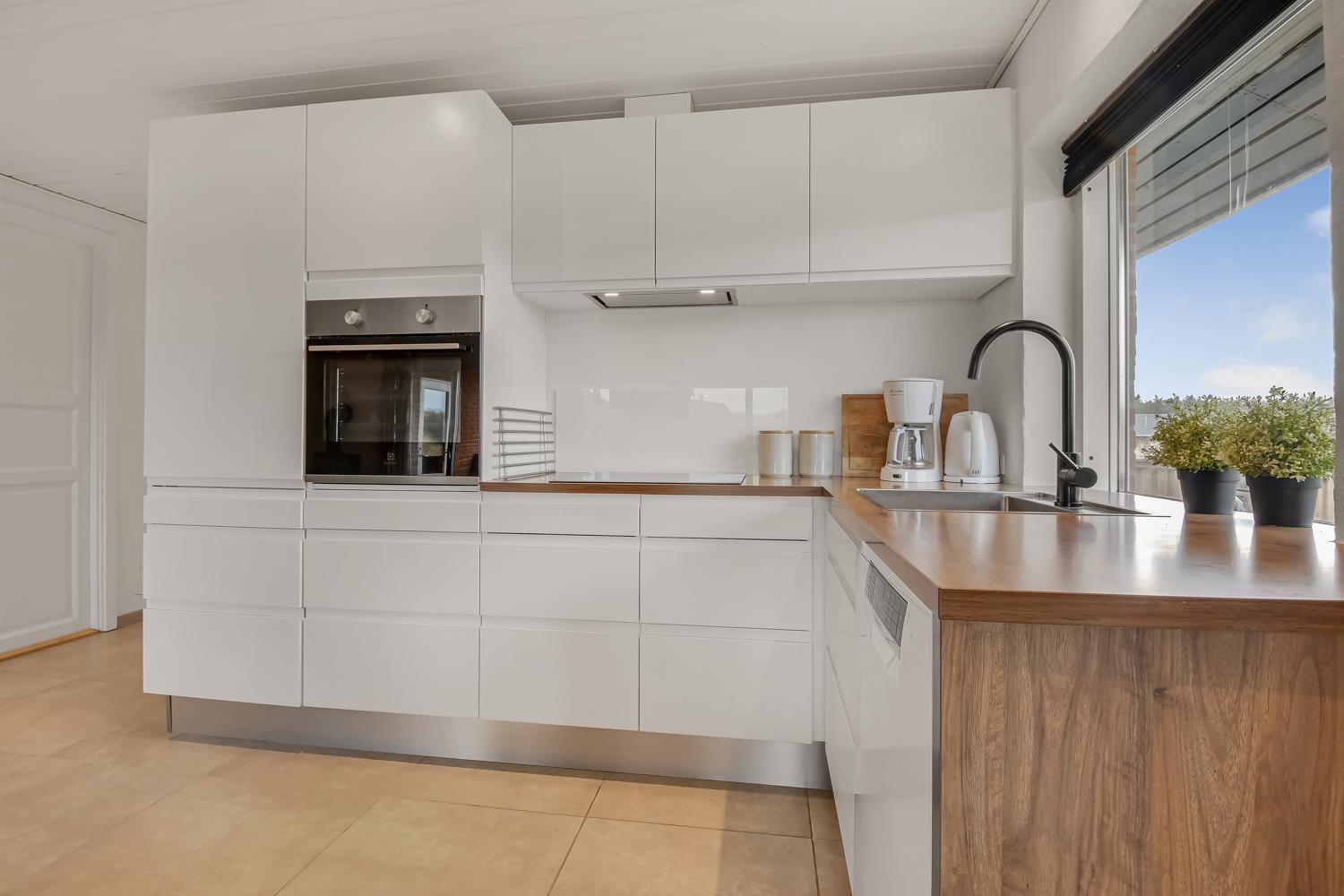 Schon wenn das Auto den Kiesweg wenige Meter vor dem Haus erreicht, sieht man schon, dass die Lage des Hauses toll ist. Ein schöner Flur heißt Sie willkommen und führt Sie direkt in einen Flur, von dem Sie Zugang zu 3 Schlafräumen und Badezimmer haben. Schöne, moderne Küchenecke. Die Küche hat alles, was man braucht, und ist mit Ceranfeld Kochplatten, eingebautem Ofen, Abzugshaube, Mikrowelle, Kühlschrank mit Gefrierfach und Geschirrspüler ausgestattet. Von der Küche führt eine Stufe hinunter zum Essbereich mit Esstisch und Stühlen. Der Wohnraum hat schöne Ledermöbel und von hier aus können Sie dänische und deutsche Programme auf dem an der Wand hängenden Flachbild-TV sehen. Ein schöner Brennofen, der für eine gute Wärme sorgt, egal zu welcher Jahreszeit. 3 Schlafräume: 1DB + 2B + 2B. Das Badezimmer ist mit Toilette, Waschbecken, Dusche und Fußbodenheizung. Das ganze Haus ist mit einem Holzboden ausgestattet. Nichtraucher-Haus. Haustiere sind nicht erlaubt.