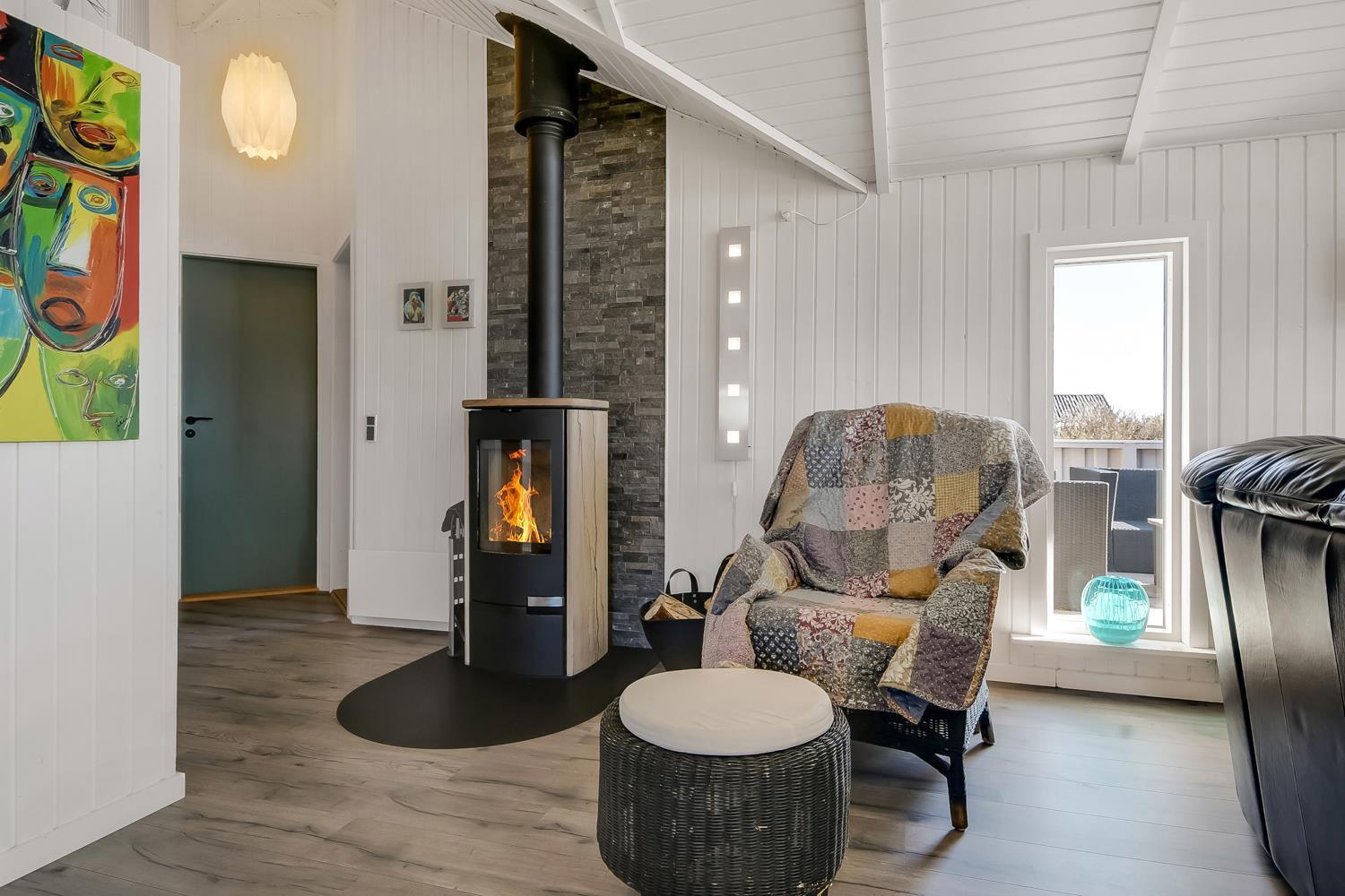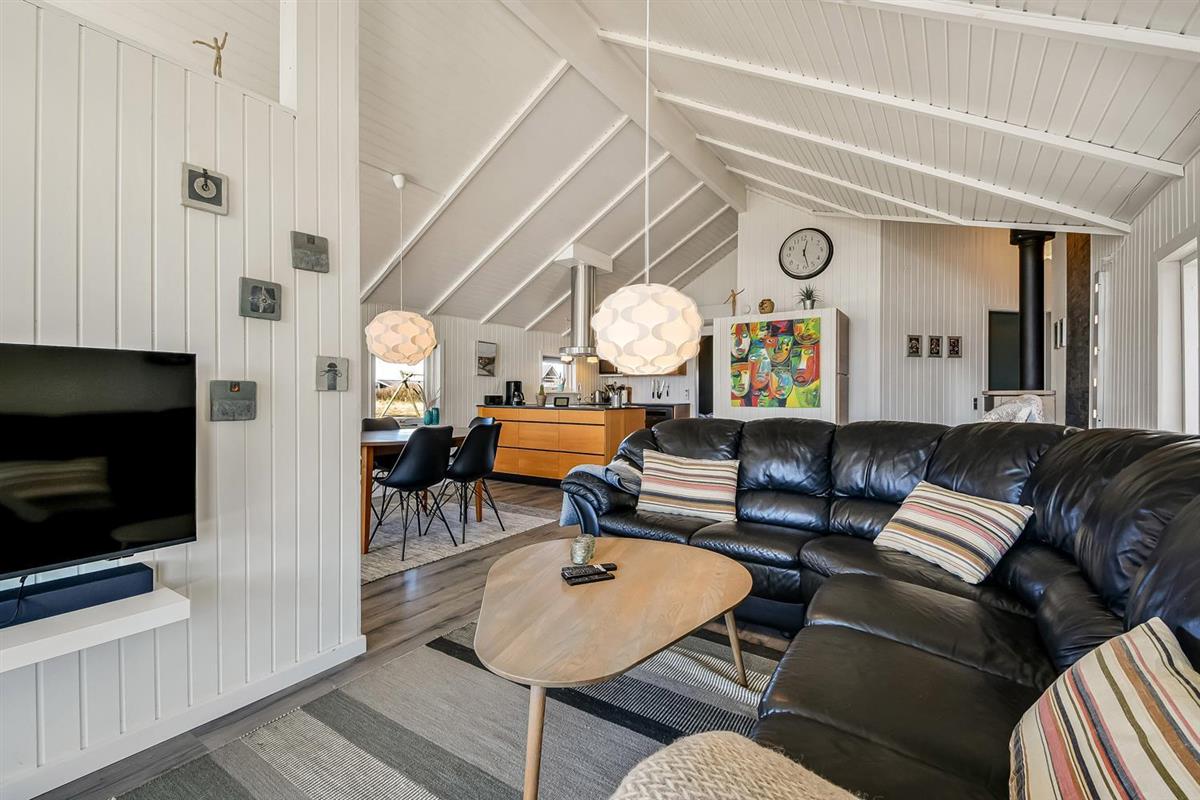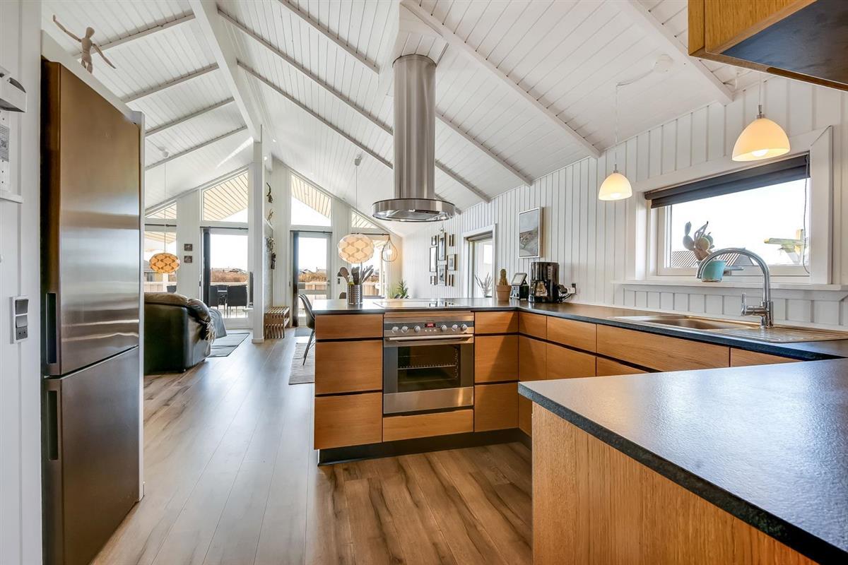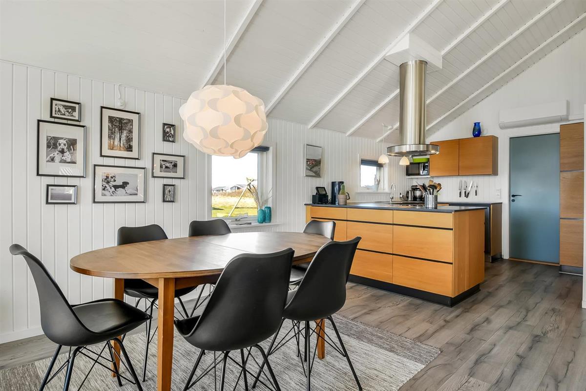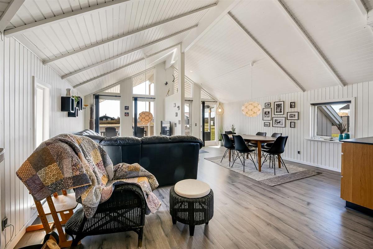 Sehr schönes, neu renoviertes und sehr gepflegtes Ferienhaus aus Holz mit kombinierter Küche/Wohnraum und mit offener Decke. Das Haus ist in hellen Farben gehalten und zusammen mit der großen Fensterpartie gibt es einen guten Lichteinfall. Der Wohnraum ist mit guten Ledermöbeln und einem Esstisch eingerichtet und außerdem gibt es F-TV mit DR-Kanälen und deutschen Kanälen über eine Parabolantenne und Radio. Außerdem gibt es einen ganz neuen Brennofen, der zusammen mit der Wärmepumpe für eine angenehme und gute Wärme sorgt, egal zu welcher Jahreszeit. Die Nebenkosten lassen sich so niedriger halten. Offene Küche mit E-Herd mit Ceranfeld-Kochplatte, Abzugshaube, Kühlschrank mit Gefrierfach, Geschirrspüler. Im Wohnraum und der Küche gibt es Linoleumfußboden. Großes und ganz neu renoviertes Badezimmer mit Toilette, Waschbecken, Dusche und Infra-Rot Saunakabine. 3 schöne Schlafräume: 1DB + 1DB + 1DB. Für die kleinsten Gästen gibt es einen Kinderstuhl. Es gibt natürlich auch eine Waschmaschine und einen Trockner im Haus. 2 Haustiere sind erlaubt. Nichtraucher-Haus.