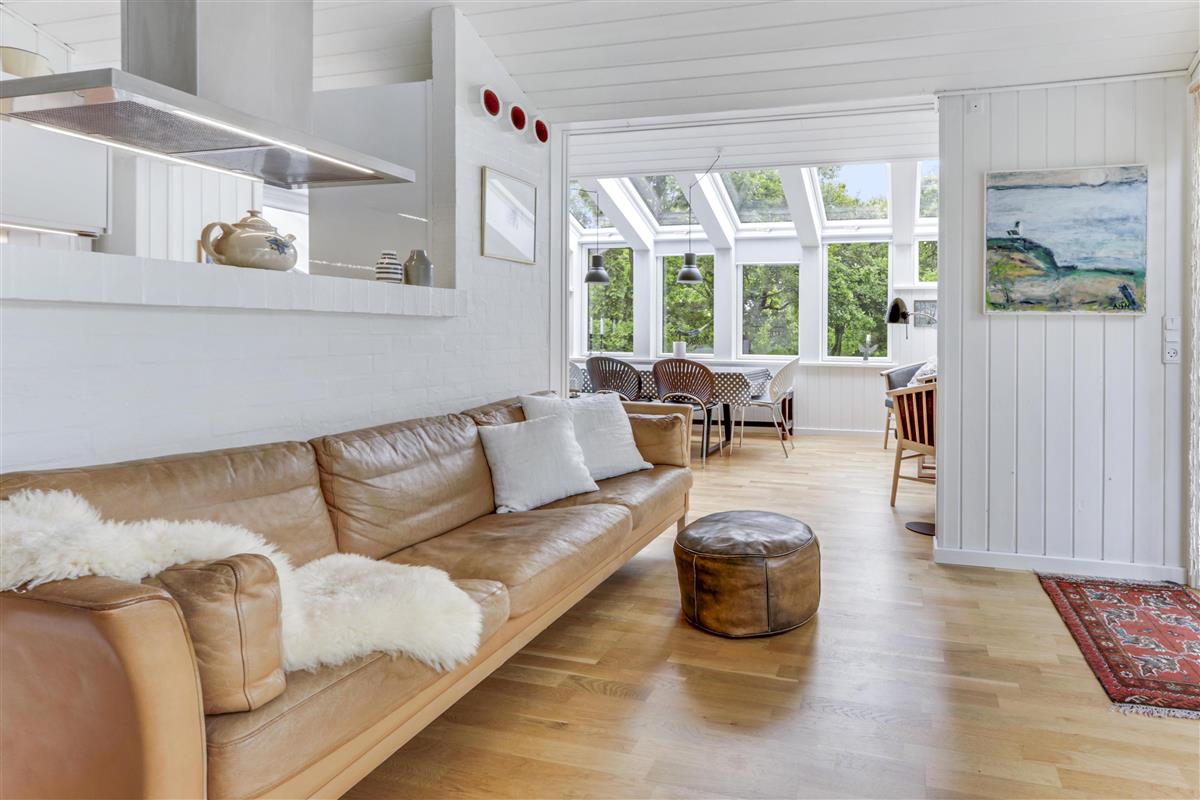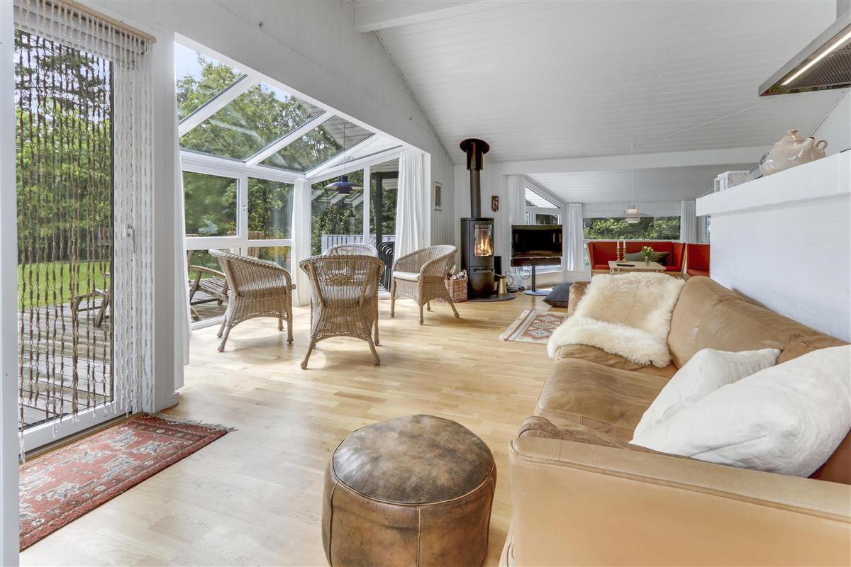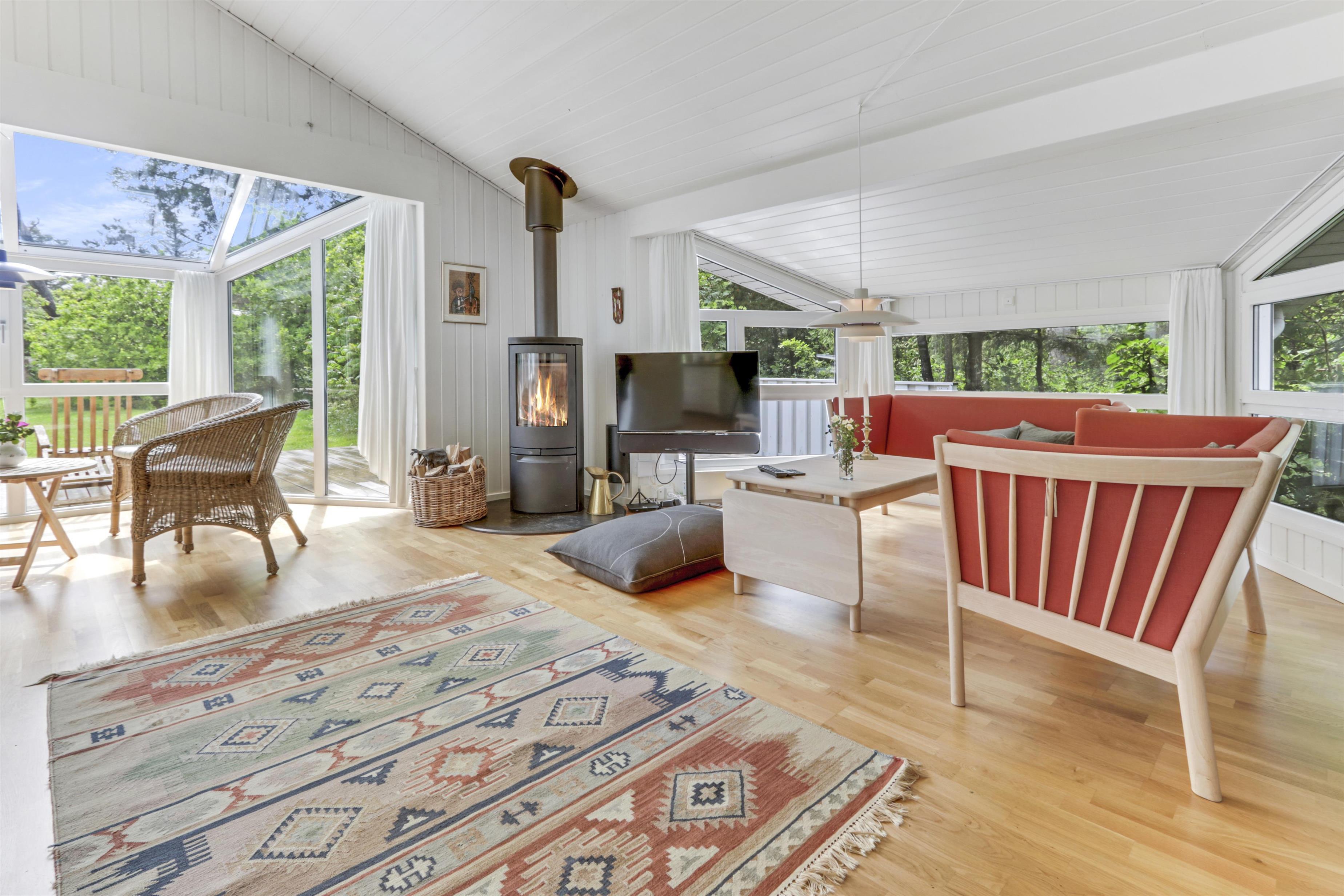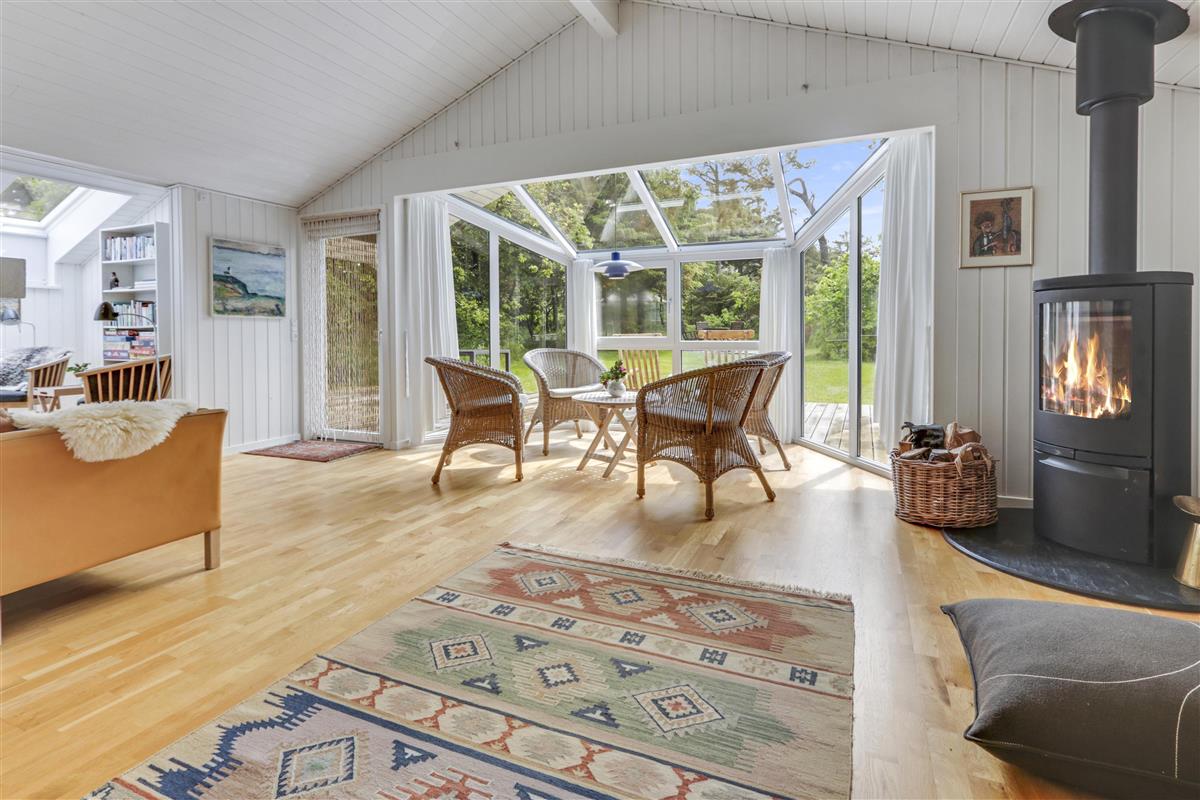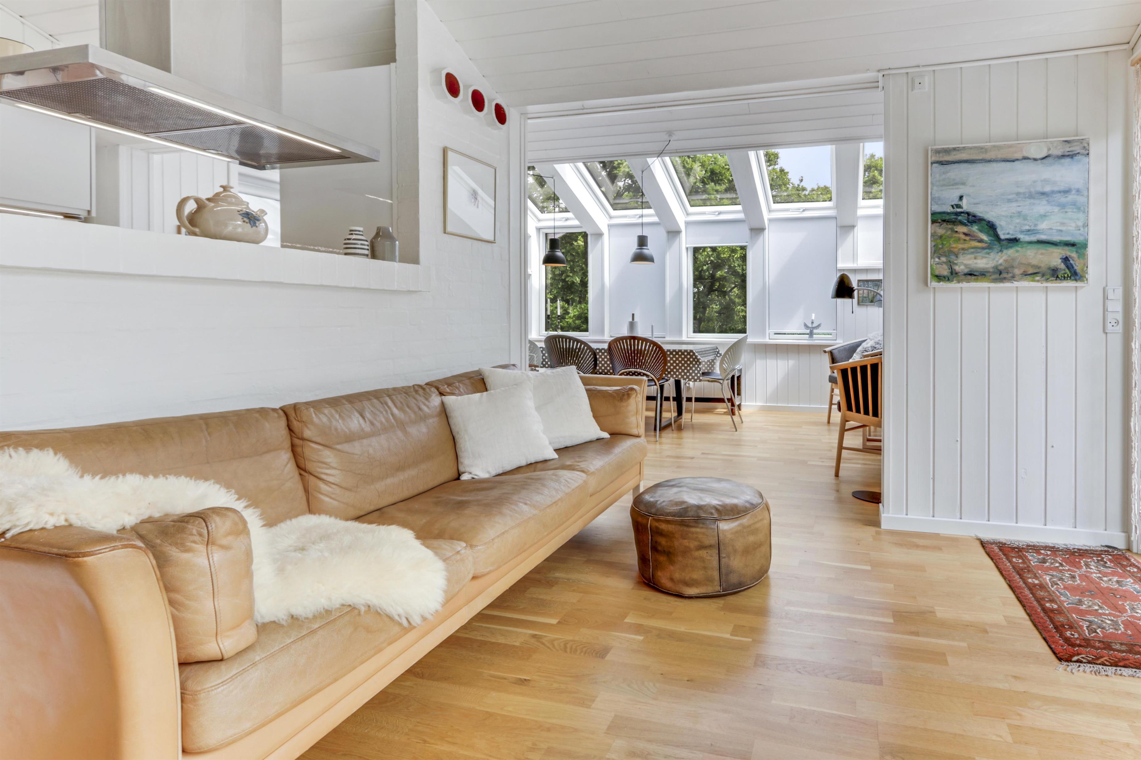 Das helle und freundliche Wohnzimmer lädt mit komfortablen Leder- und Polstermöbeln, einem knisternden Kaminofen und einem Fernseher mit dänischen und deutschen Programmen zum Entspannen ein. Eine effiziente Wärmepumpe sorgt das ganze Jahr über für ein angenehmes Raumklima.