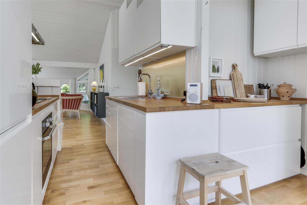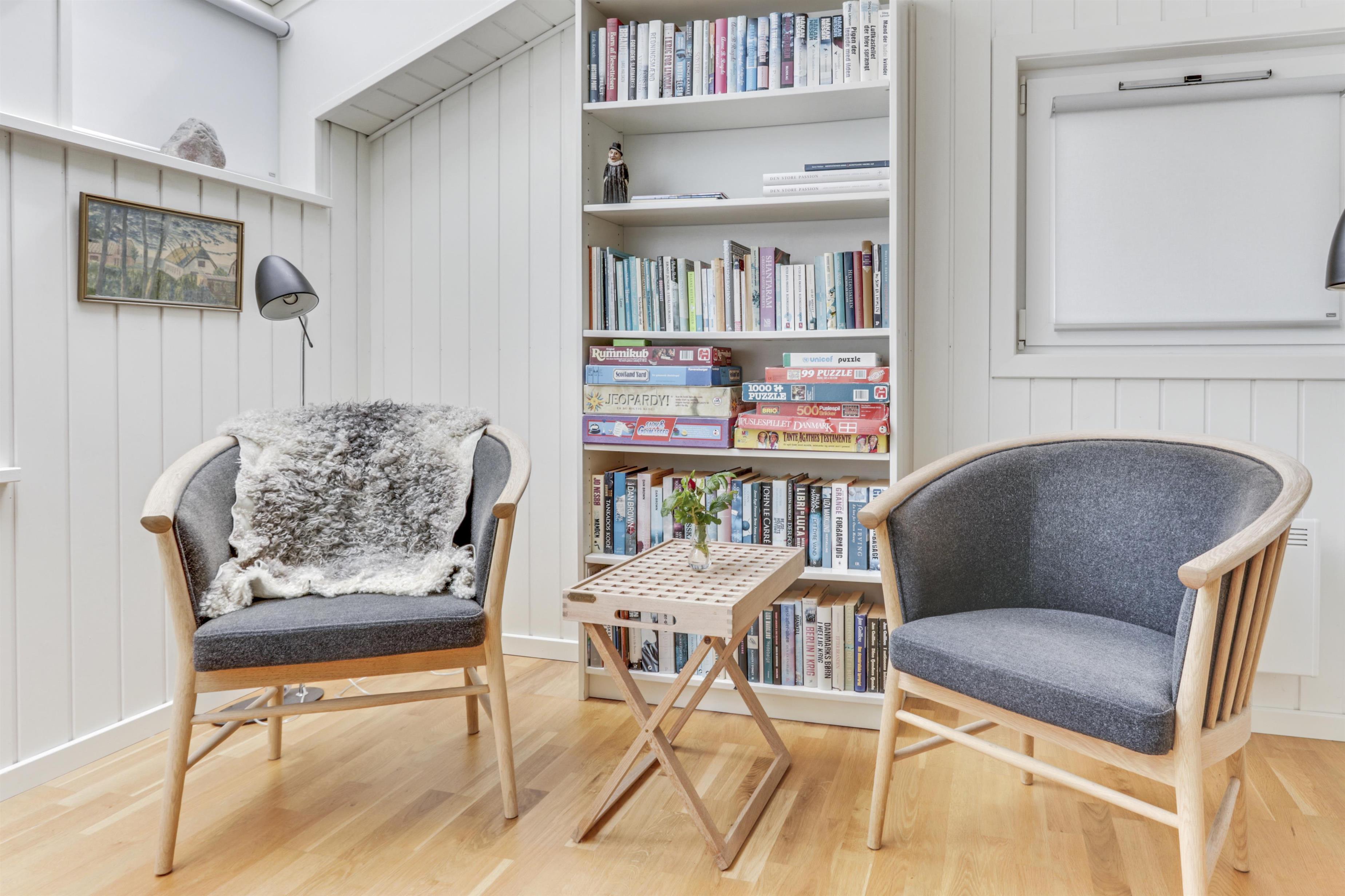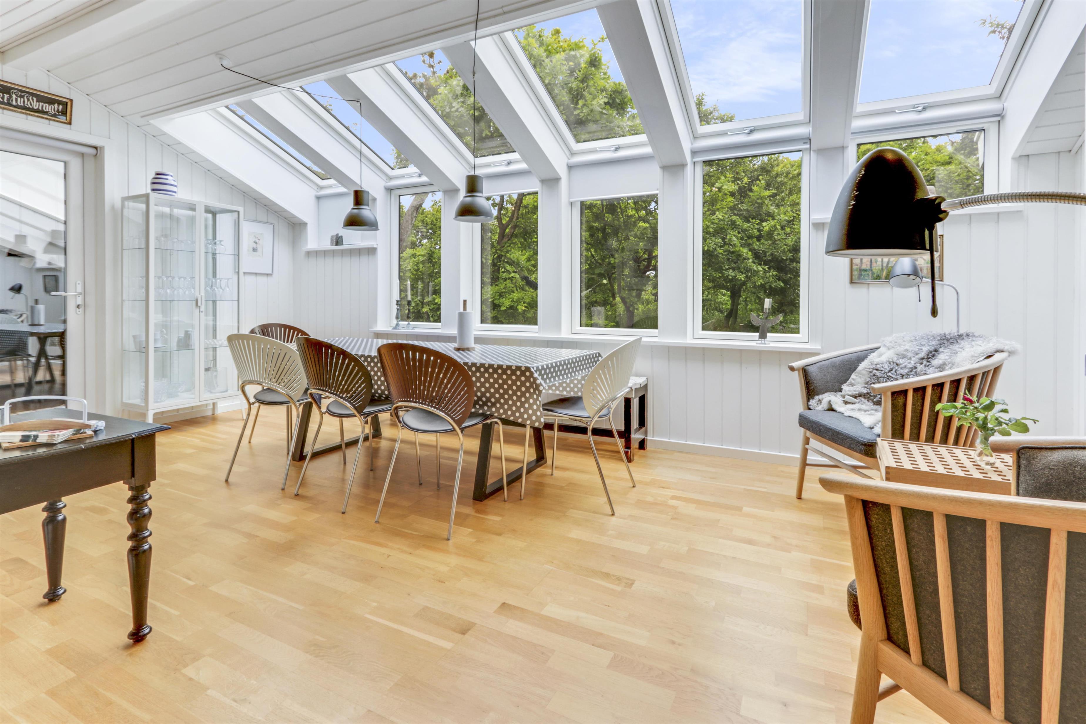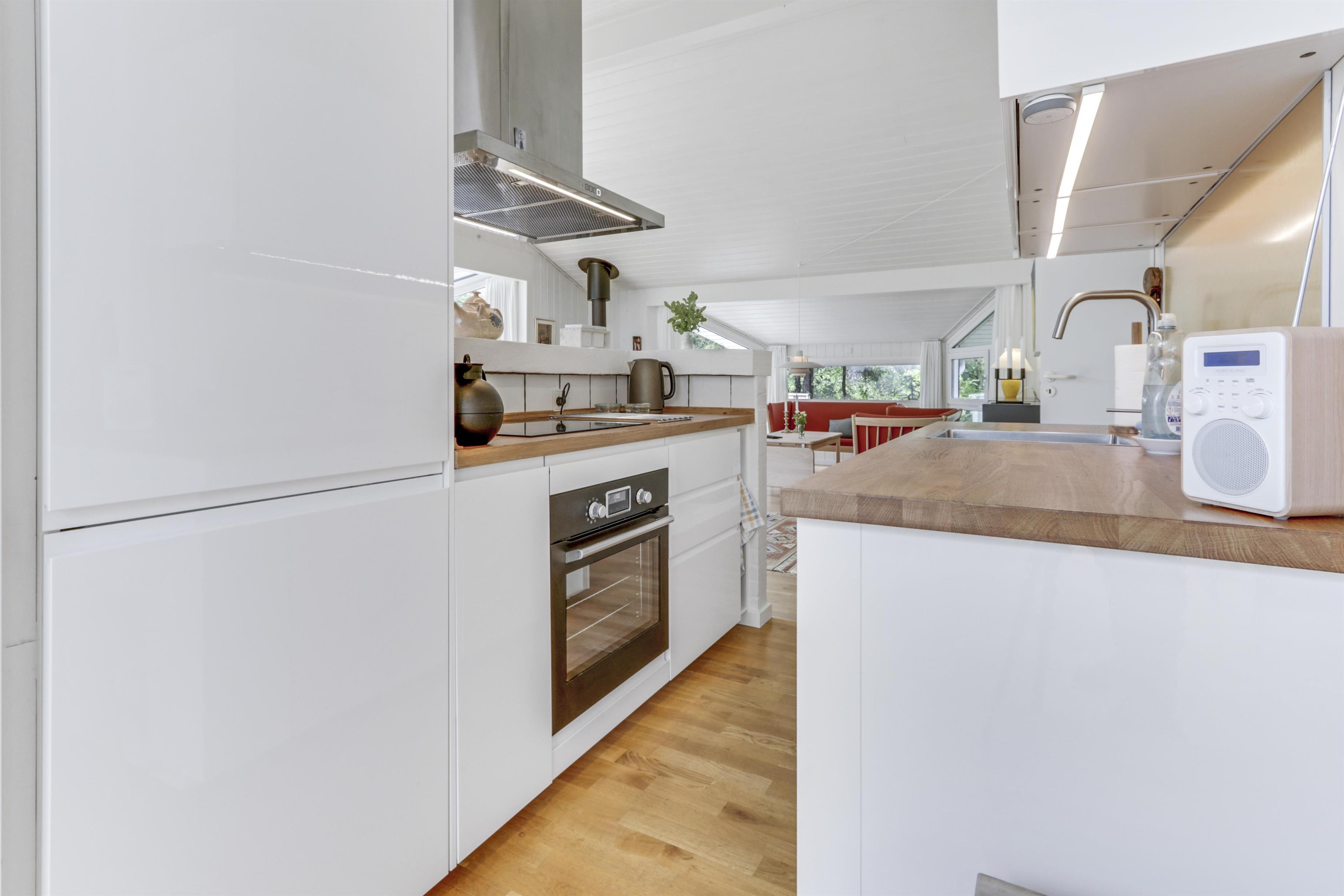Das helle und freundliche Wohnzimmer lädt mit komfortablen Leder- und Polstermöbeln, einem knisternden Kaminofen und einem Fernseher mit dänischen und deutschen Programmen zum Entspannen ein. Eine effiziente Wärmepumpe sorgt das ganze Jahr über für ein angenehmes Raumklima.