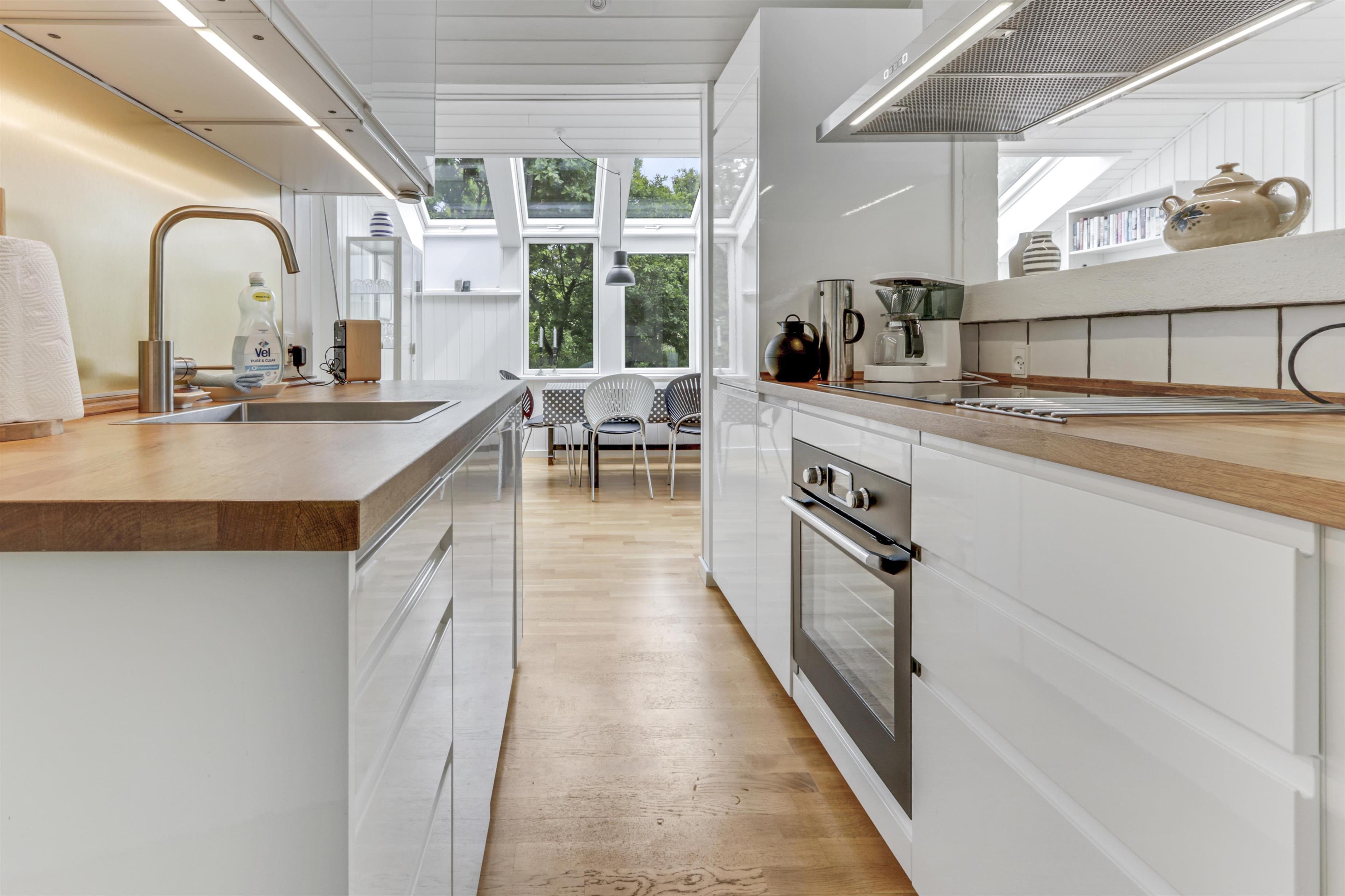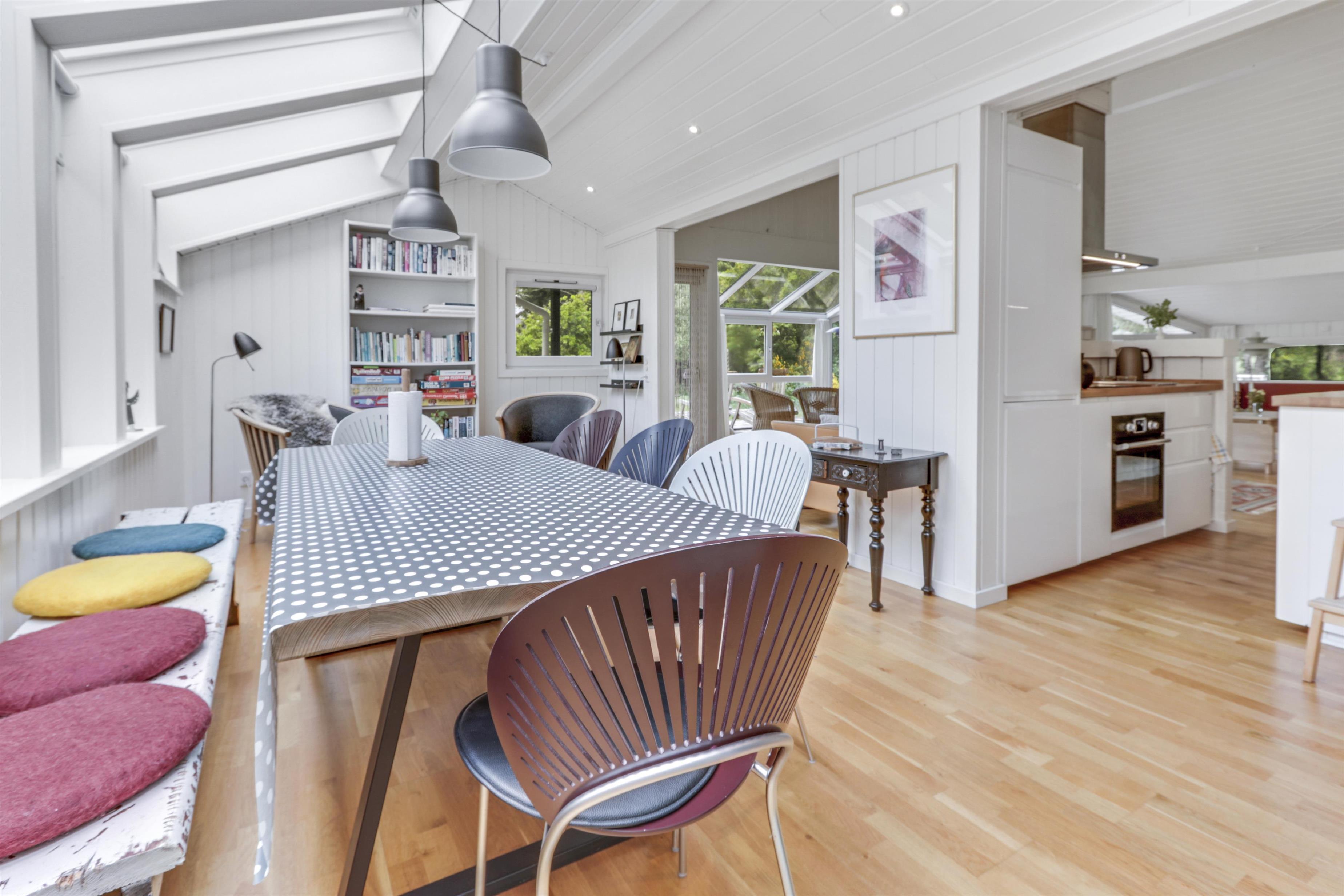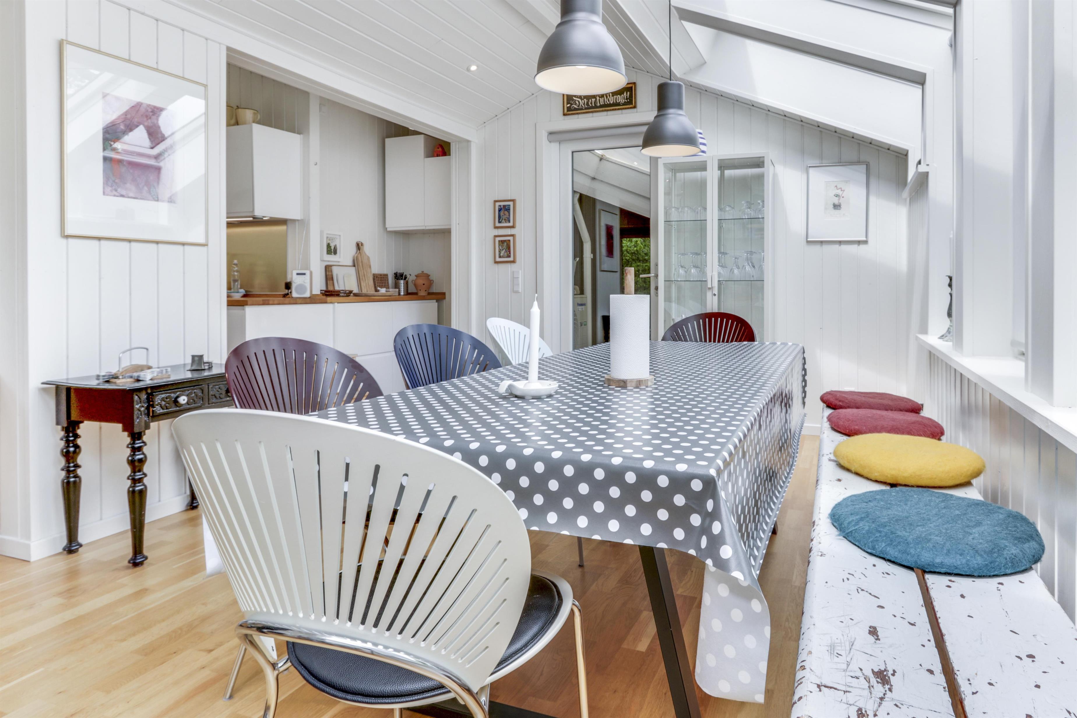 Die Küche ist vollständig ausgestattet mit allem, was Sie zur Zubereitung leckerer Mahlzeiten benötigen: Geschirrspüler, Elektro-Keramikkochfeld, Einbauofen, Kühlschrank und vieles mehr. Der Essbereich schließt sich direkt an die Küche an, sodass Sie Ihre Mahlzeiten gemeinsam in gemütlicher Atmosphäre genießen können.