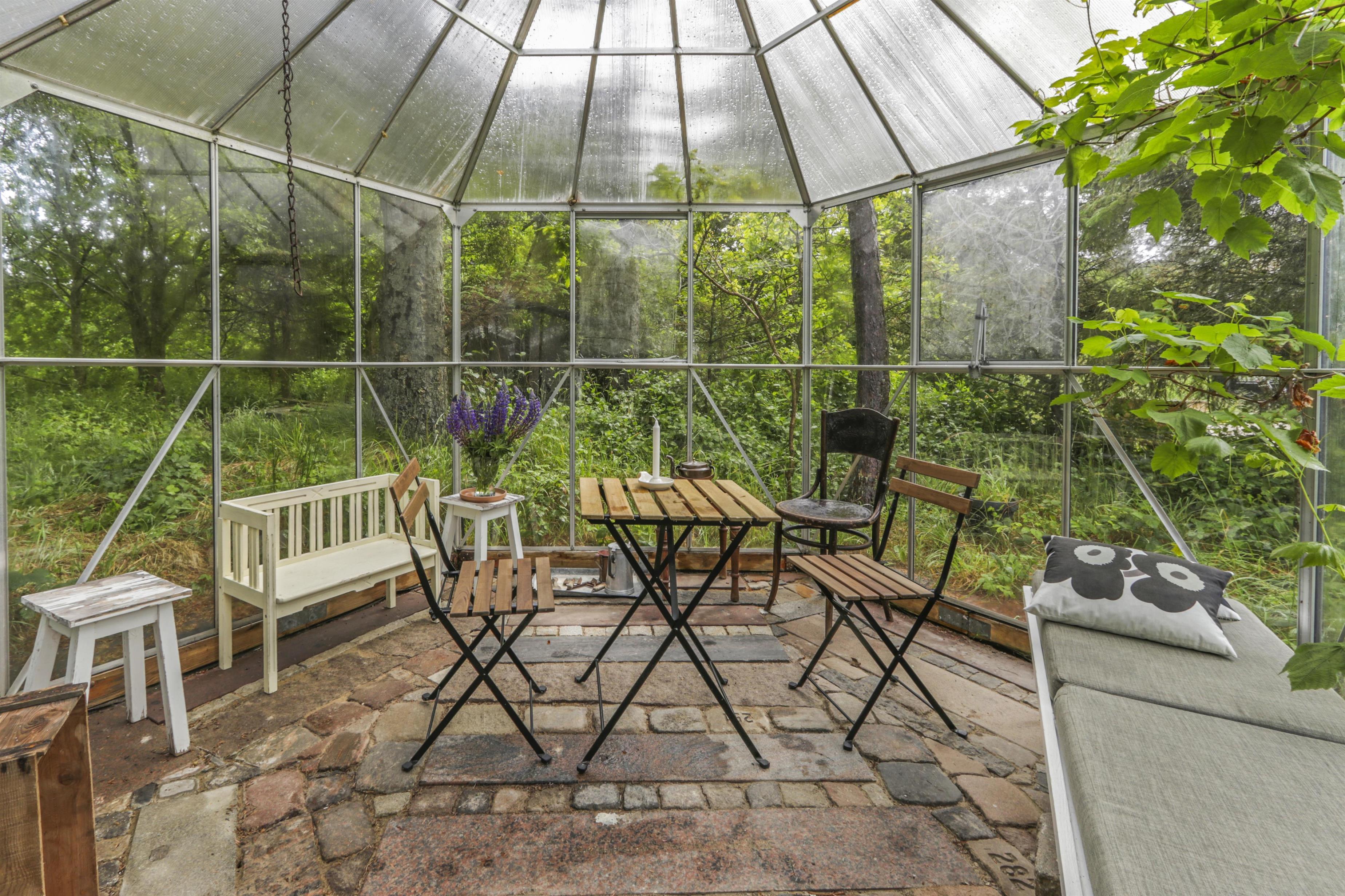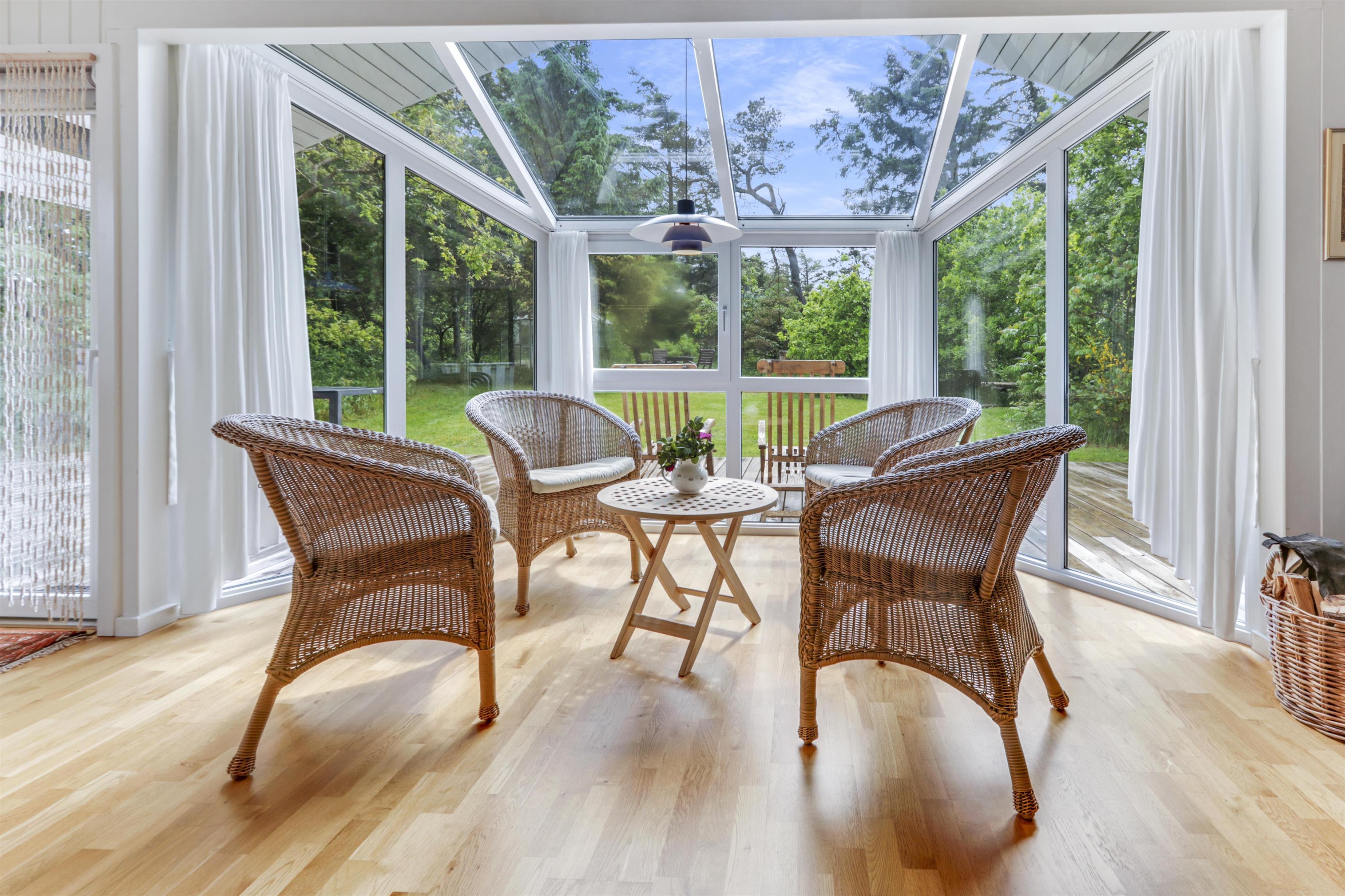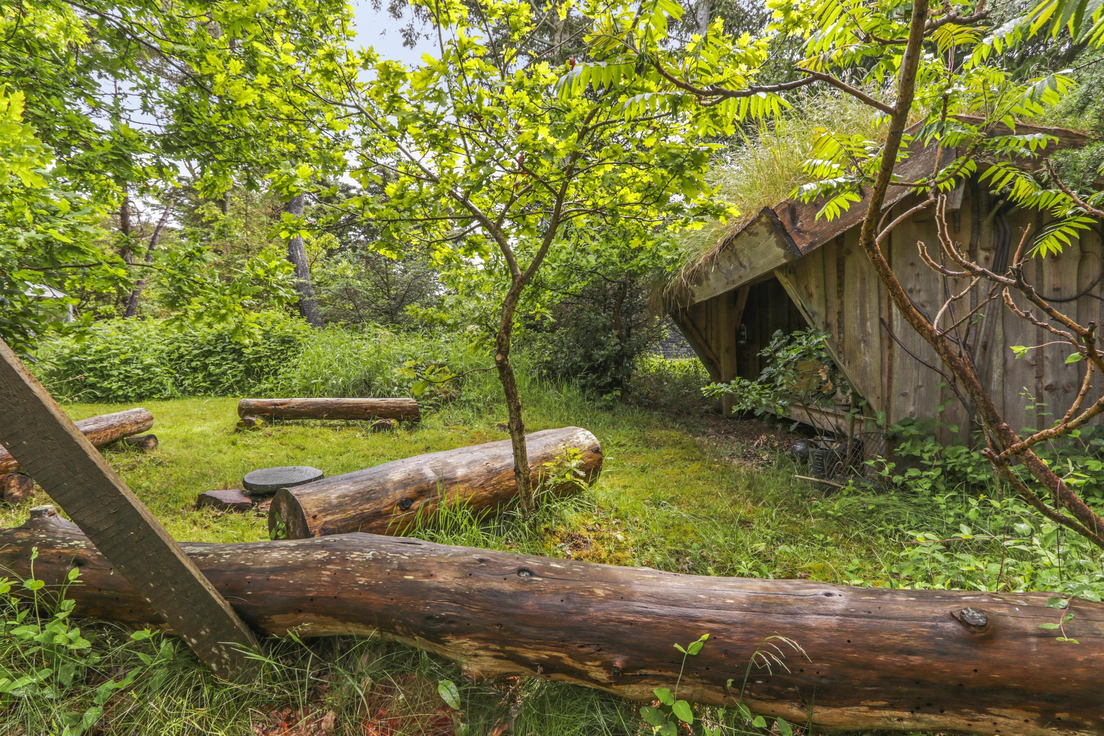 Die schöne Terrasse – teils offen, teils überdacht – bietet die Möglichkeit, den ganzen Tag die Sonne zu genießen. Mit Gartenmöbeln und Gasgrill ausgestattet, lädt sie zu Mahlzeiten im Freien und frischer Meeresluft ein. In einer Ecke des Grundstücks befindet sich eine kleine Terrasse mit einem Wintergarten, in dem Sie beinahe das ganze Jahr über das Leben im Freien genießen können. Neben kleinen Pfaden, Sonnenplätzen und einem Shelter für Übernachtungen im Freien gibt es für die kleinsten Gäste auch Schaukeln und einen Sandkasten.
