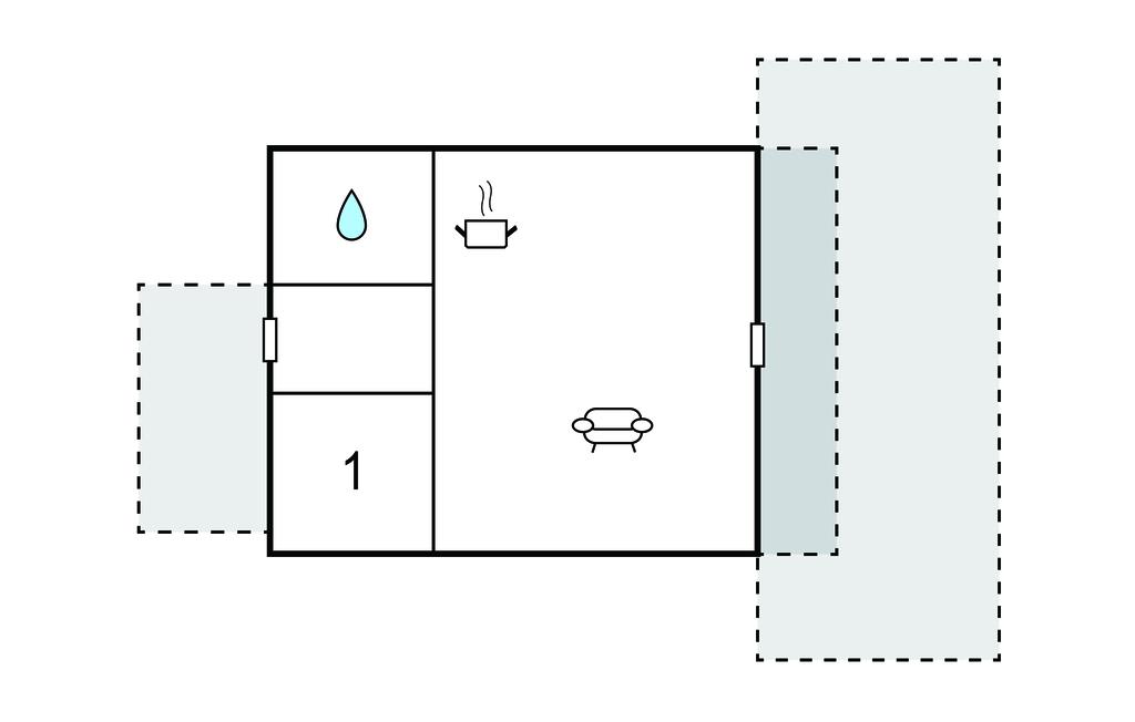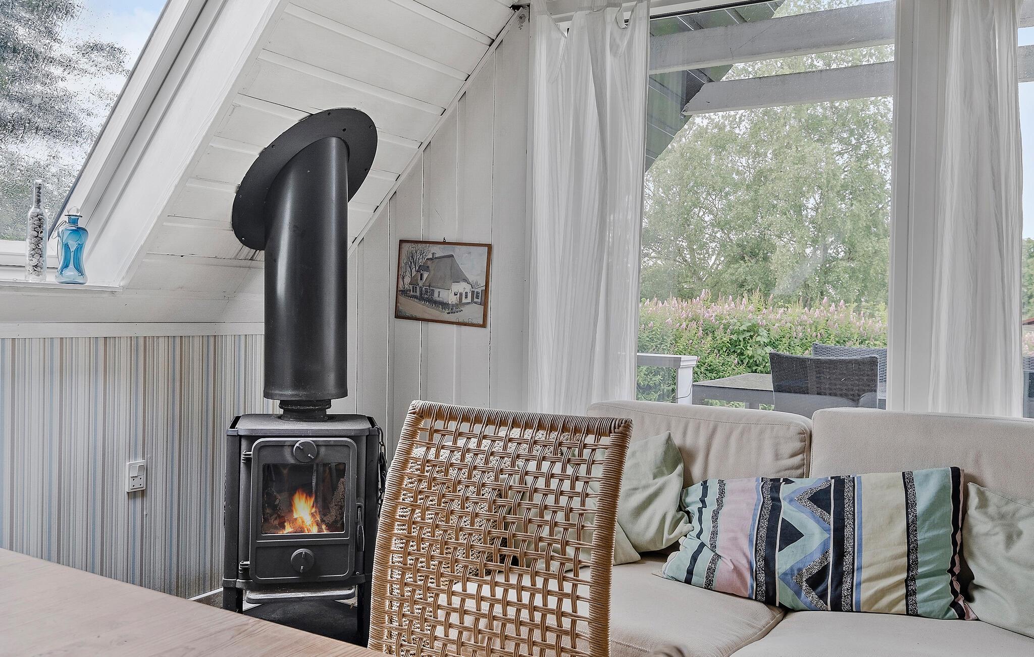 Binnen in het huis vind je een gezellige woonkamer met een comfortabele zithoek die je uitnodigt om te ontspannen. Het open ontwerp van de kamer met zichtbare balken en het grote raam aan de voorkant zorgt voor een lichte en luchtige sfeer. In de compacte keuken kun je de maaltijden van de dag bereiden, waarvan je vervolgens kunt genieten aan de mooie houten eettafel of op het terras.