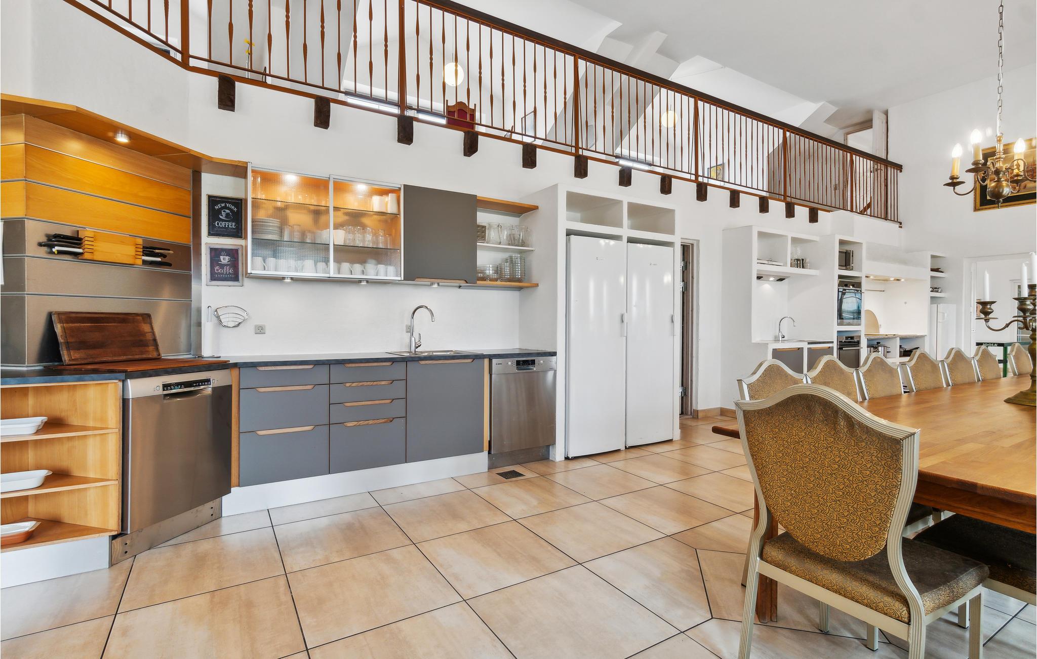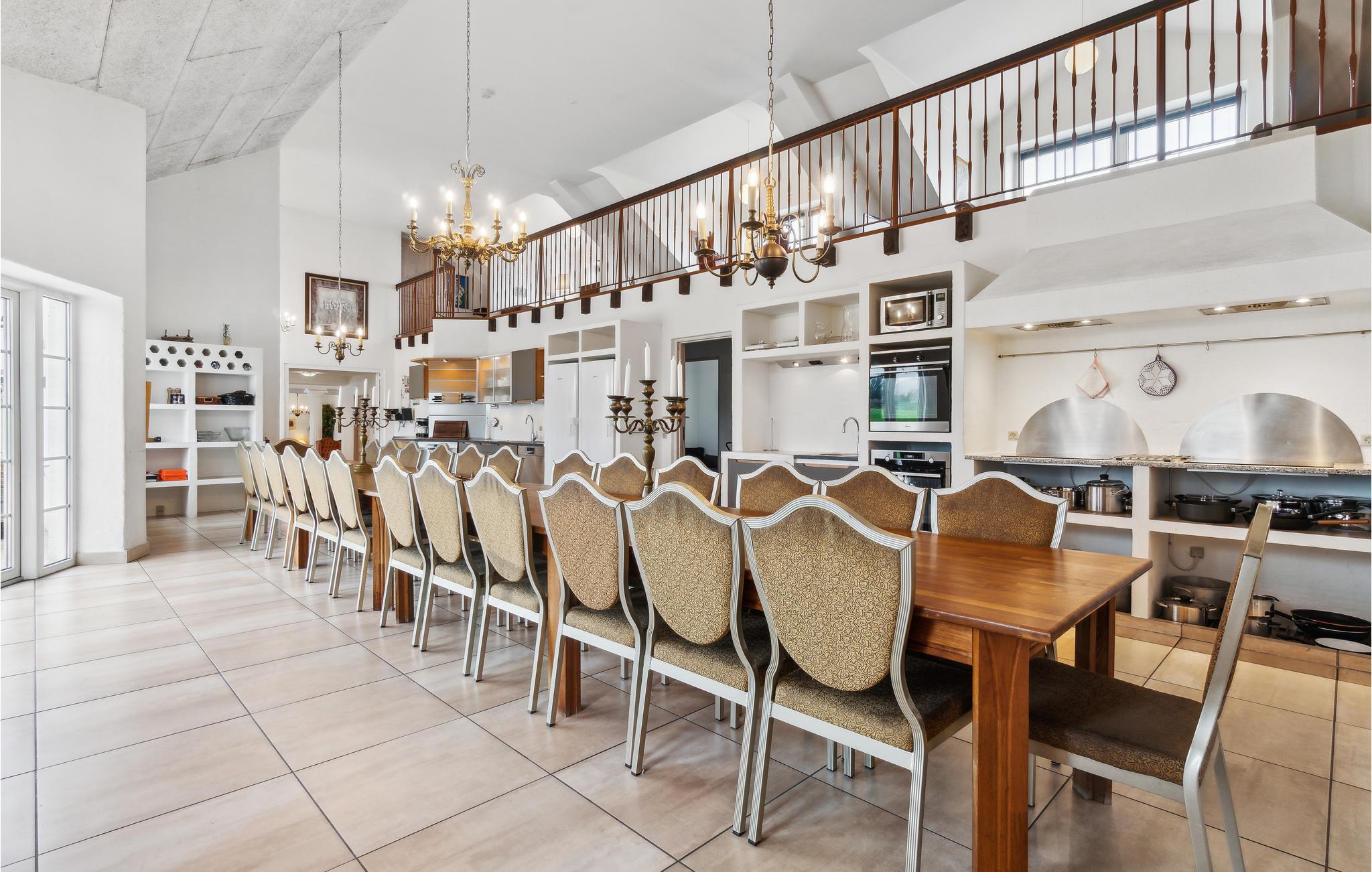 De gezellige sfeer van de eetkeuken nodigt uit tot gezellig samen eten. De keuken is functioneel uitgerust met 8 kookzones, 2 ovens, 2 koelkasten en 2 vaatwassers.