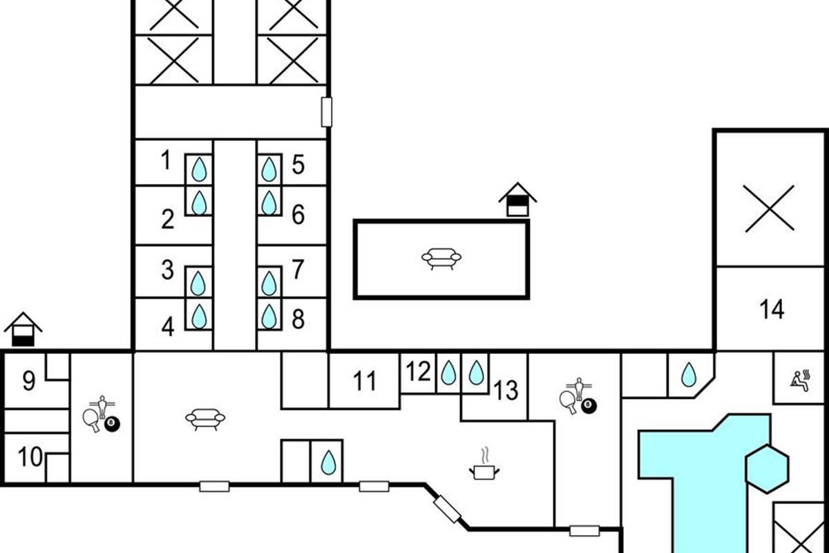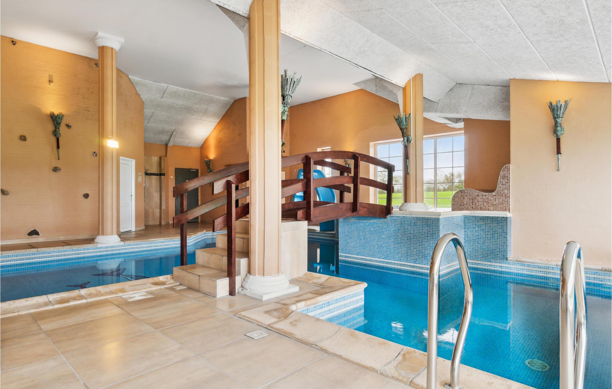 Het zwembad van 165 m2 is gemodelleerd naar Romeinse thermale baden. De hal is versierd met klinkers en natuursteen in zachte natuurlijke kleuren, en het zwembad van 50 m² wordt omringd door imposante zuilen en flikkerende fakkels op de muren. De sauna en het solarium bieden ook ontspanning en gezelligheid na het zwemmen.