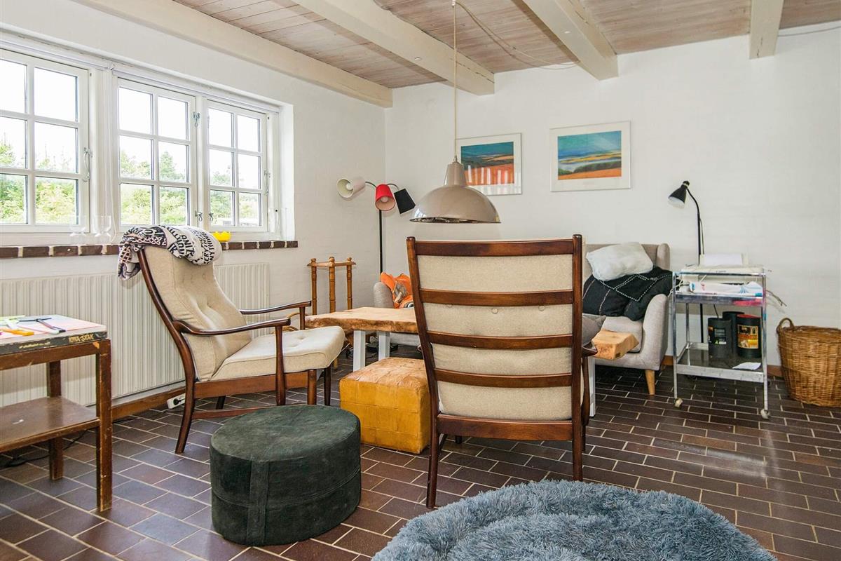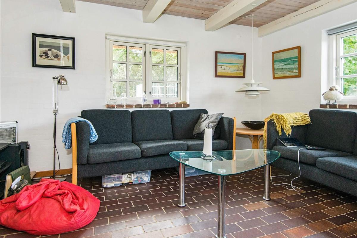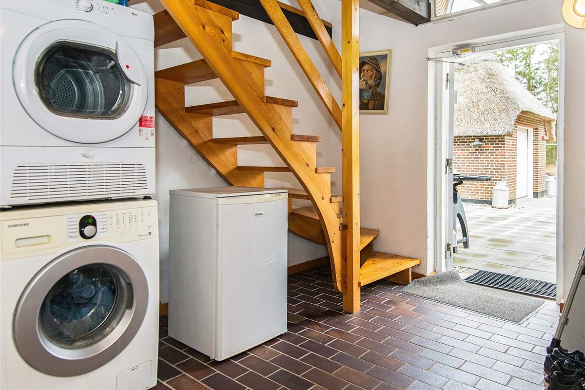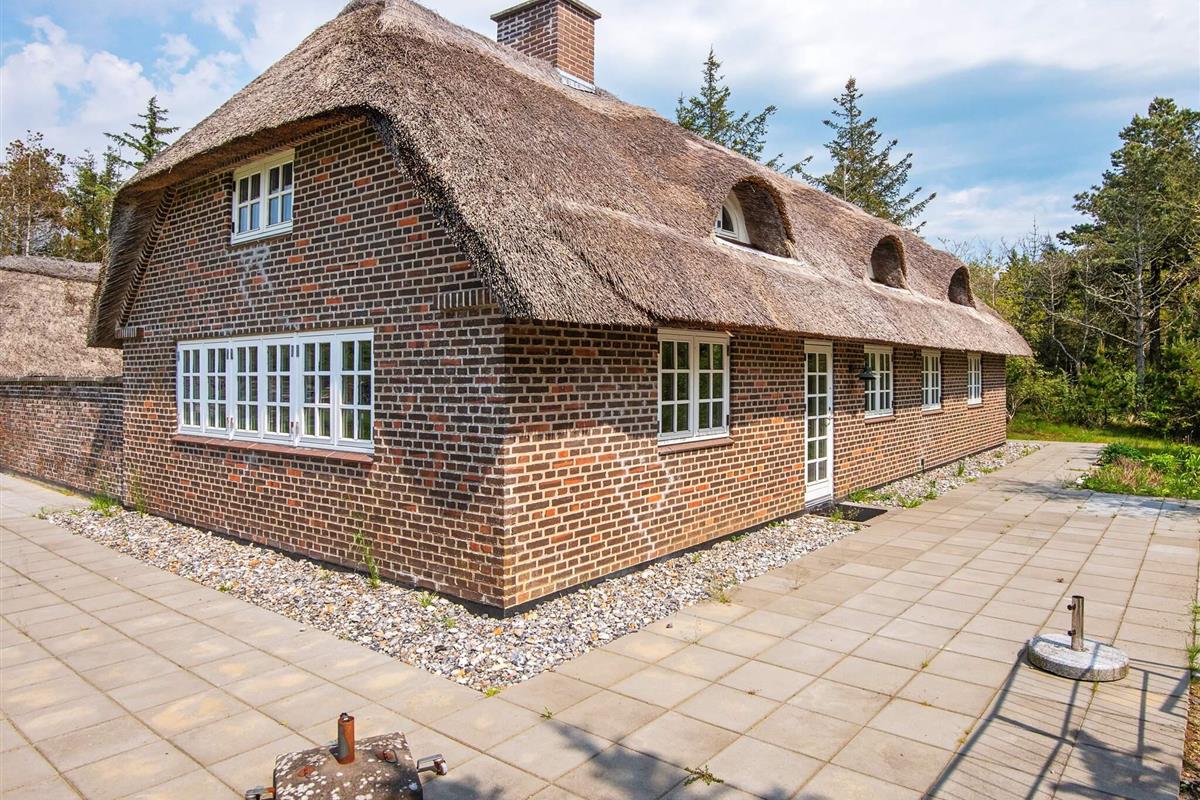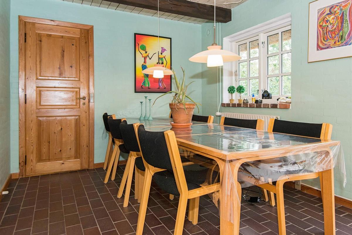 Geräumiges, reetgedecktes Ferienhaus mit Sauna im Bad sowie zwei Wohnebenen. Liegt attraktiv, im Waldgebiet von Vester Husby, auf einem 5.000 m2 großen Naturgrundstück mit Schaukel und Fußballtor für die Kinder.