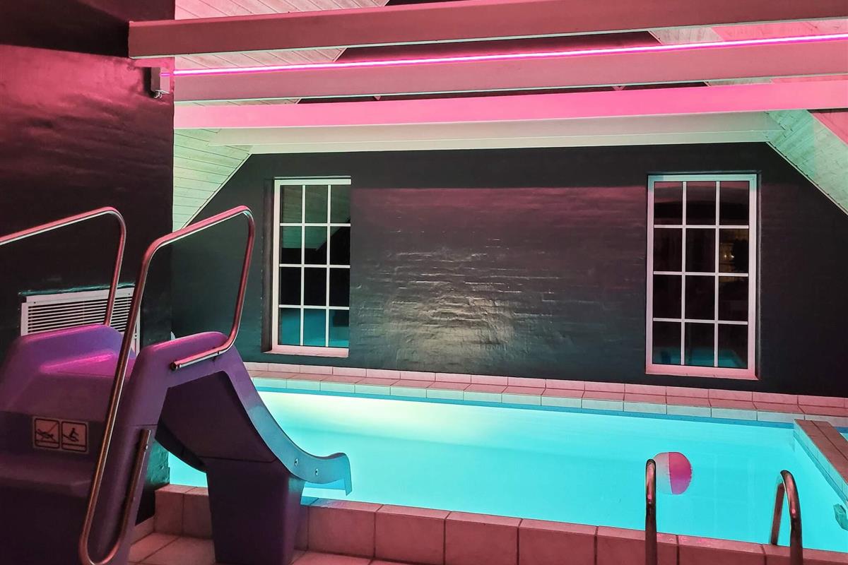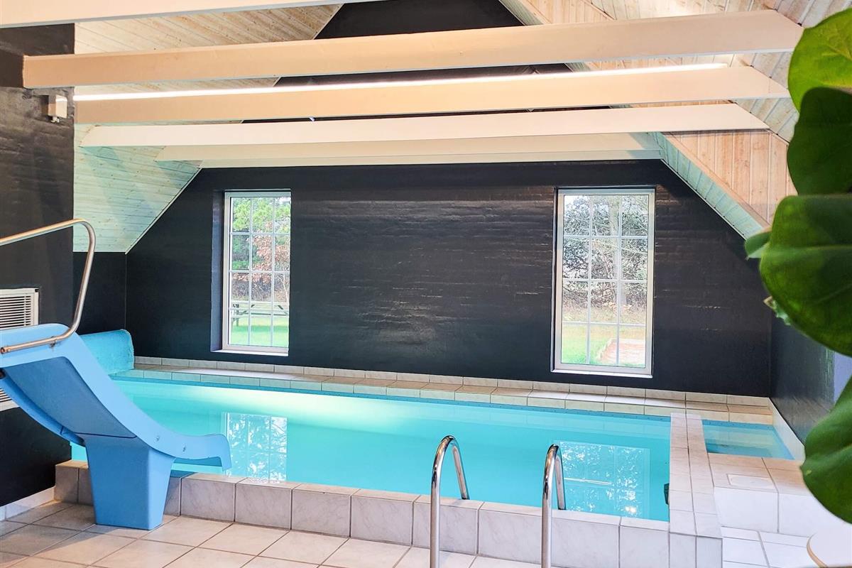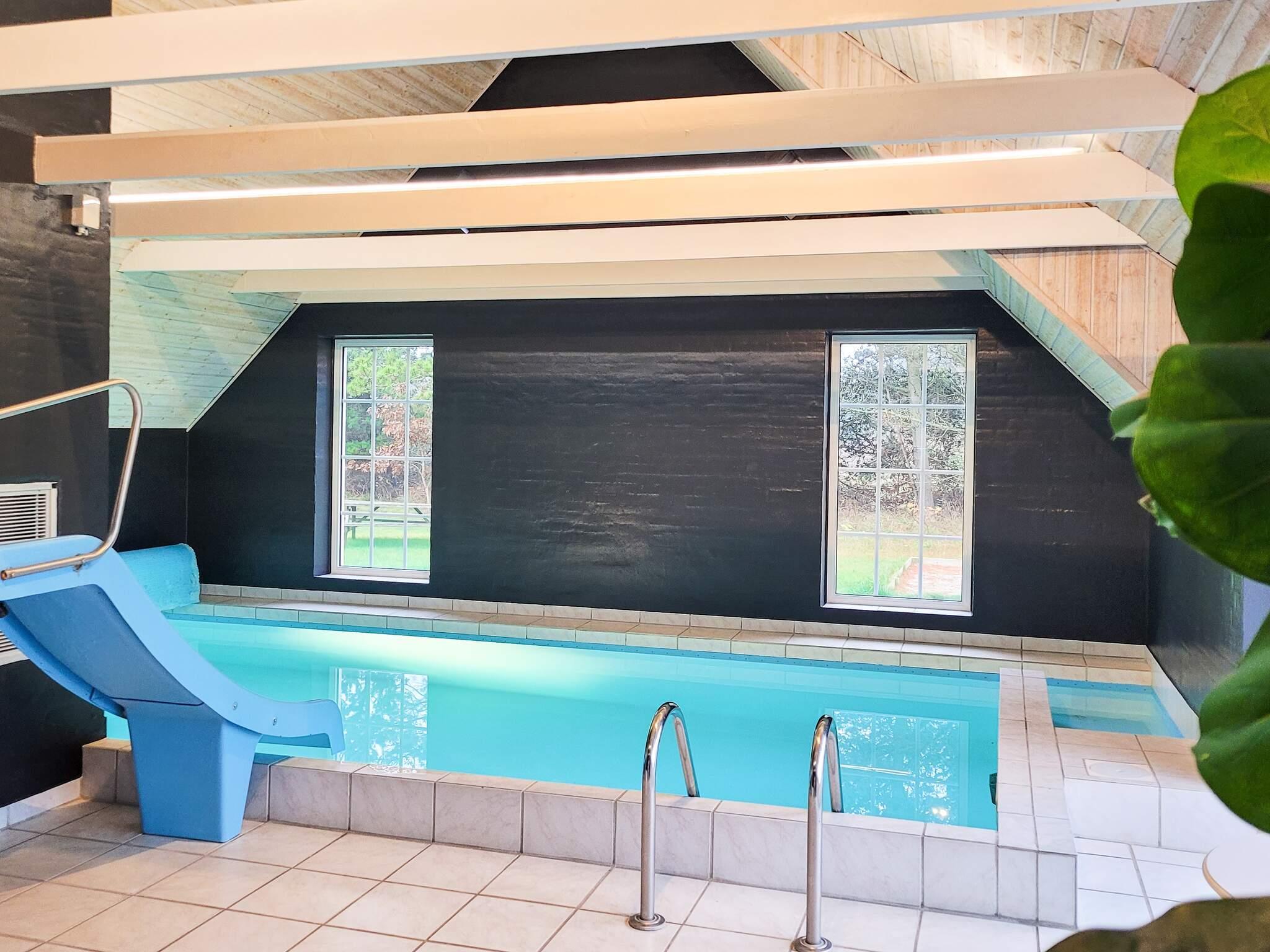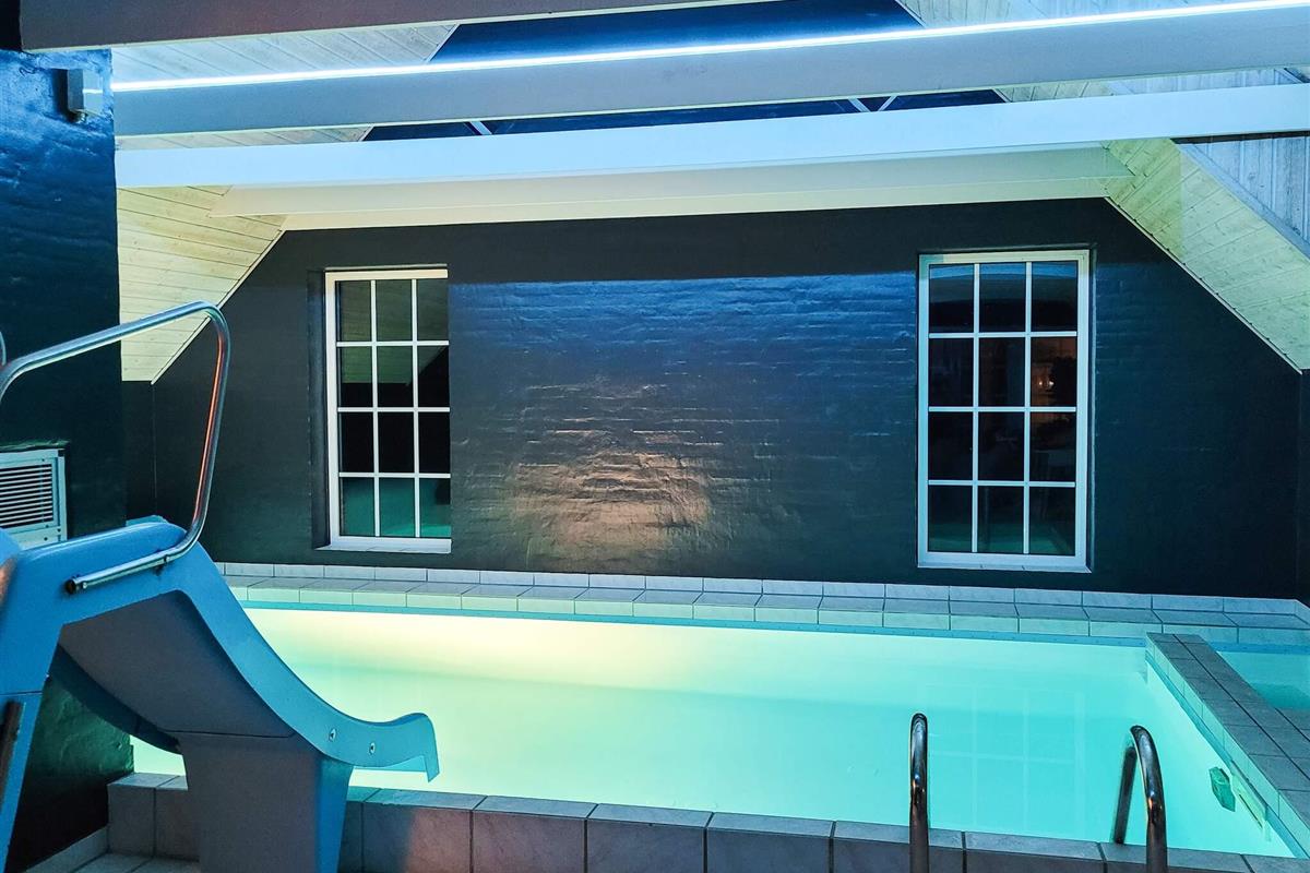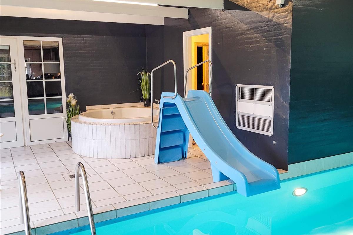 Der einladende Poolbereich ist mit einem 20 m² großen Pool mit Gegenstromanlage, Rutsche, einem kleinen Kinderbassin sowie einem Whirlpool für max. 5 Personen eingerichtet. Auch befinden sich hier eines der insgesamt drei Badezimmer des Hauses und die Sauna.