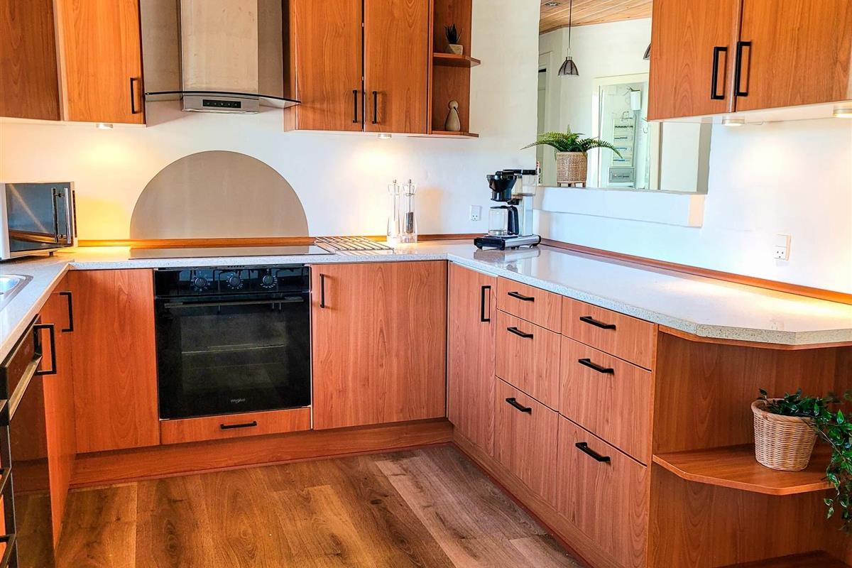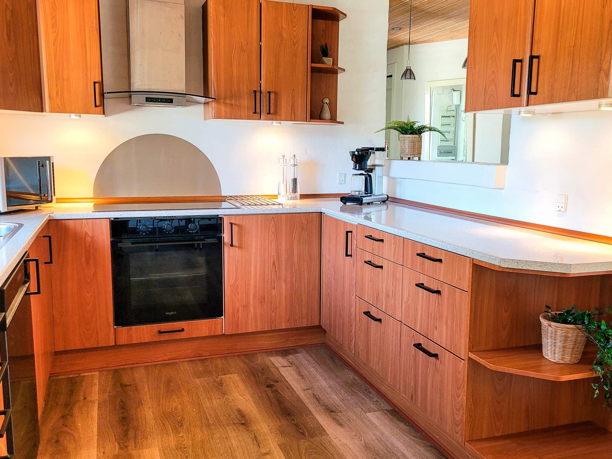 Die Küche bietet viel Schrankplatz und ist u.a. mit großem Kühl-/Gefrierschrank, Cerankochfeld, Nespresso-Kaffeemaschine und Heißluftofen umfassend eingerichtet. Im Wohnzimmer und in der Küche sind praktische Fliesenfußböden verlegt.