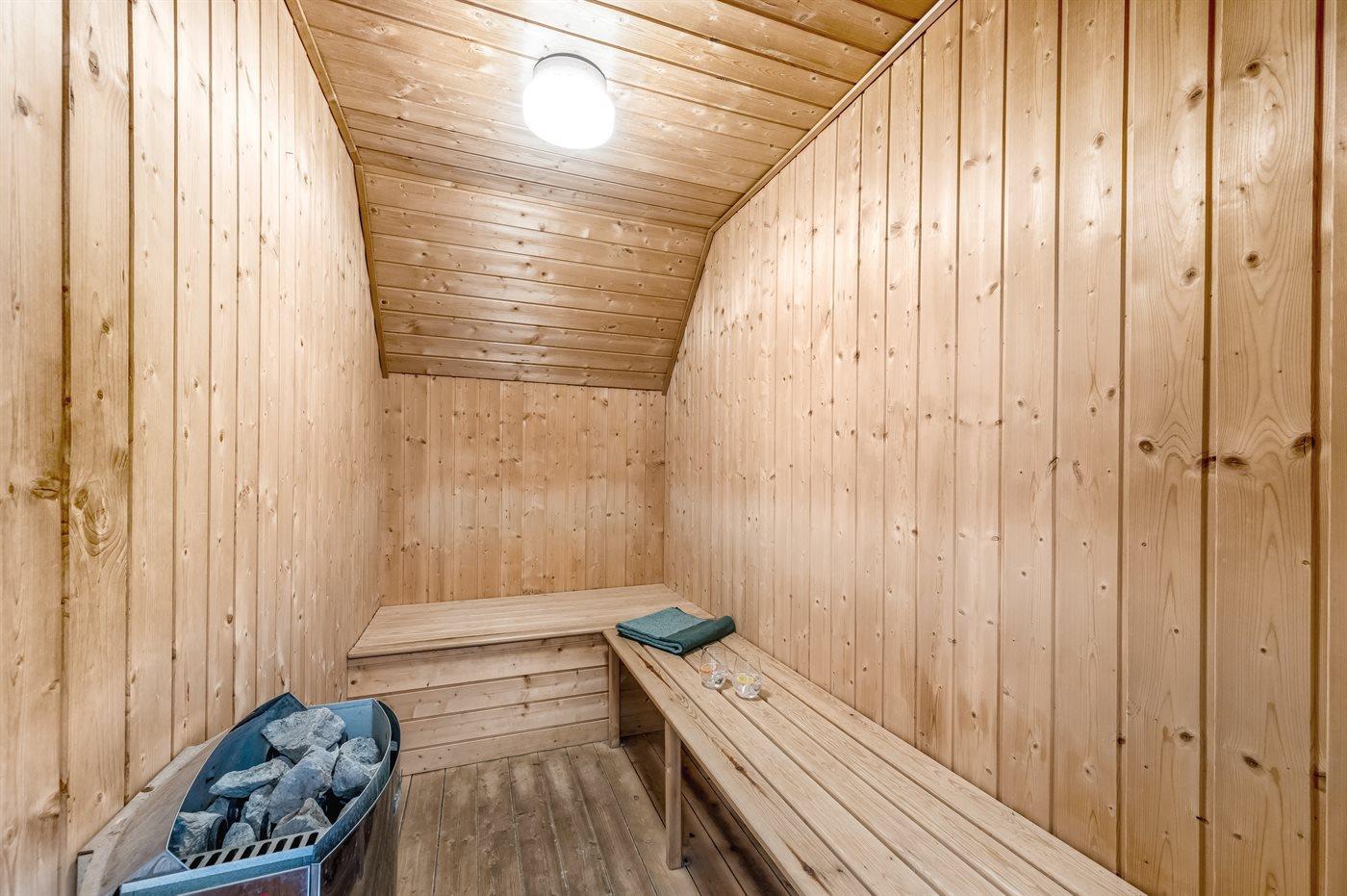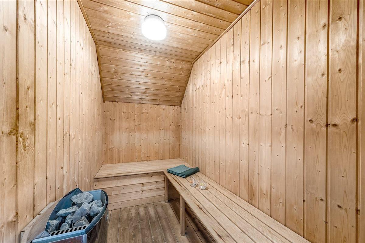 Er is 2 badkamers met douche en 2 toiletten. Er is vloerverwarming in 1 badkamer. De sauna biedt de gelegenheid tot ontspanning.