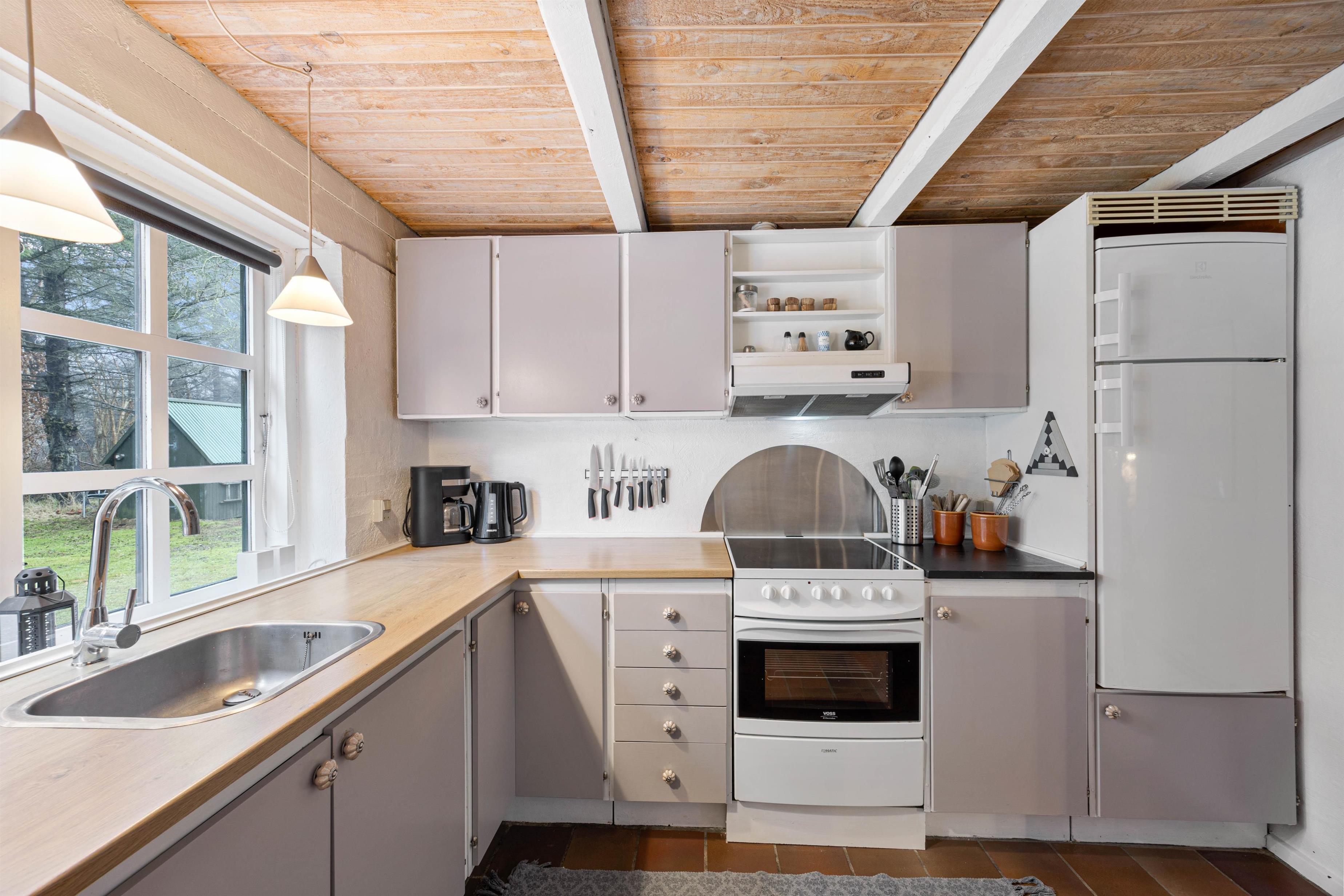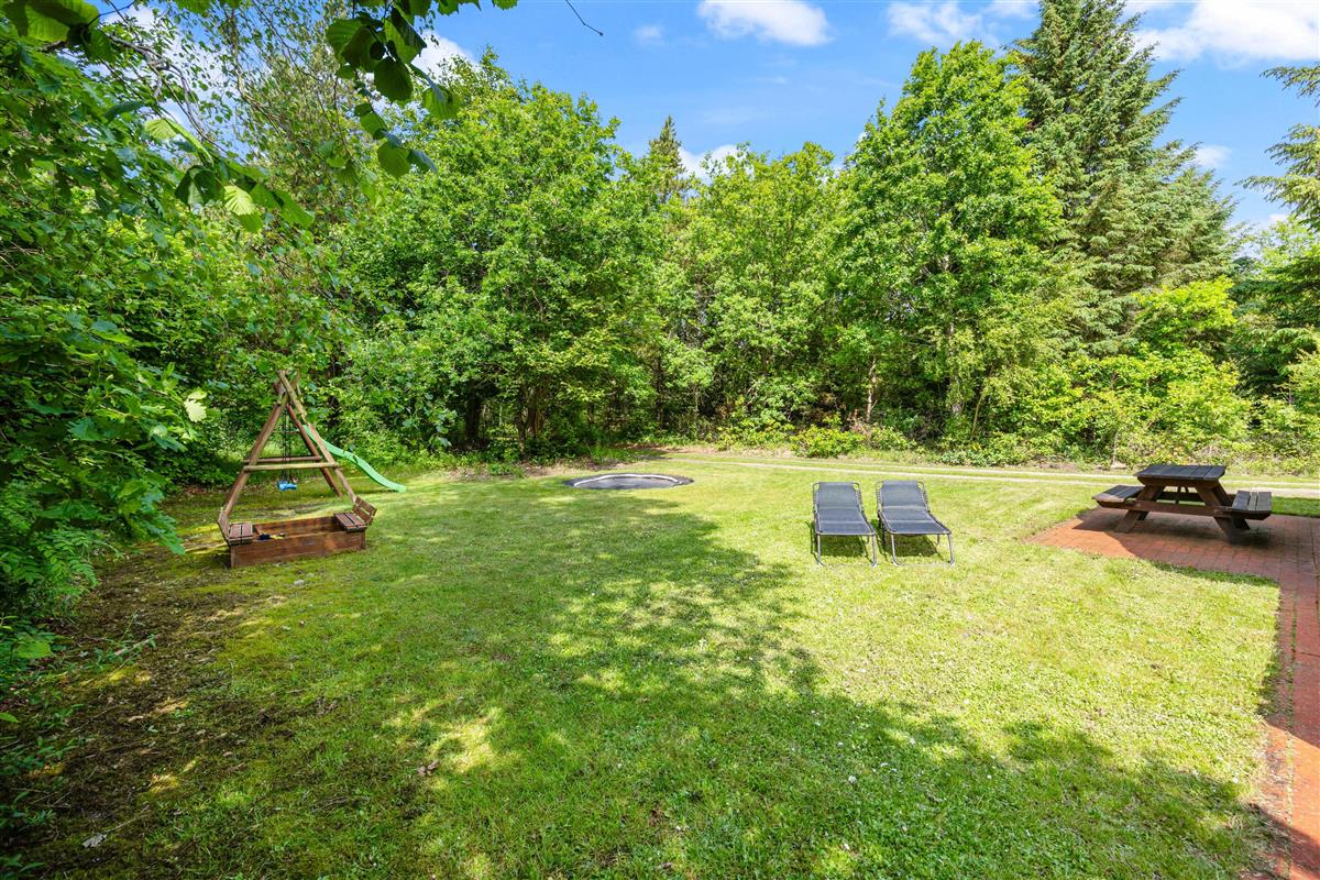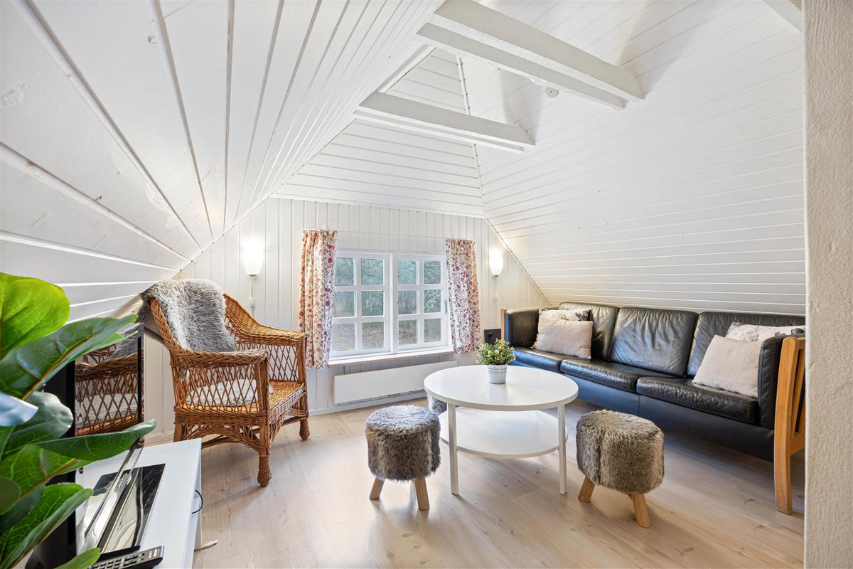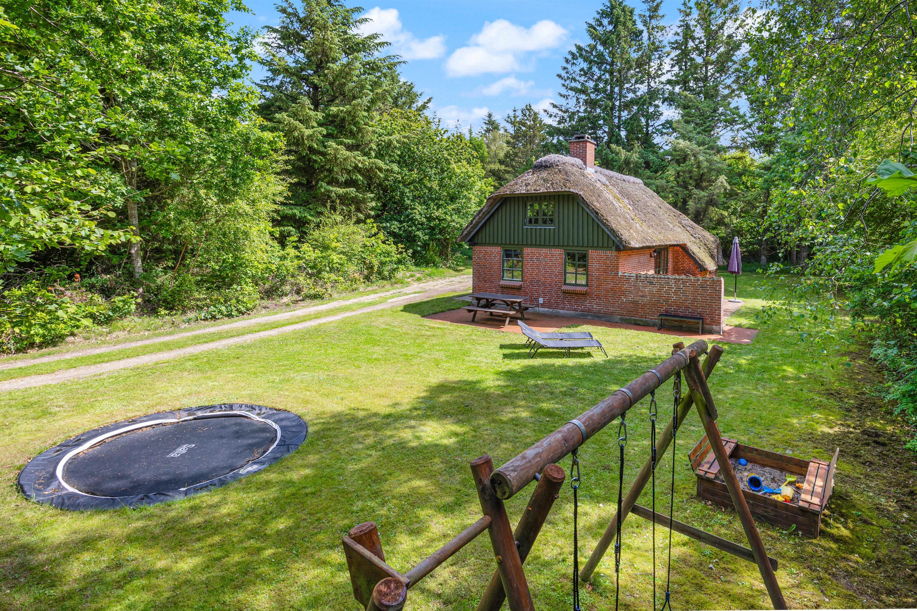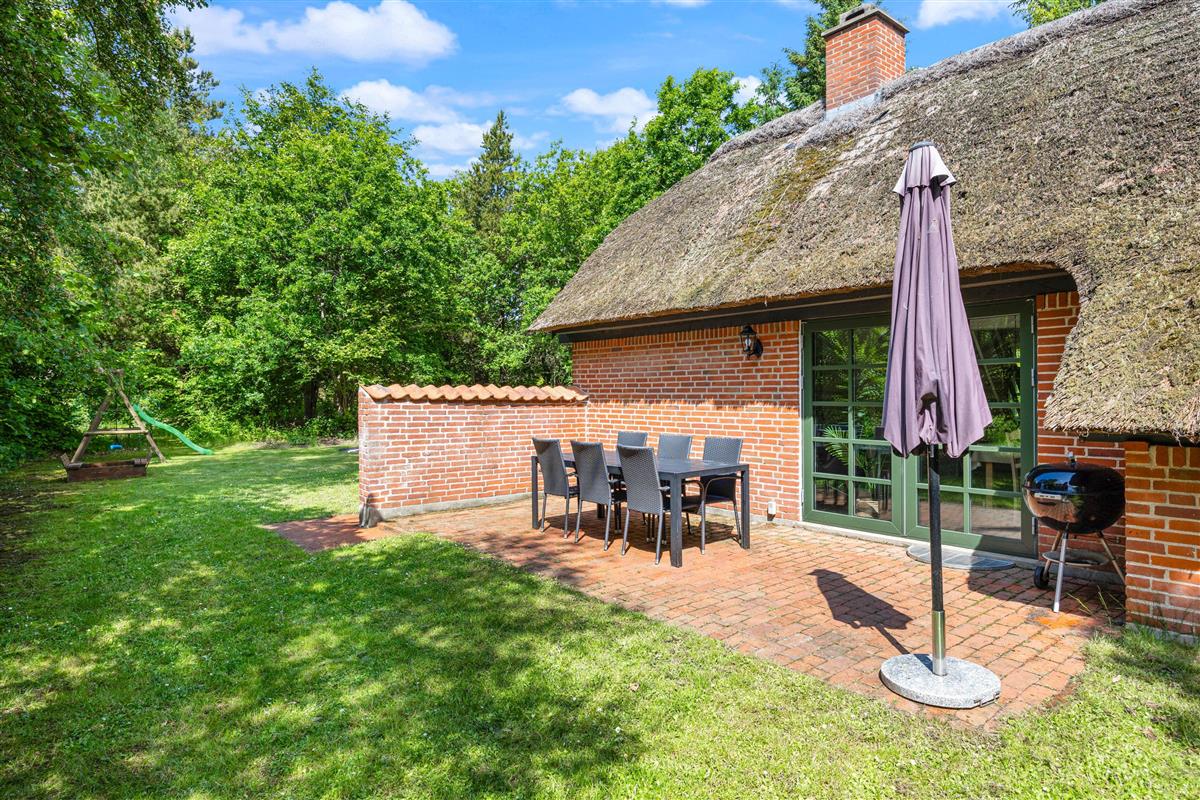 Enjoy the fresh air and special charm of the Danish countryside from the spacious terrace. The outdoor area features both open and sheltered terraces, perfect for peaceful relaxation or sociable barbecue evenings. The garden furniture invites you to enjoy your morning coffee or a cosy dinner under the open sky. The natural plot, surrounded by trees, offers both privacy and plenty of space for children and dogs to play freely. A sandbox, swing, and trampoline ensure that even the youngest guests are well entertained.