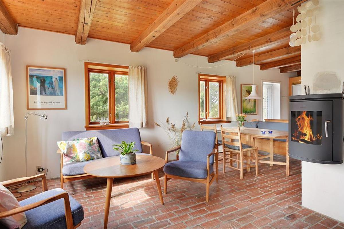 This wonderful holiday home with 80 square metres of living space is located all to itself on a beautiful 5,000 square metre dune plot. In the middle of heather and small pines, you are in the middle of West Jutland's nature. On the three terraces, one with morning sun, one facing south and a small one facing west, there is almost always a corner sheltered from the wind. A special feature is the floor, it is clinkered. Together with the wooden furniture in Scandinavian style and the beamed ceiling, this gives a lot of cosiness. If you're lucky, you'll see deer and deer on the large property from late summer.