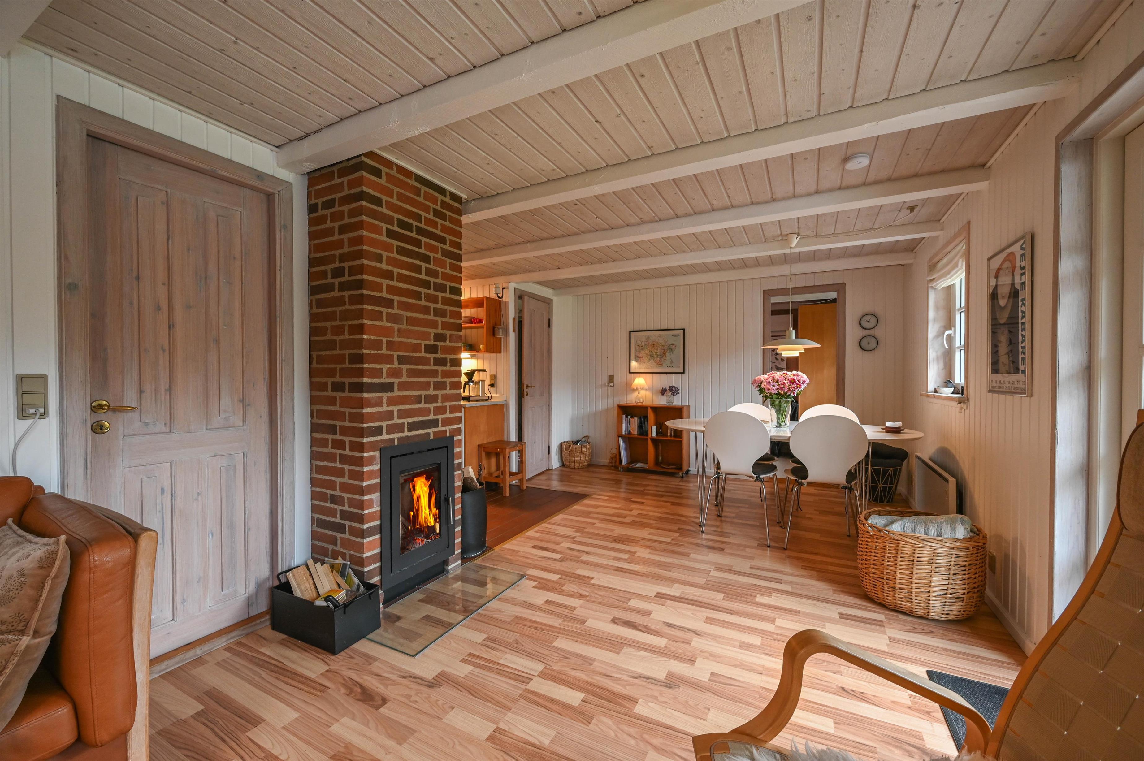 Layout: Entrance hallway, bright, friendly living room with fireplace and wooden floor, dining area and open kitchen. A total of 2 double bedrooms, in a plenty of closet space. Small bathroom with shower niche and underfloor heating.