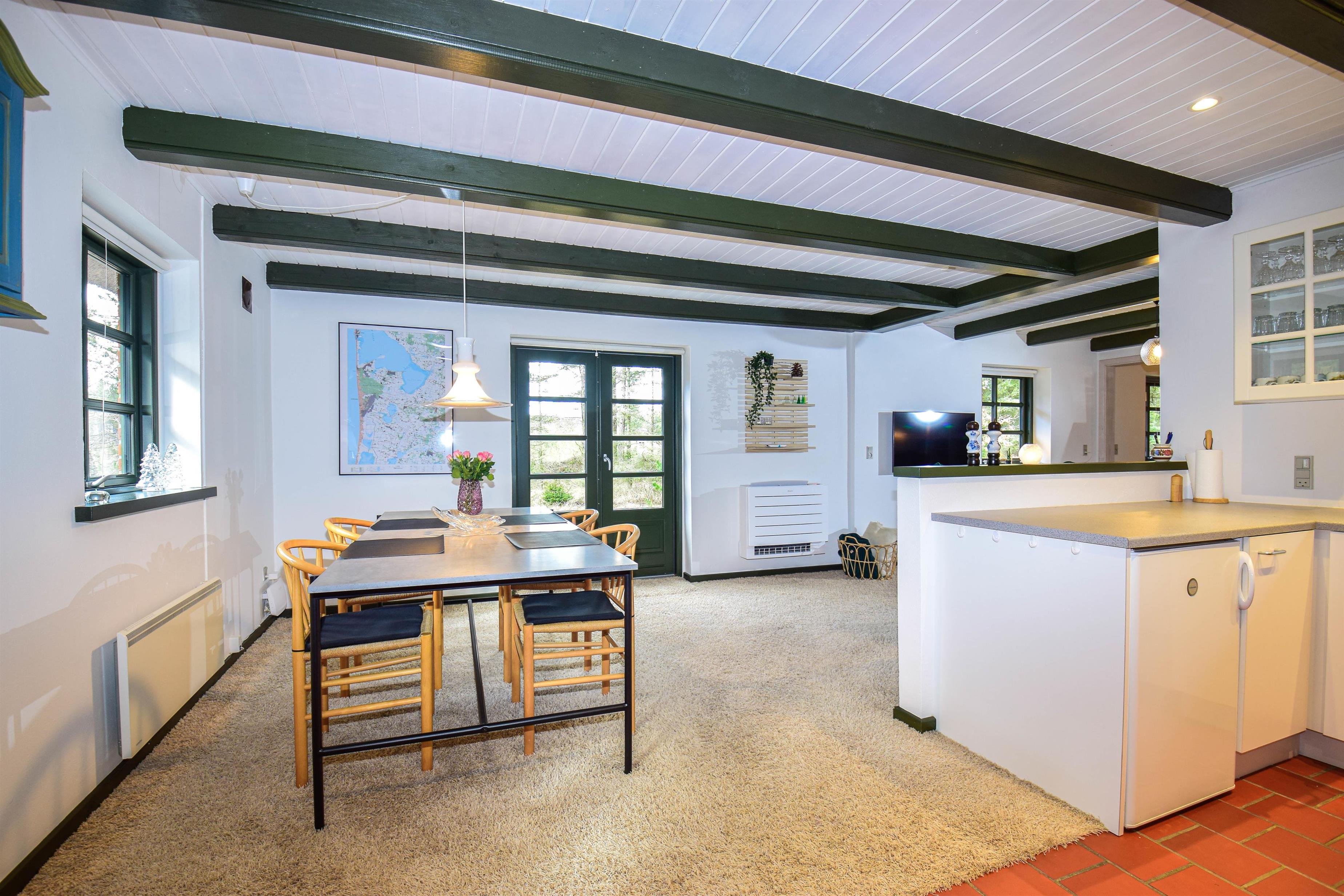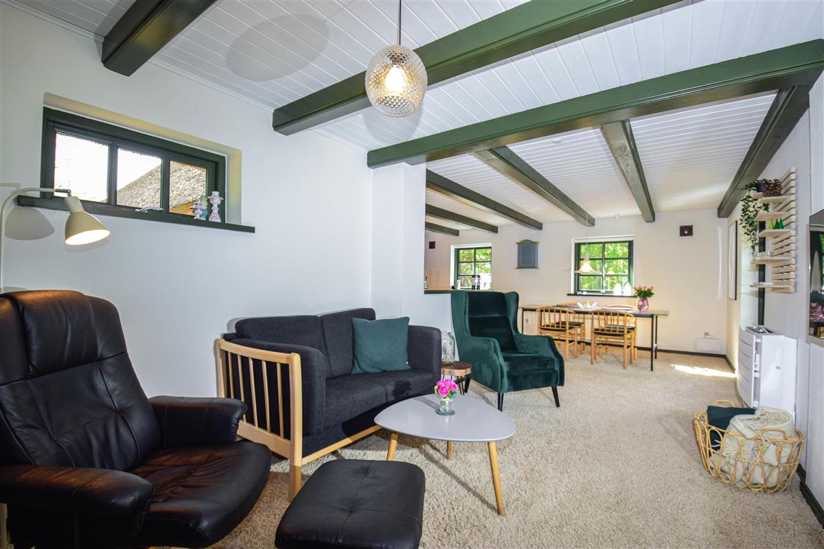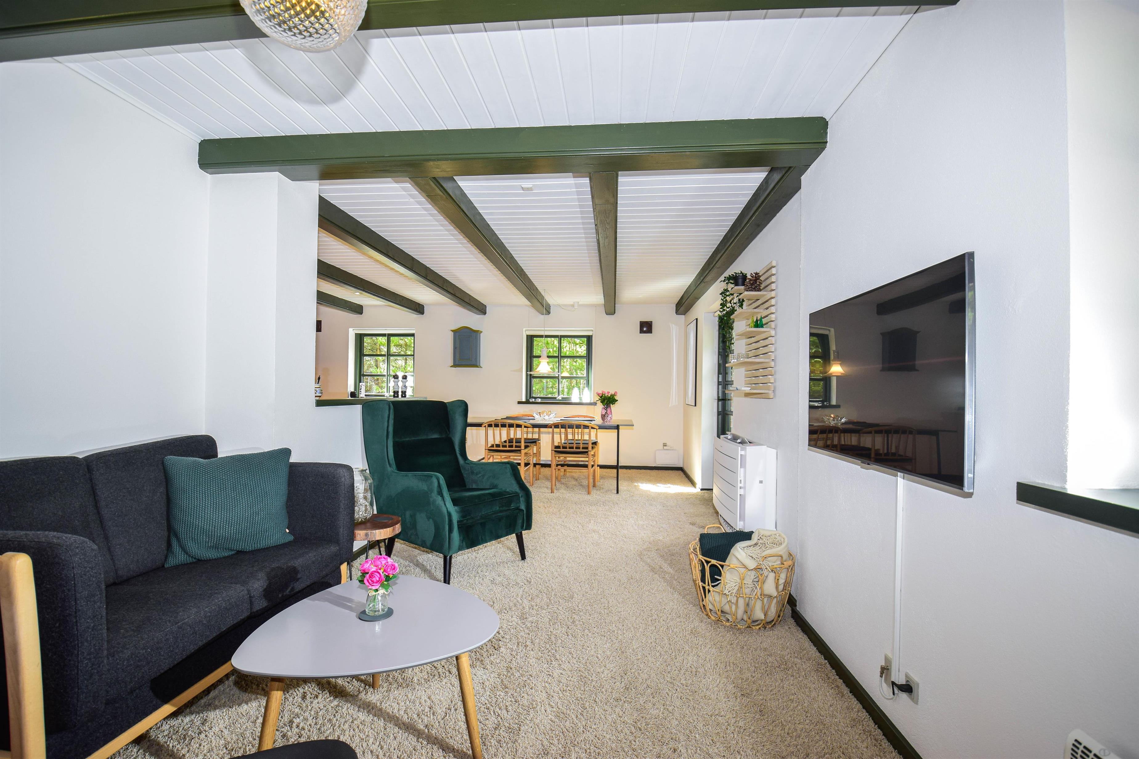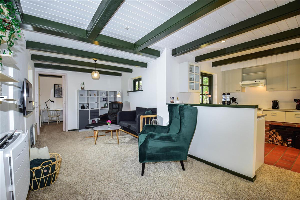 The beautiful fireplace provides cosiness in the bright living room with its exposed ceiling beams and tasteful furniture. There are two bedrooms – one with a double bed and one with two single beds, as well as a small study.