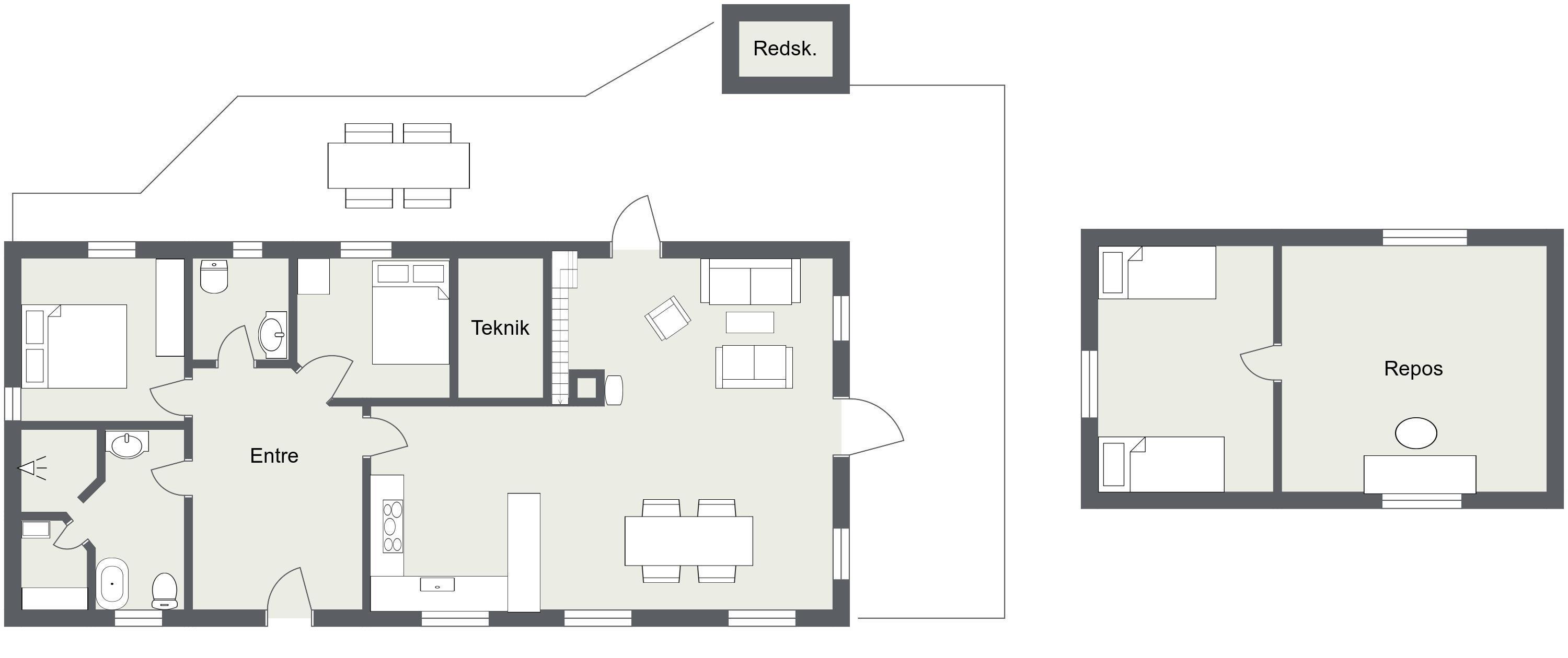 Layout: Large entrance hallway. Spacious, tiled living/dining room open to the roof ridge with a good fireplace and access to the south and west terraces. Spacious kitchen in open connection to the living room. A total of 3 bedrooms: on the ground floor two with double bed, one of them 3/4 wide and on the 1st floor one with 2 single beds. You have two modern bathrooms at your disposal, a guest toilet with changing table and a large bathroom with shower, sauna and - a special feature for a summer house in this area - with a bathtub.