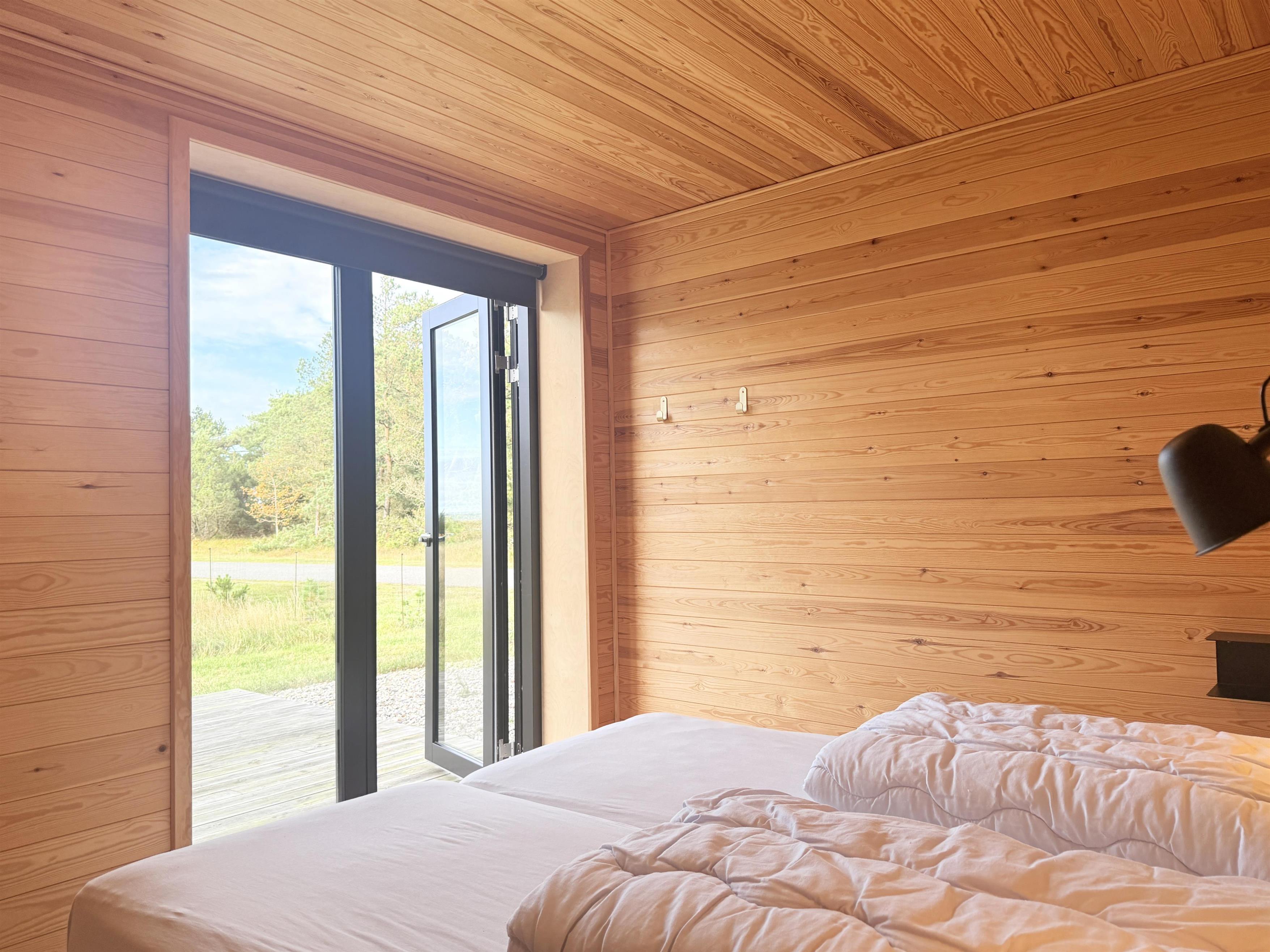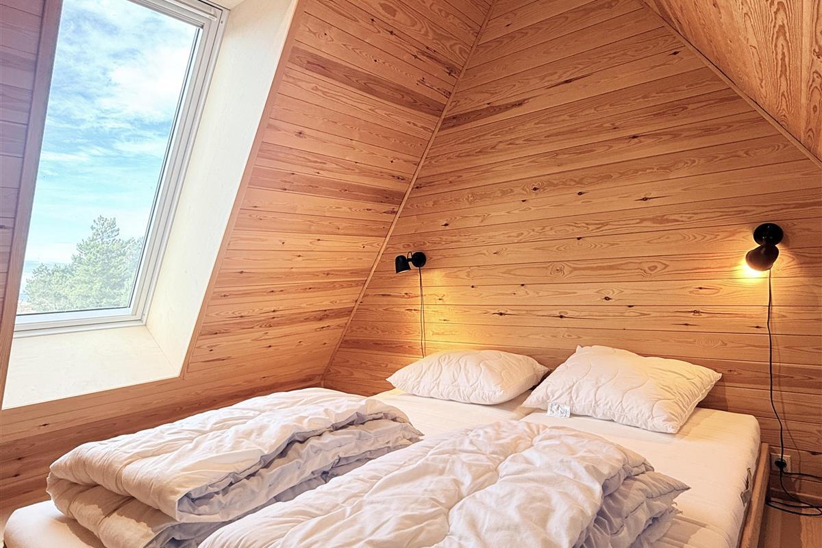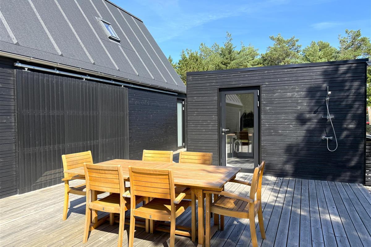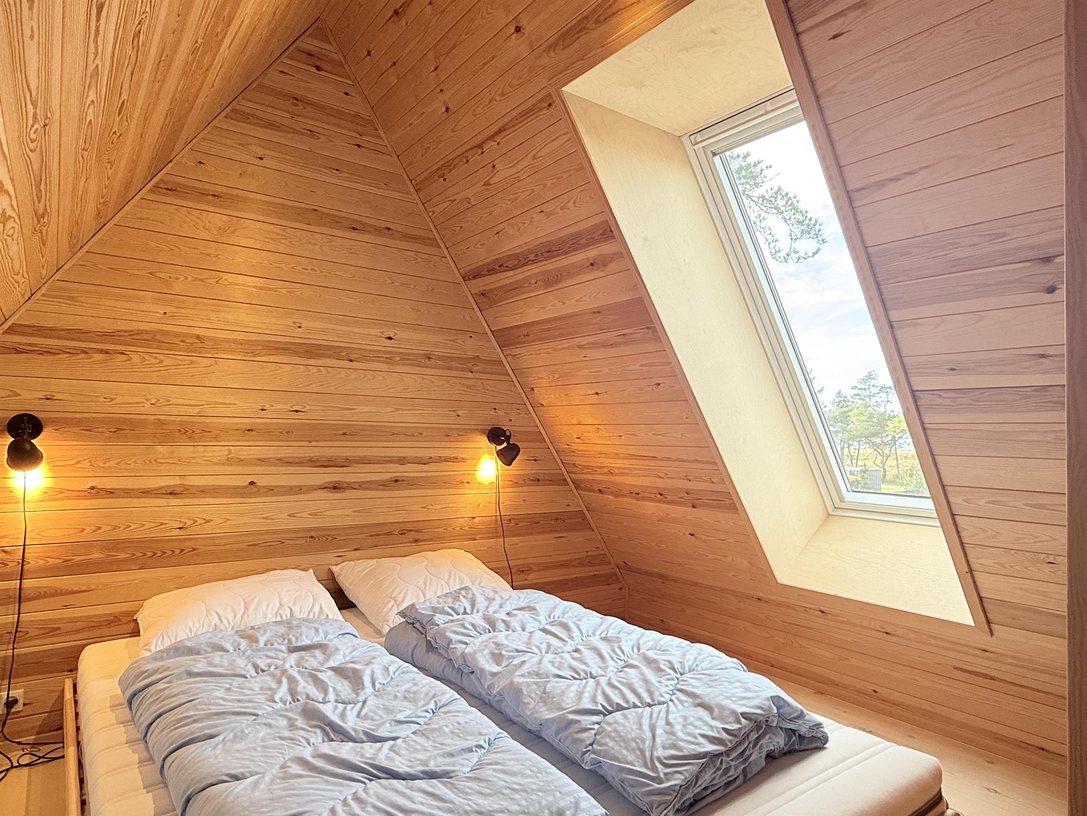 Das Haupthaus verfügt über eine große, helle Wohnküche mit Essbereich und gemütlicher Sofaecke. Außerdem gibt es ein Schlafzimmer mit Doppelbett, ein Badezimmer mit Dusche und eine Treppe zu einem weiteren Schlafzimmer mit Doppelbett. Eine ähnliche Aufteilung mit Schlafzimmern und Badezimmer befindet sich im gegenüberliegenden Flügel des Hauses, der durch die überdachte Terrasse vom Haupthaus getrennt ist. Die Schlafzimmer im ersten Stock bieten einen traumhaften Meerblick, und sowohl die Badezimmer als auch die Schlafzimmer im Erdgeschoss haben Zugang zum Garten. Die Raumaufteilung macht das Haus besonders geeignet für mehrere Familien. Vom Haupthaus aus gelangen Sie auf die nach Westen und Osten ausgerichteten Holzterrassen. Eine Außendusche lädt nach einem Strandbesuch zum Entspannen ein. Es bieten sich wirklich gute Gelegenheiten, den hauseigenen Grill zu nutzen und dabei den Sonnenuntergang über dem Meer zu genießen.