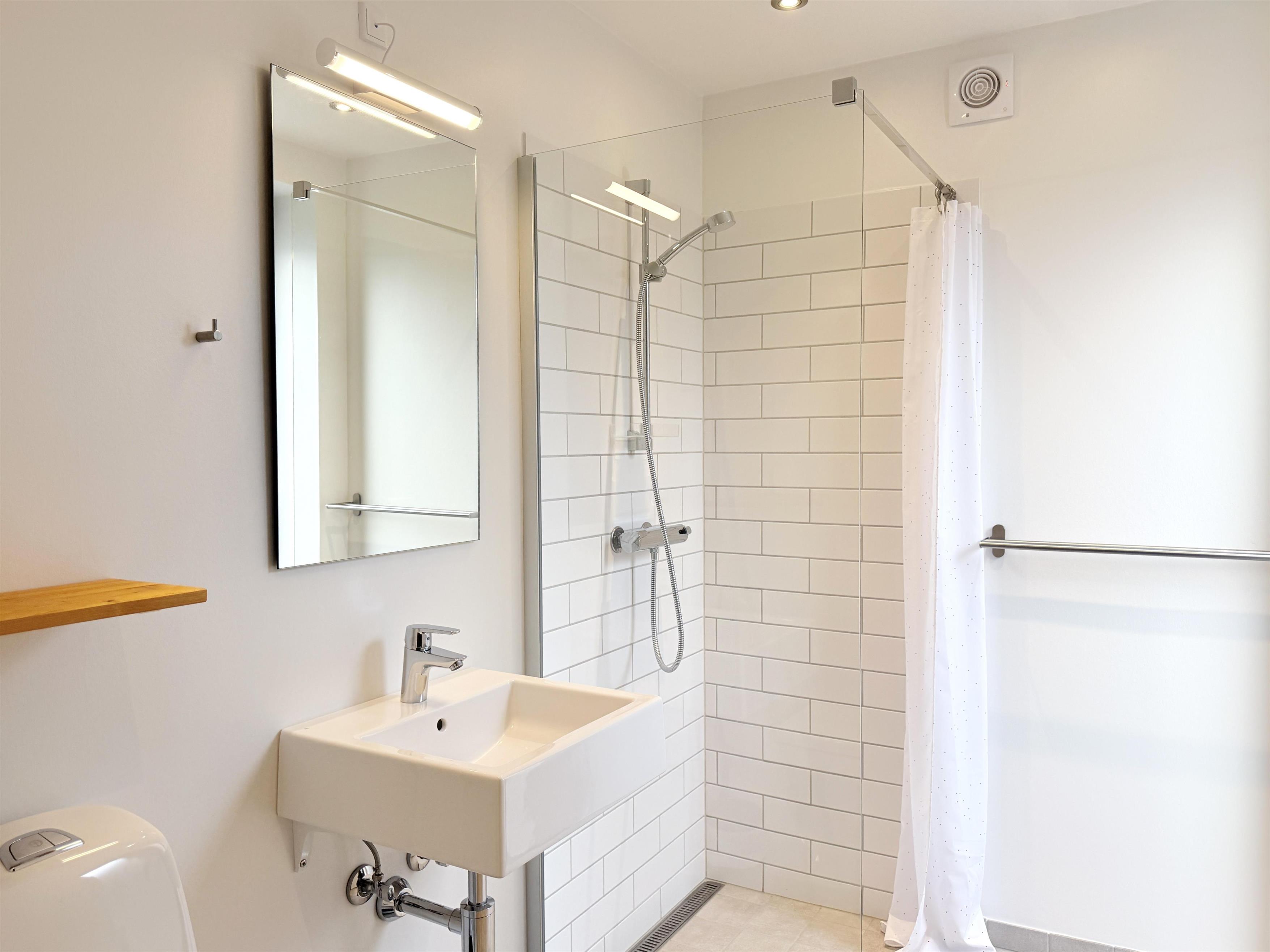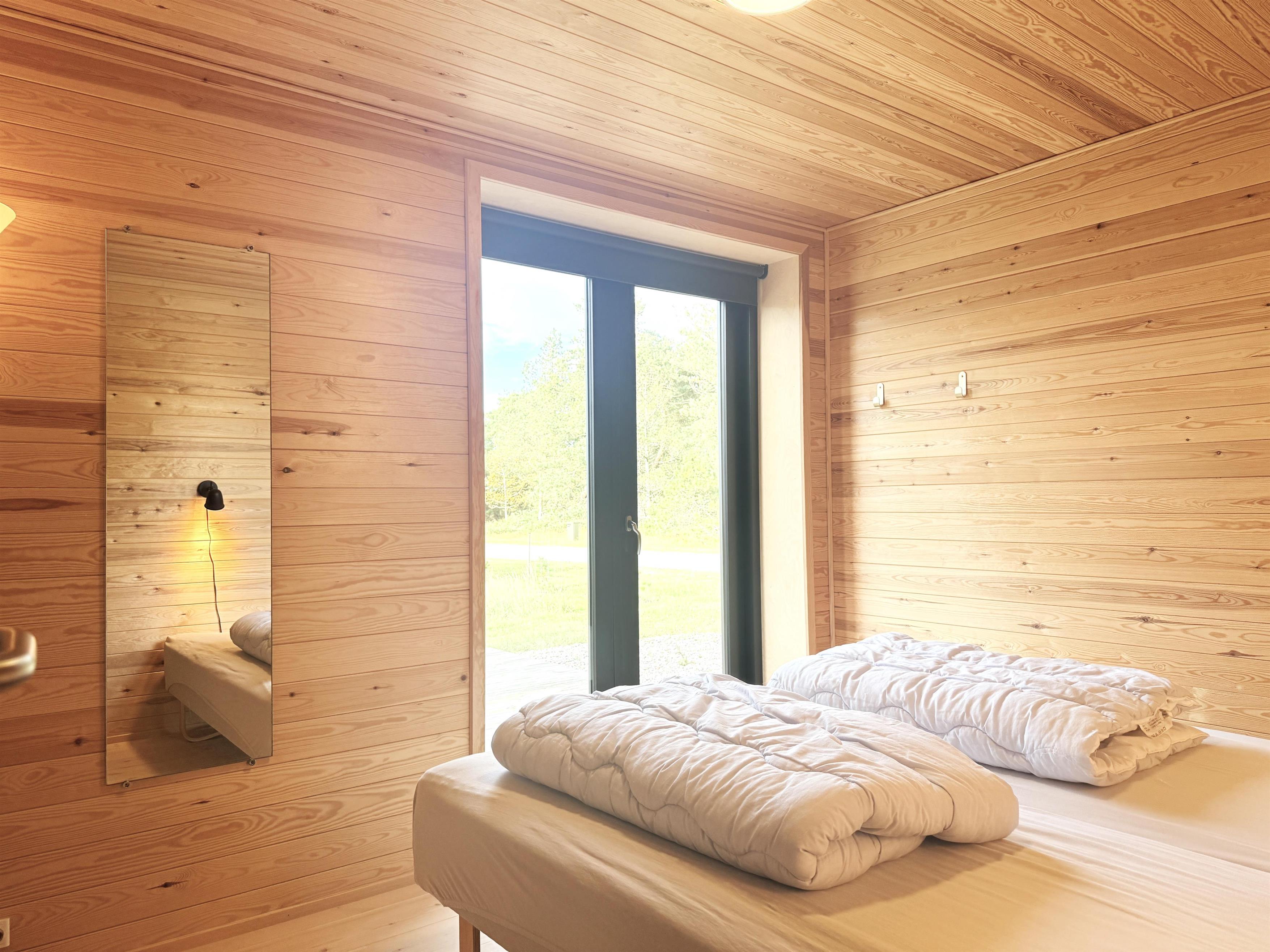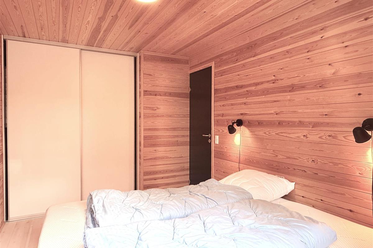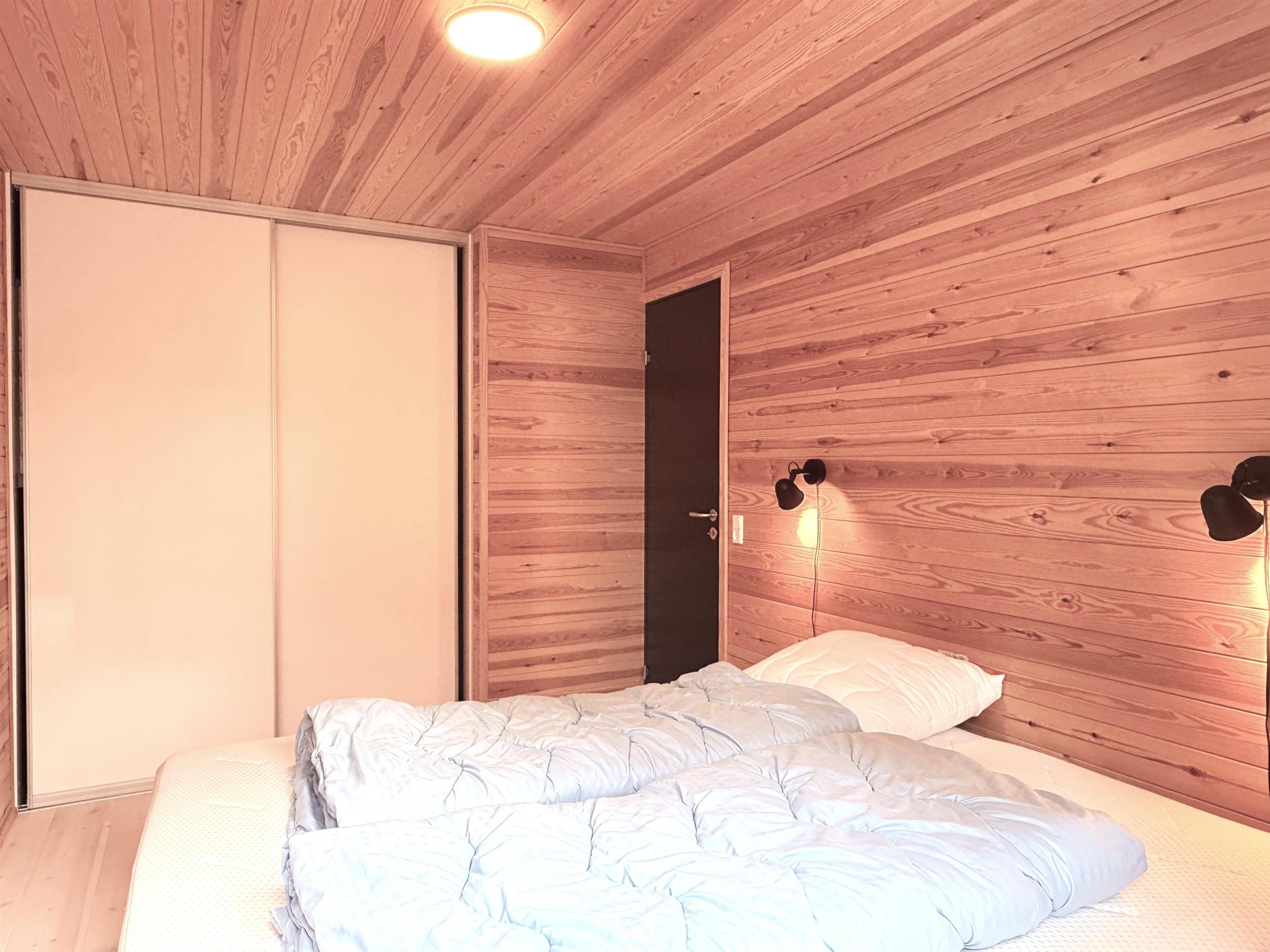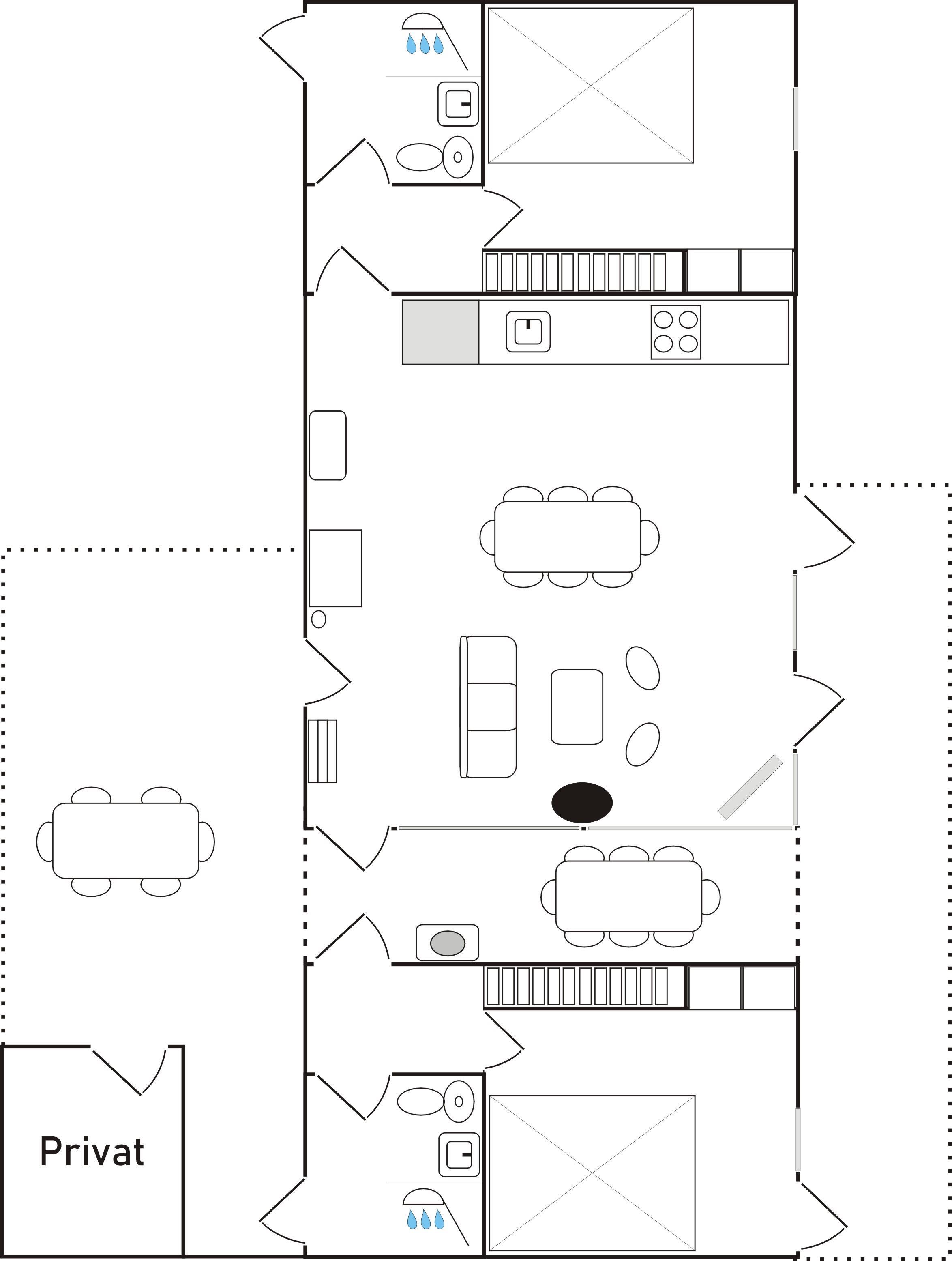 Das Haupthaus verfügt über eine große, helle Wohnküche mit Essbereich und gemütlicher Sofaecke. Außerdem gibt es ein Schlafzimmer mit Doppelbett, ein Badezimmer mit Dusche und eine Treppe zu einem weiteren Schlafzimmer mit Doppelbett. Eine ähnliche Aufteilung mit Schlafzimmern und Badezimmer befindet sich im gegenüberliegenden Flügel des Hauses, der durch die überdachte Terrasse vom Haupthaus getrennt ist. Die Schlafzimmer im ersten Stock bieten einen traumhaften Meerblick, und sowohl die Badezimmer als auch die Schlafzimmer im Erdgeschoss haben Zugang zum Garten. Die Raumaufteilung macht das Haus besonders geeignet für mehrere Familien. Vom Haupthaus aus gelangen Sie auf die nach Westen und Osten ausgerichteten Holzterrassen. Eine Außendusche lädt nach einem Strandbesuch zum Entspannen ein. Es bieten sich wirklich gute Gelegenheiten, den hauseigenen Grill zu nutzen und dabei den Sonnenuntergang über dem Meer zu genießen.