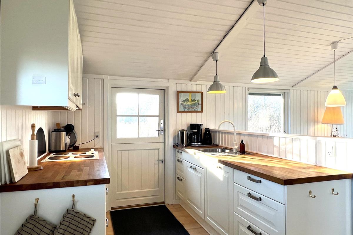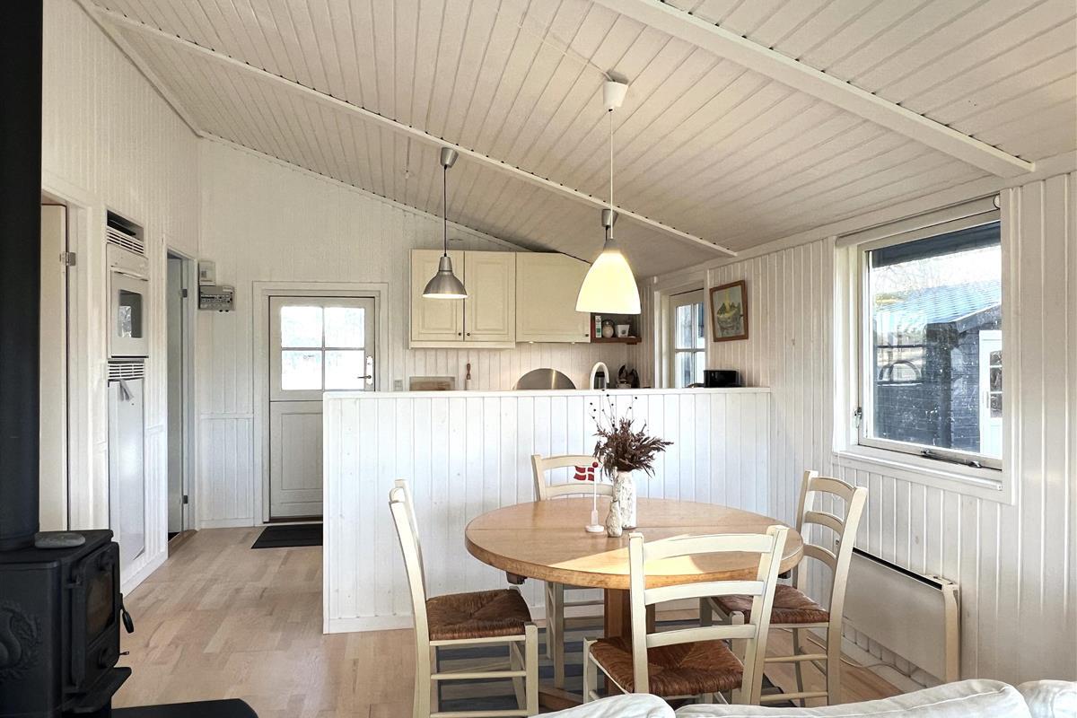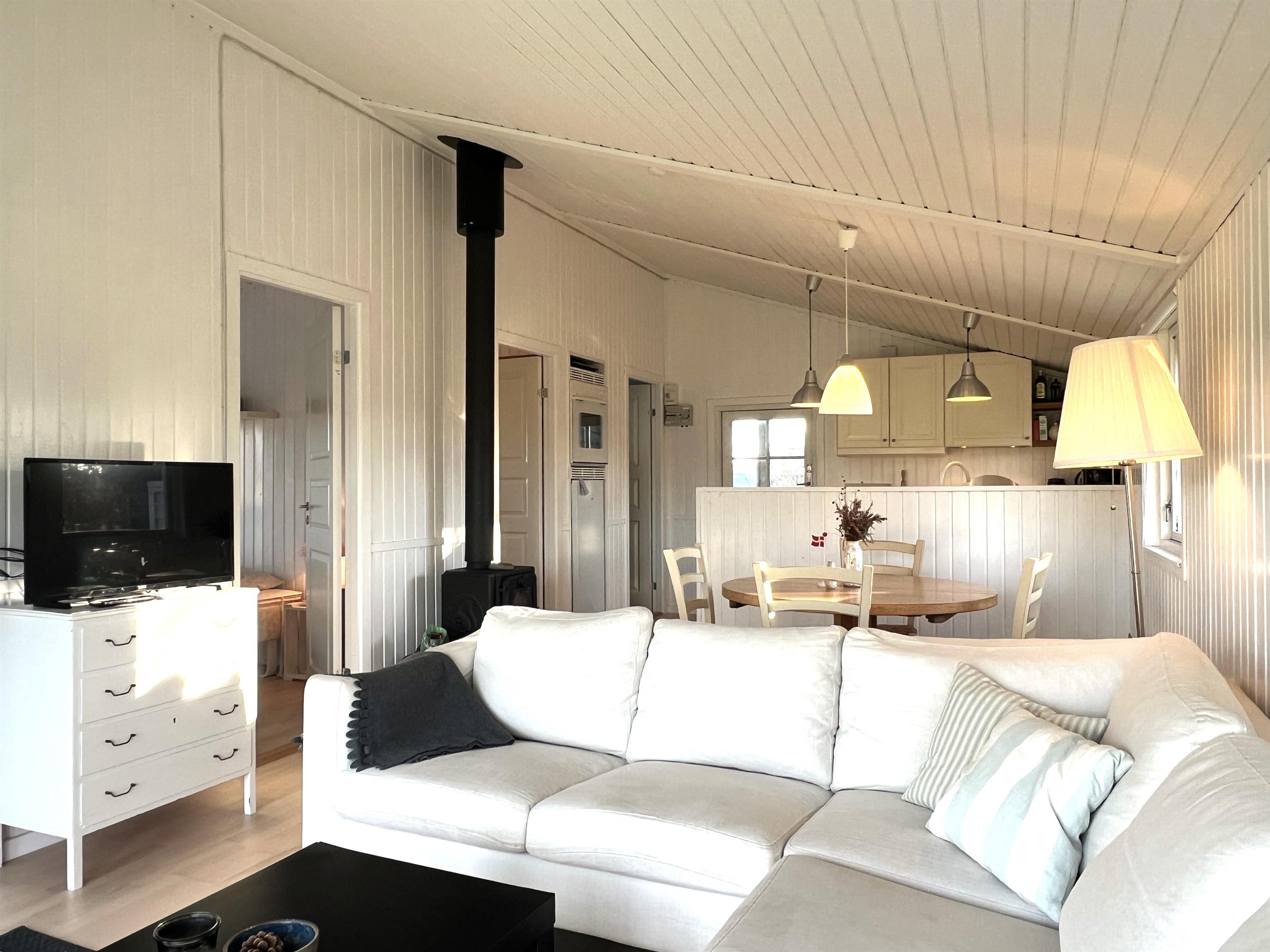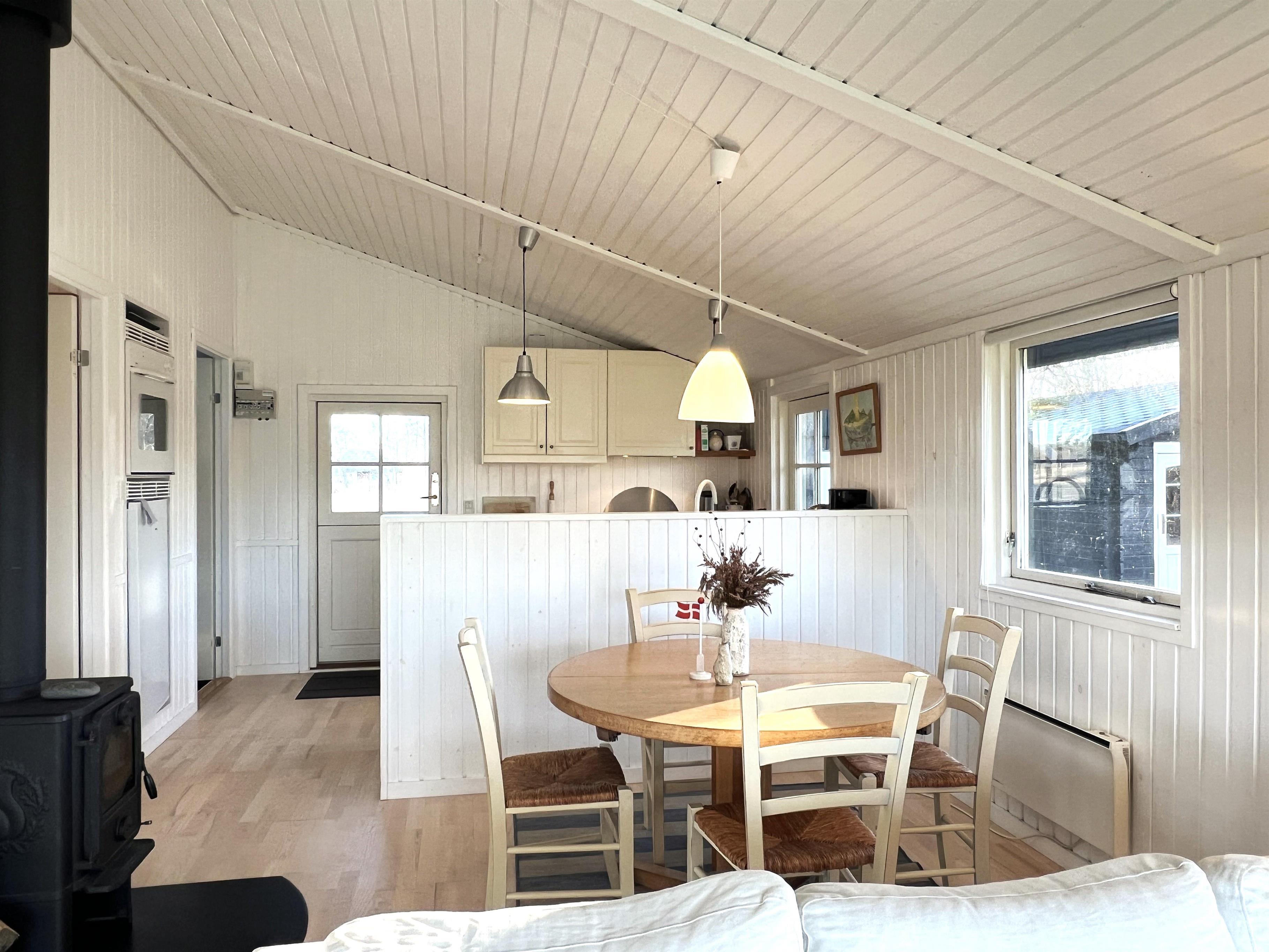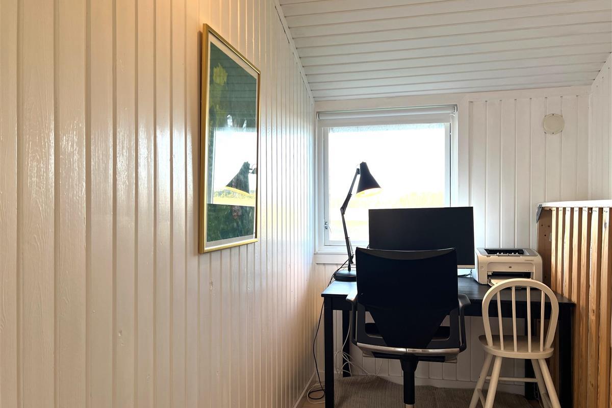 Das Haus verfügt über eine schöne Küche in offener Verbindung zum Wohnzimmer, die über ein wirklich schönes Licht verfügt und sowohl mit einem Holzofen als auch mit einer Wärmepumpe beheizt wird. Vom Wohnzimmer aus haben Sie Zugang zur Terrasse, wo Sie die wunderschöne Natur und Tierwelt hautnah erleben können. Hier kann der Grill genutzt werden, während man bis in den Abend hinein den Sonnenuntergang genießen kann. Zwei gute Schlafzimmer mit Doppelbetten, eines davon mit eigenem Ausgang. Zusätzlich ein extra Zimmer/Kontor mit einem Bett. Badezimmer mit Dusche. Im Nebengebäude gibt es einen Gefrierschrank.