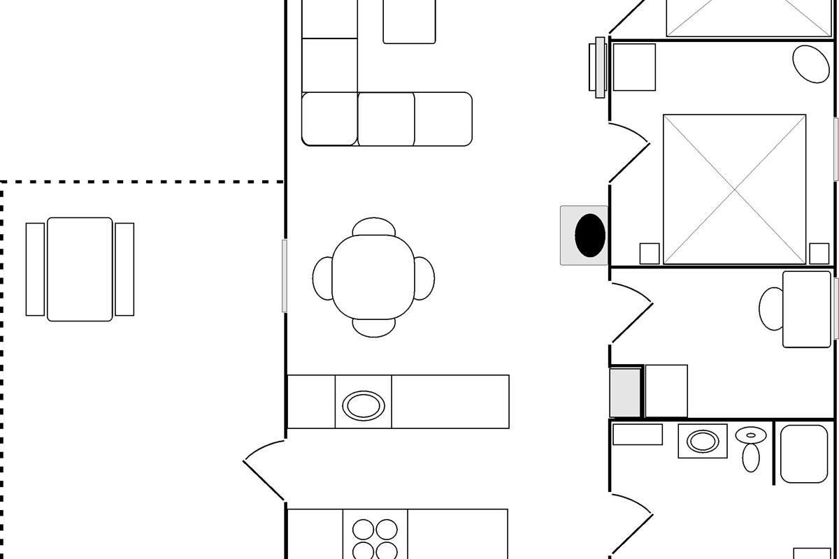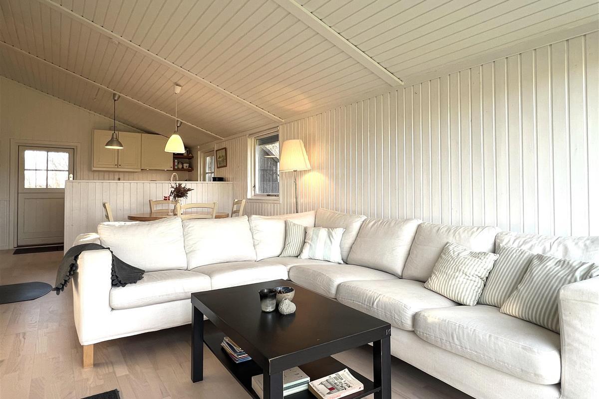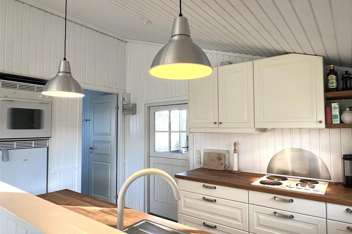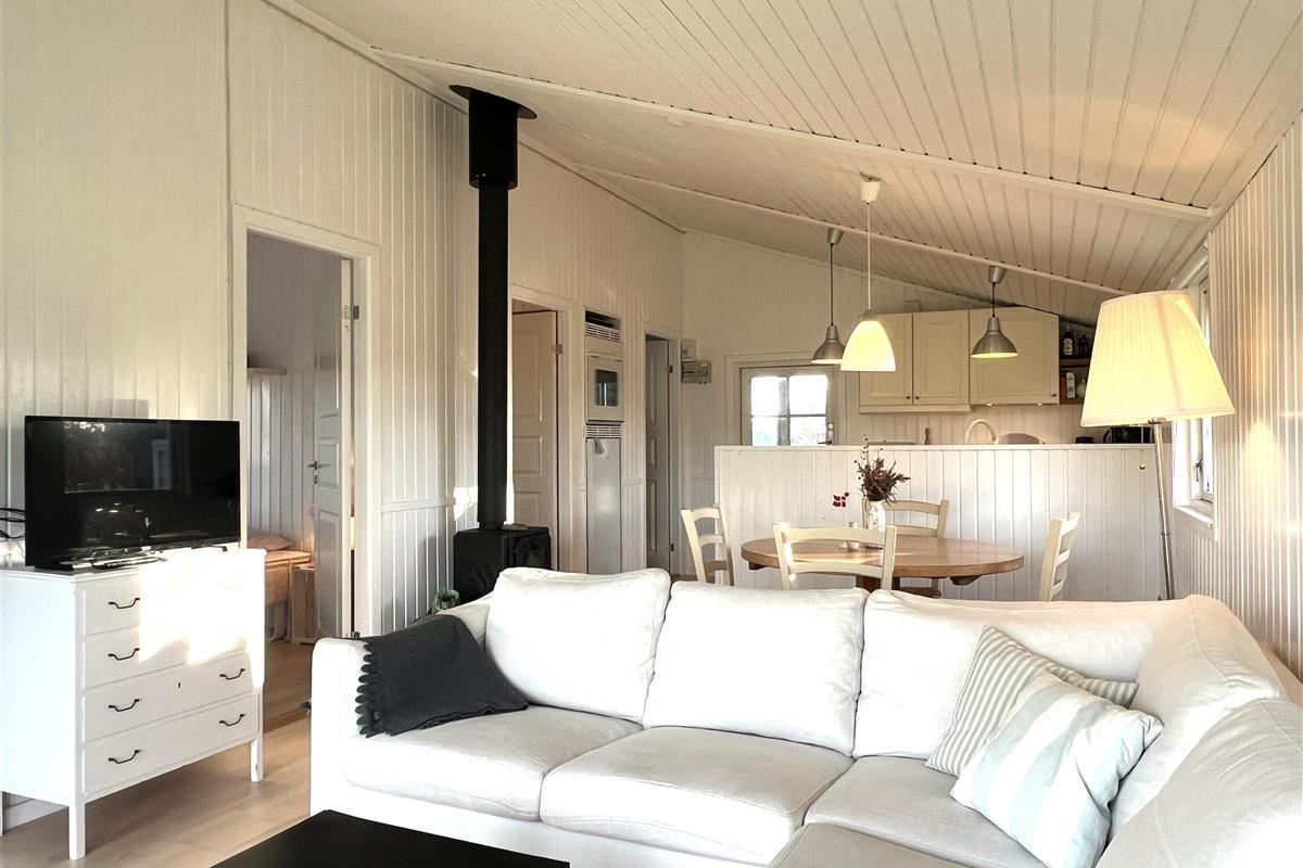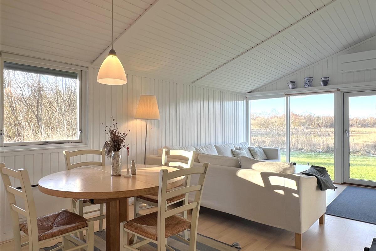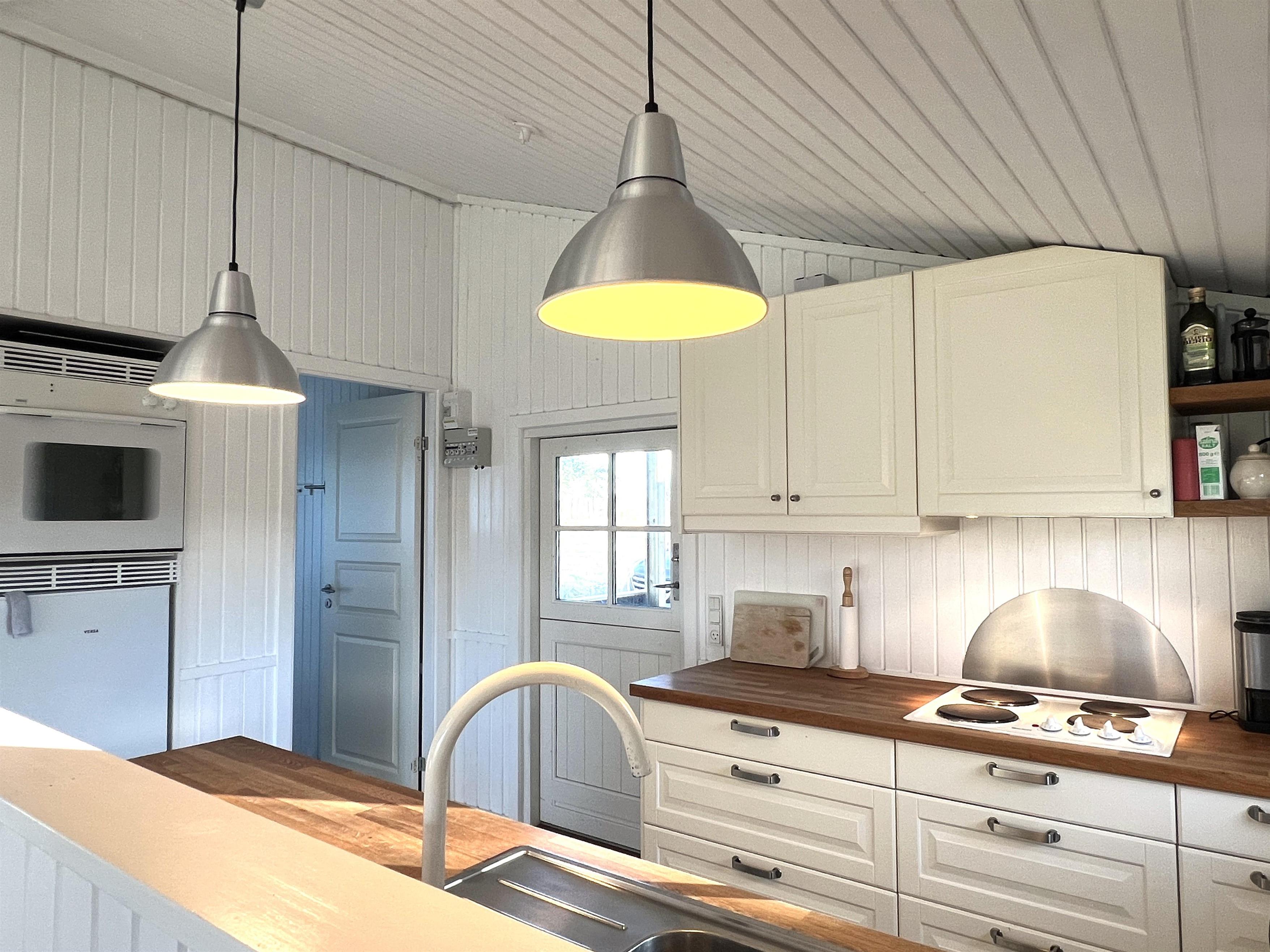 Das Haus verfügt über eine schöne Küche in offener Verbindung zum Wohnzimmer, die über ein wirklich schönes Licht verfügt und sowohl mit einem Holzofen als auch mit einer Wärmepumpe beheizt wird. Vom Wohnzimmer aus haben Sie Zugang zur Terrasse, wo Sie die wunderschöne Natur und Tierwelt hautnah erleben können. Hier kann der Grill genutzt werden, während man bis in den Abend hinein den Sonnenuntergang genießen kann. Zwei gute Schlafzimmer mit Doppelbetten, eines davon mit eigenem Ausgang. Zusätzlich ein extra Zimmer/Kontor mit einem Bett. Badezimmer mit Dusche. Im Nebengebäude gibt es einen Gefrierschrank.