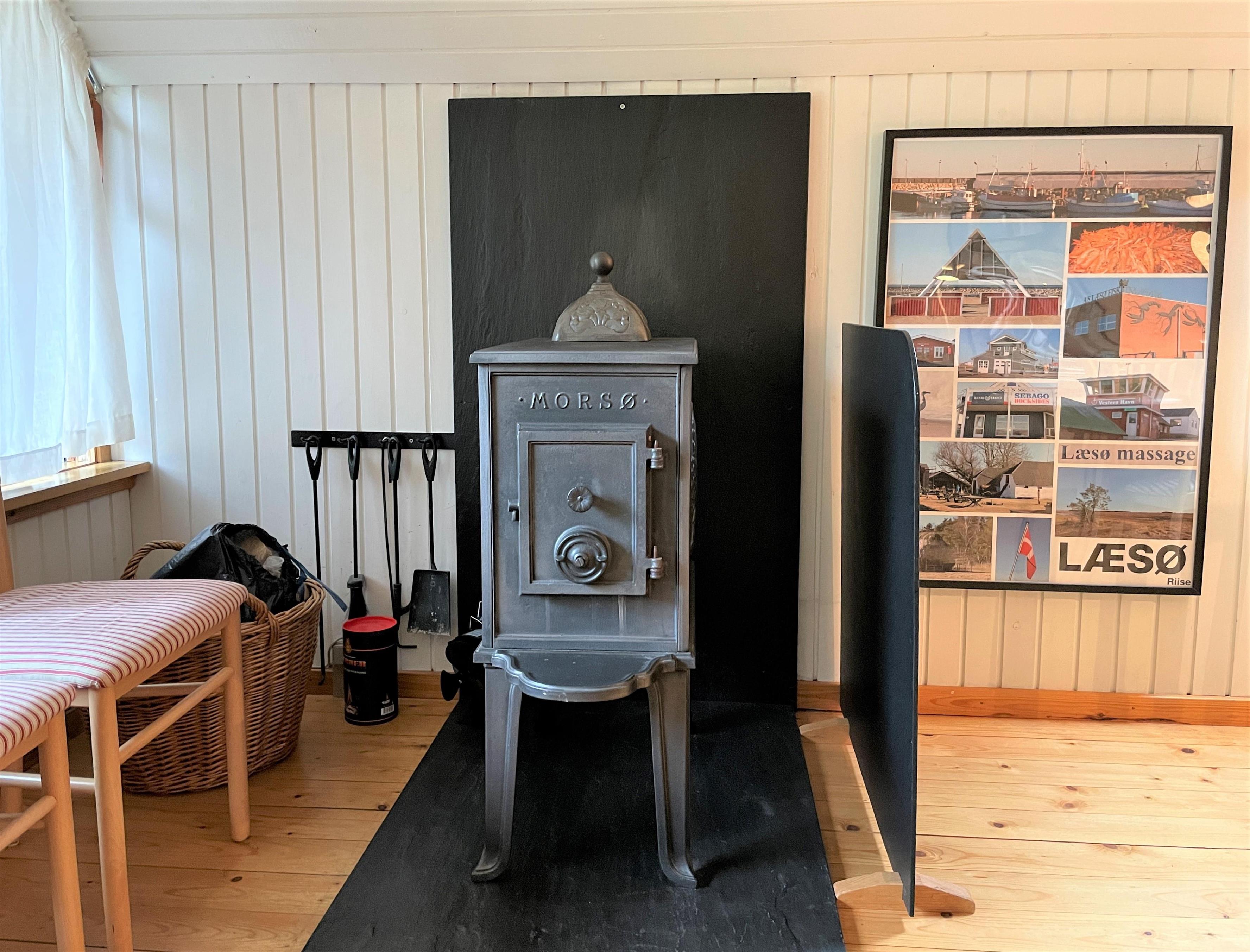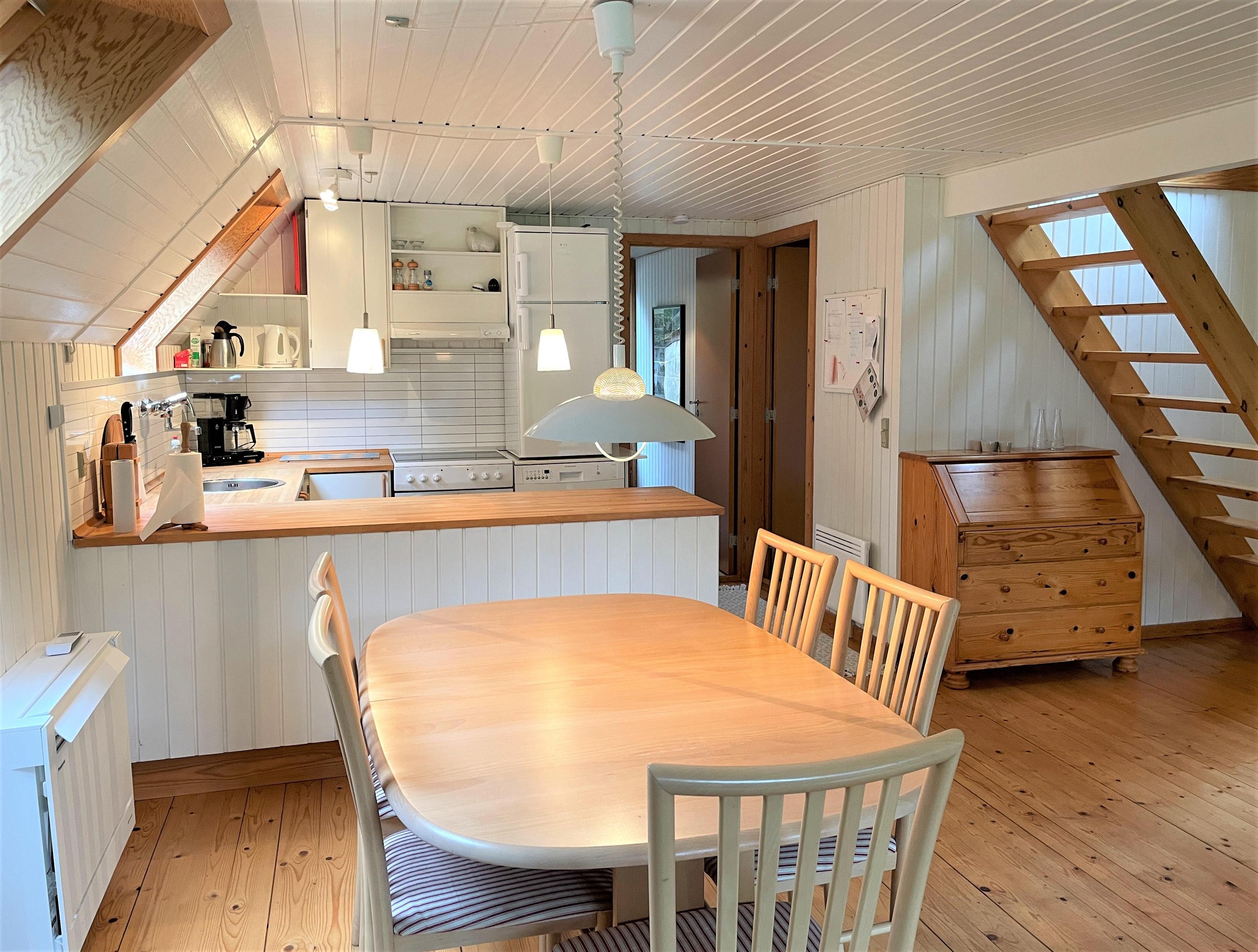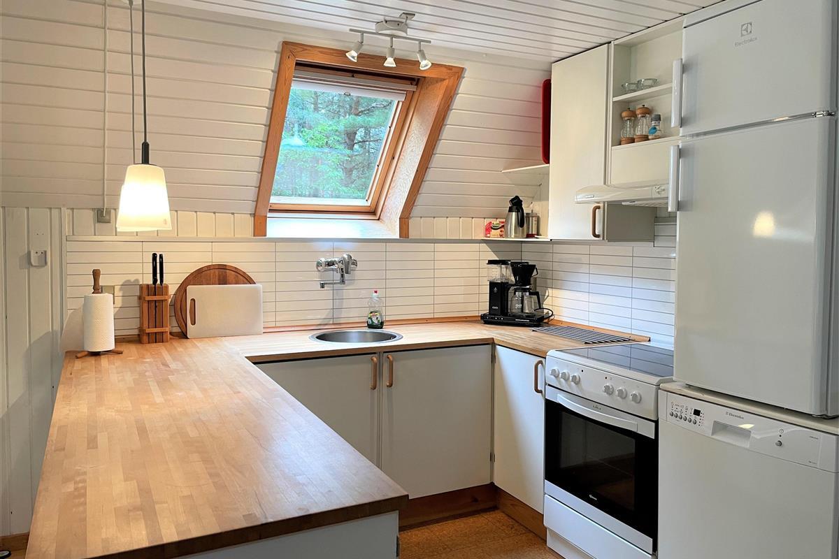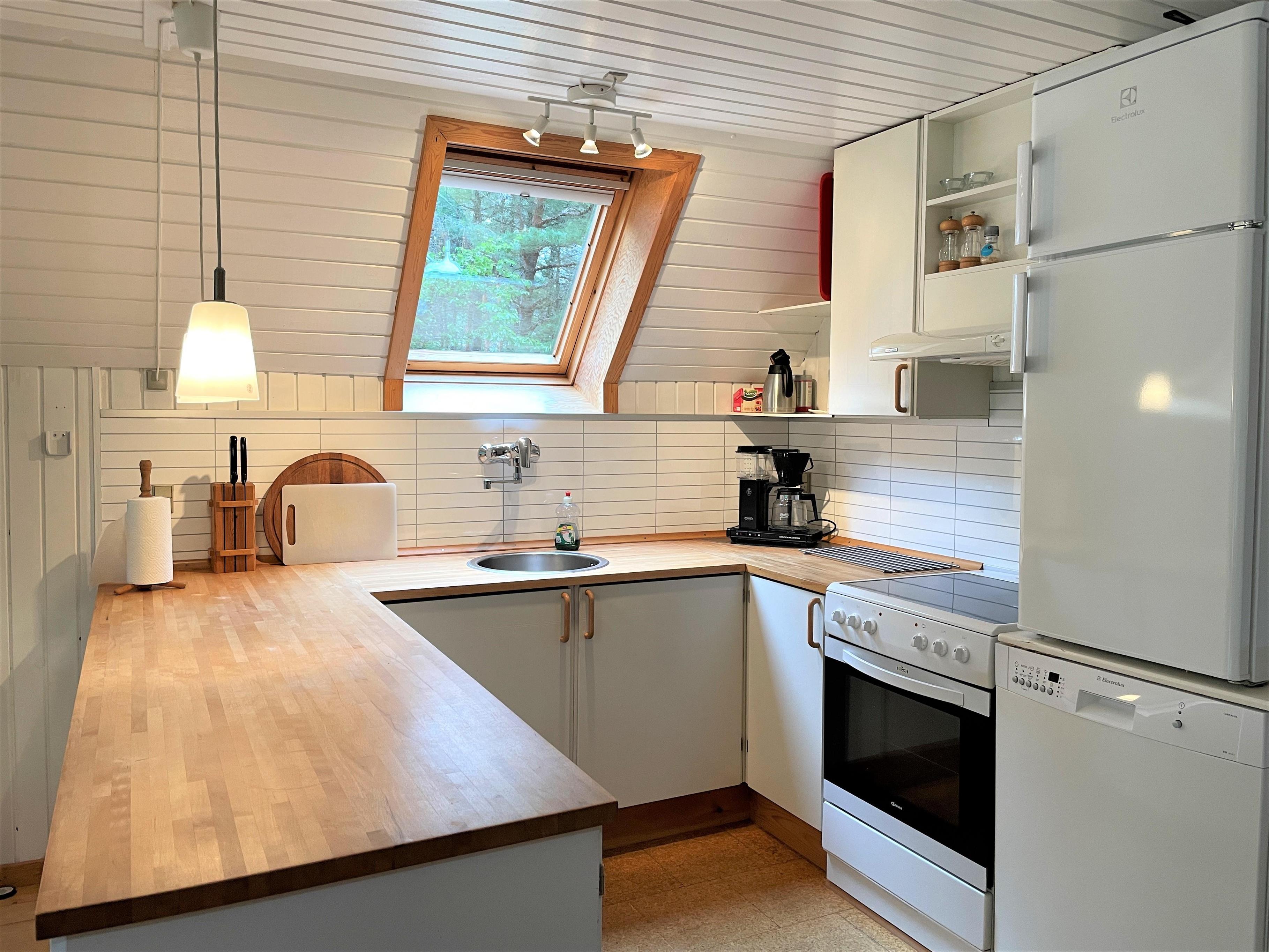 Das Haus hat eine gute Küche mit Esstisch, Wohnzimmer mit guten Möbeln und Kaminofen.