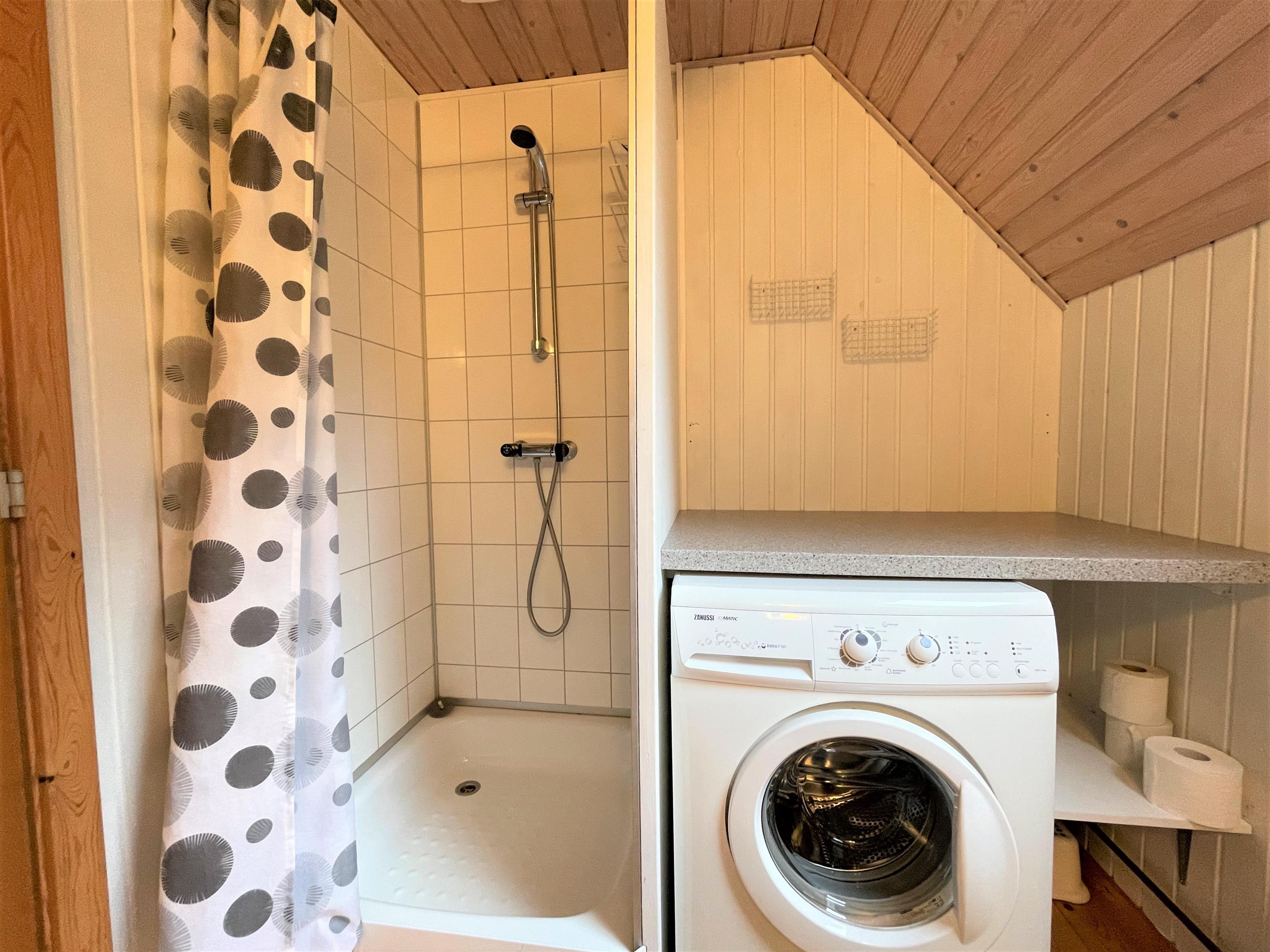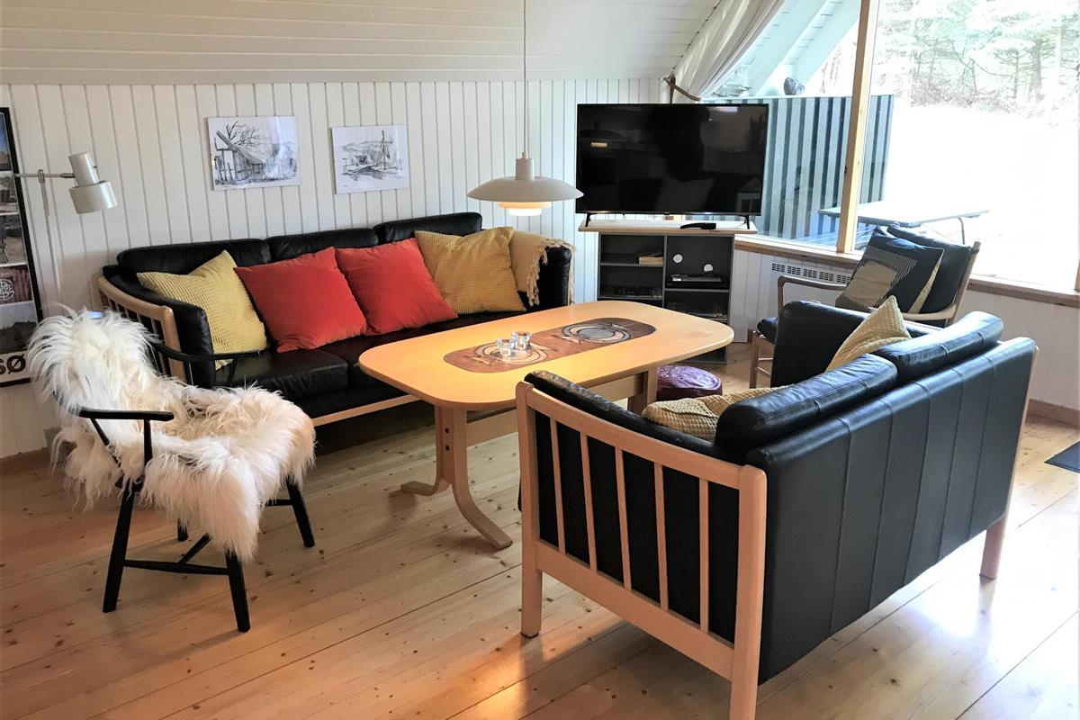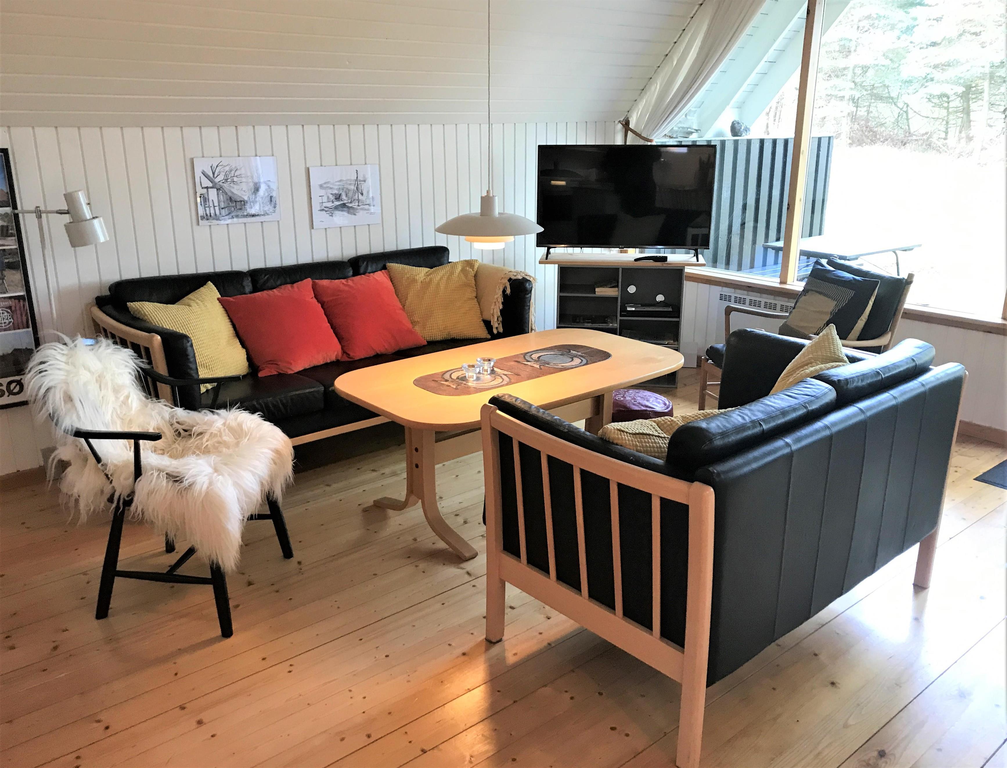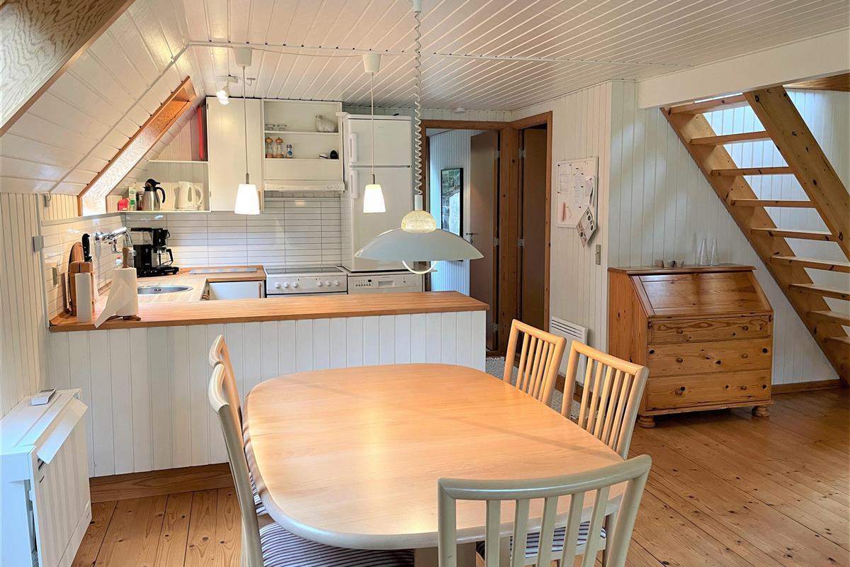 Das Haus hat eine gute Küche mit Esstisch, Wohnzimmer mit guten Möbeln und Kaminofen.