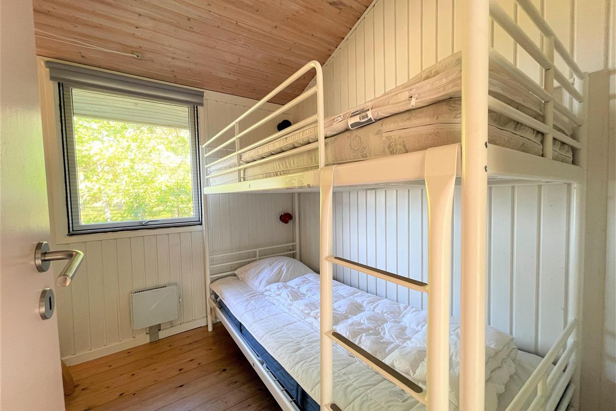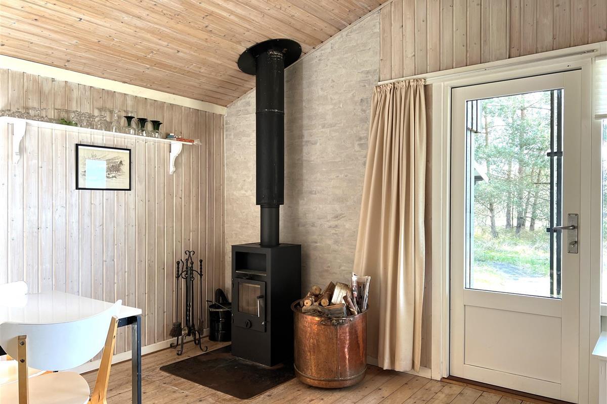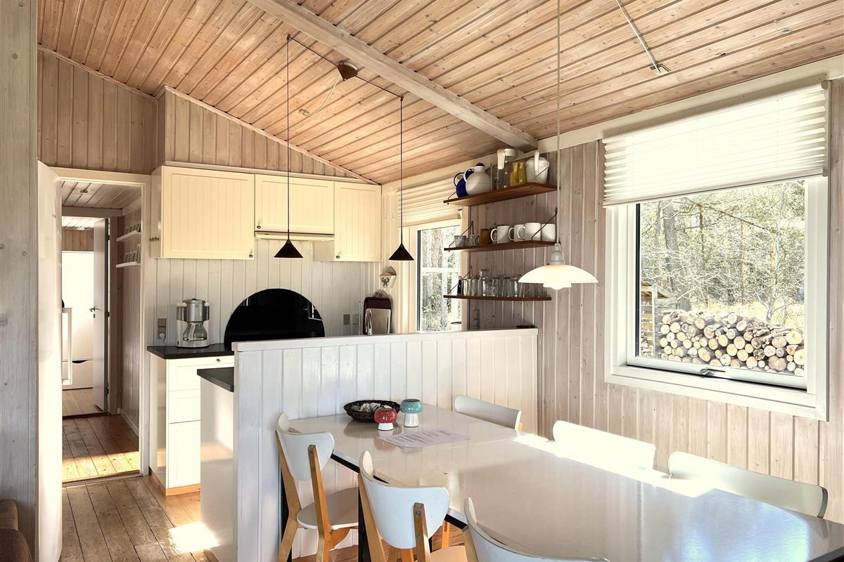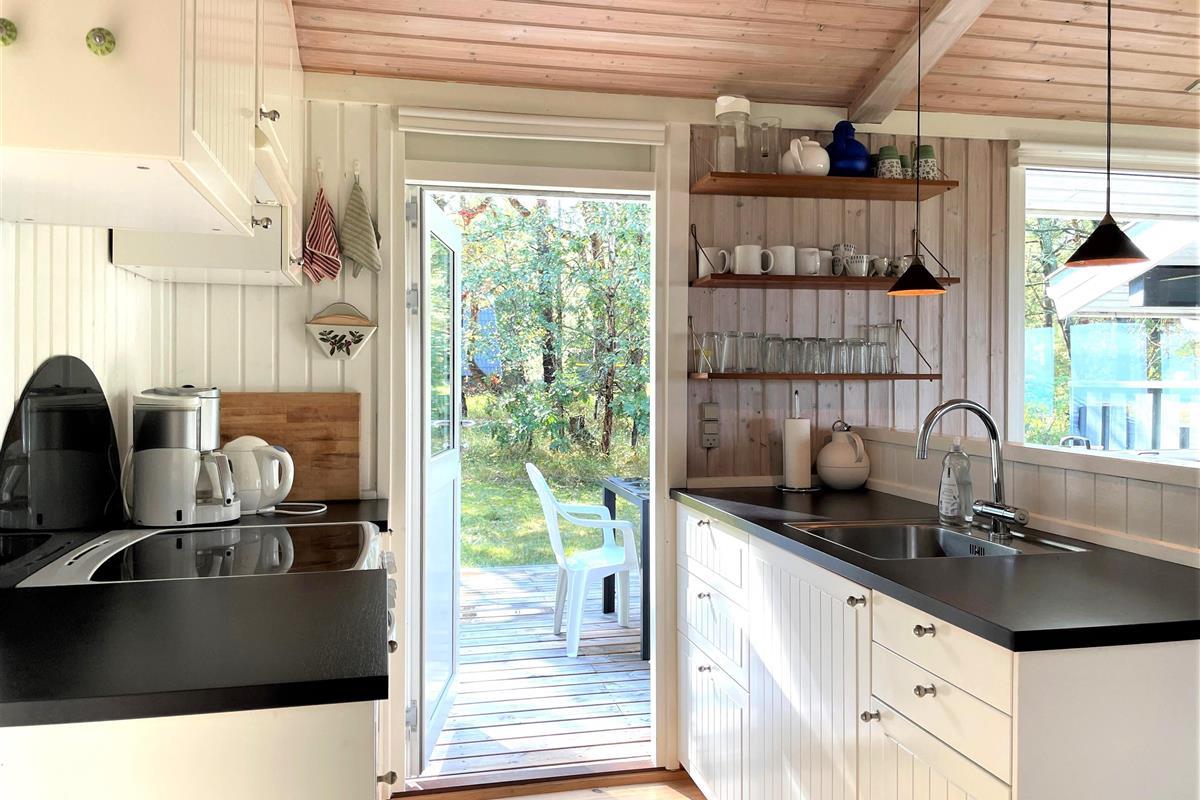 Das Haus ist hell und freundlich eingerichtet. Die funktionale, schöne Küche bietet Zugang zu einer Holzterrasse. Die Küche liegt in Verbindung mit dem Esszimmer und dem Sofabereich mit Holzofen und einem weiteren Zugang zu einer Holzterrasse. Die großen Fenster zum Wasser sorgen für angenehmes Licht in den Gemeinschaftsräumen. Das Haus verfügt außerdem über drei Schlafzimmer: eines mit Doppelbett und Zugang zu einer Holzterrasse, eines mit Etagenbett. In Verlängerung des Wohnzimmers befindet sich ein weiteres Zimmer mit einem Doppelbett (Größe 140). Kleines, schönes Badezimmer.