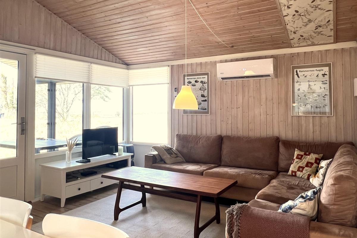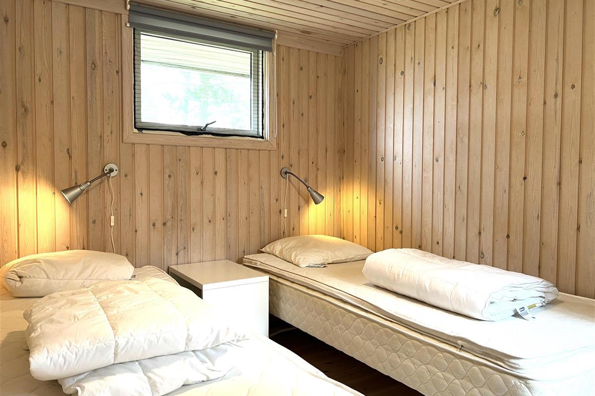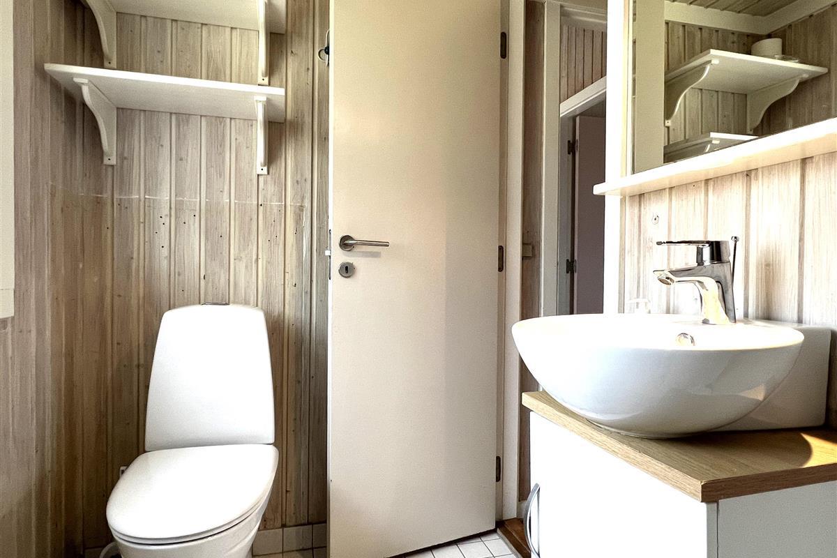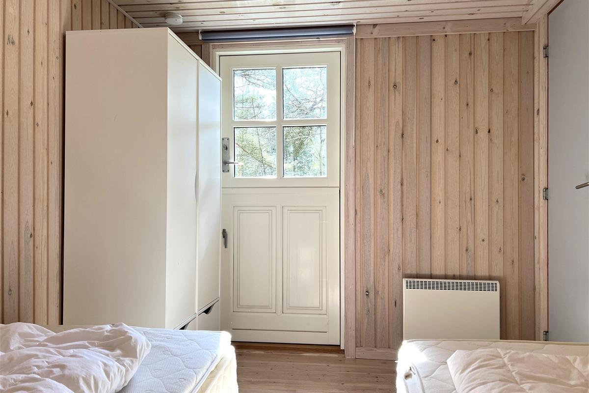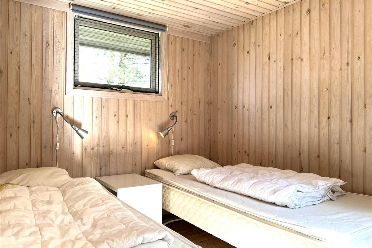 Das Haus ist hell und freundlich eingerichtet. Die funktionale, schöne Küche bietet Zugang zu einer Holzterrasse. Die Küche liegt in Verbindung mit dem Esszimmer und dem Sofabereich mit Holzofen und einem weiteren Zugang zu einer Holzterrasse. Die großen Fenster zum Wasser sorgen für angenehmes Licht in den Gemeinschaftsräumen. Das Haus verfügt außerdem über drei Schlafzimmer: eines mit Doppelbett und Zugang zu einer Holzterrasse, eines mit Etagenbett. In Verlängerung des Wohnzimmers befindet sich ein weiteres Zimmer mit einem Doppelbett (Größe 140). Kleines, schönes Badezimmer.