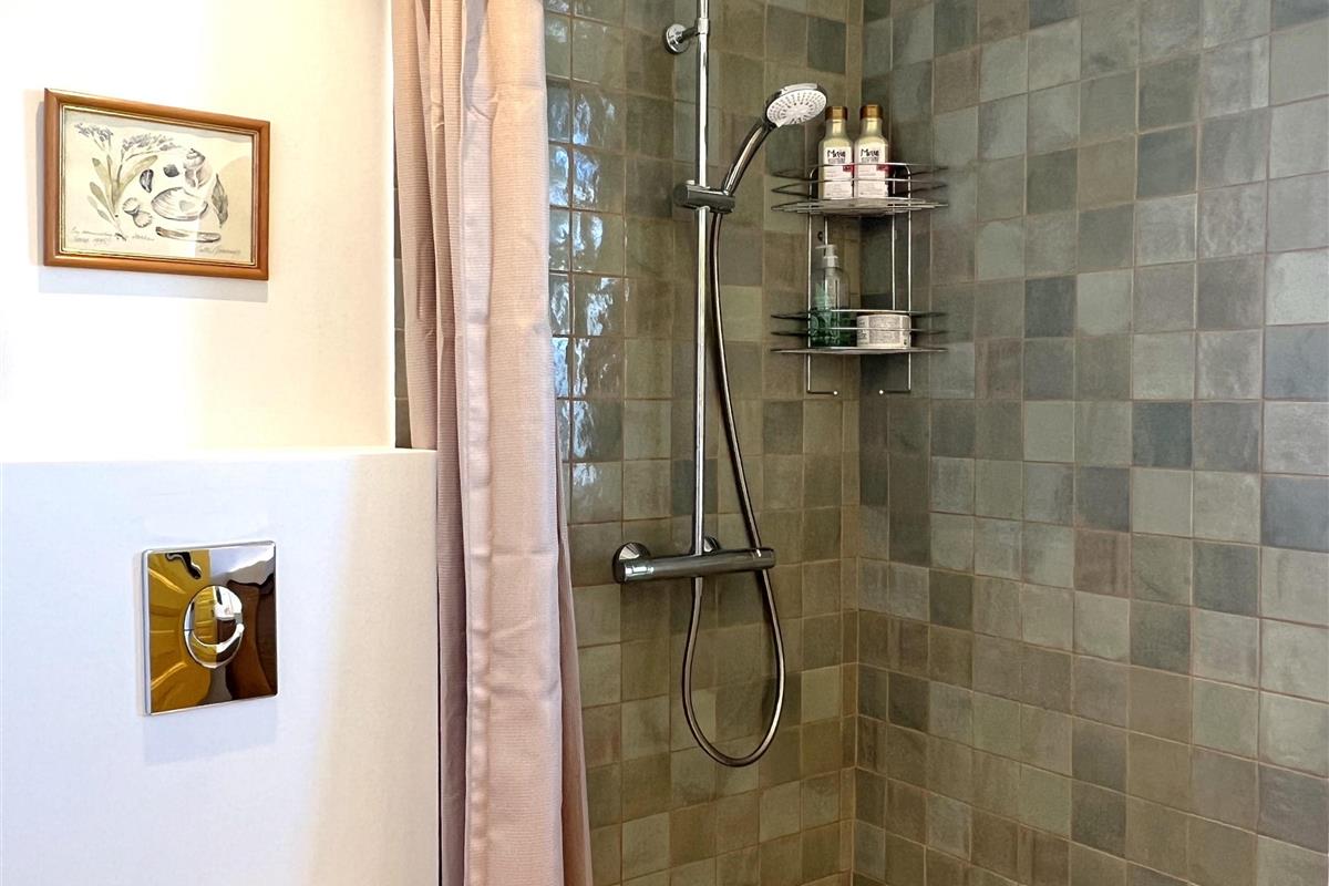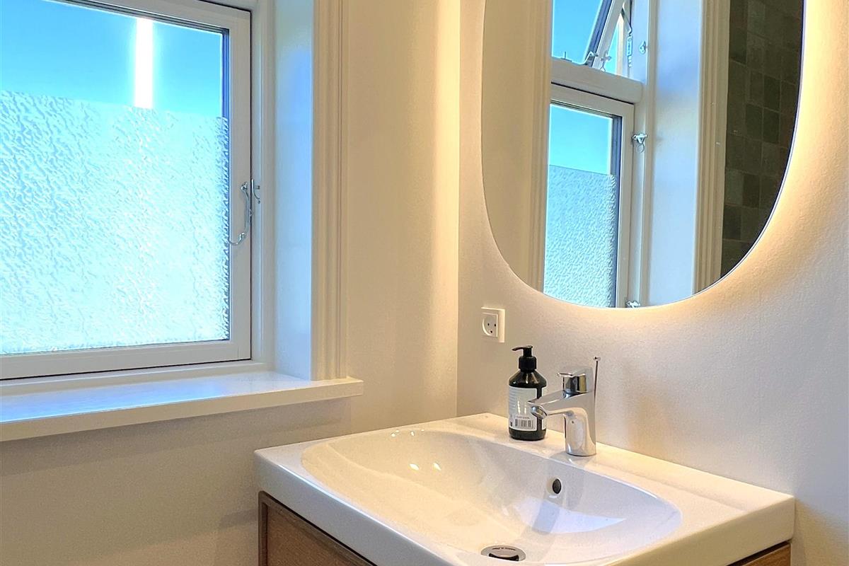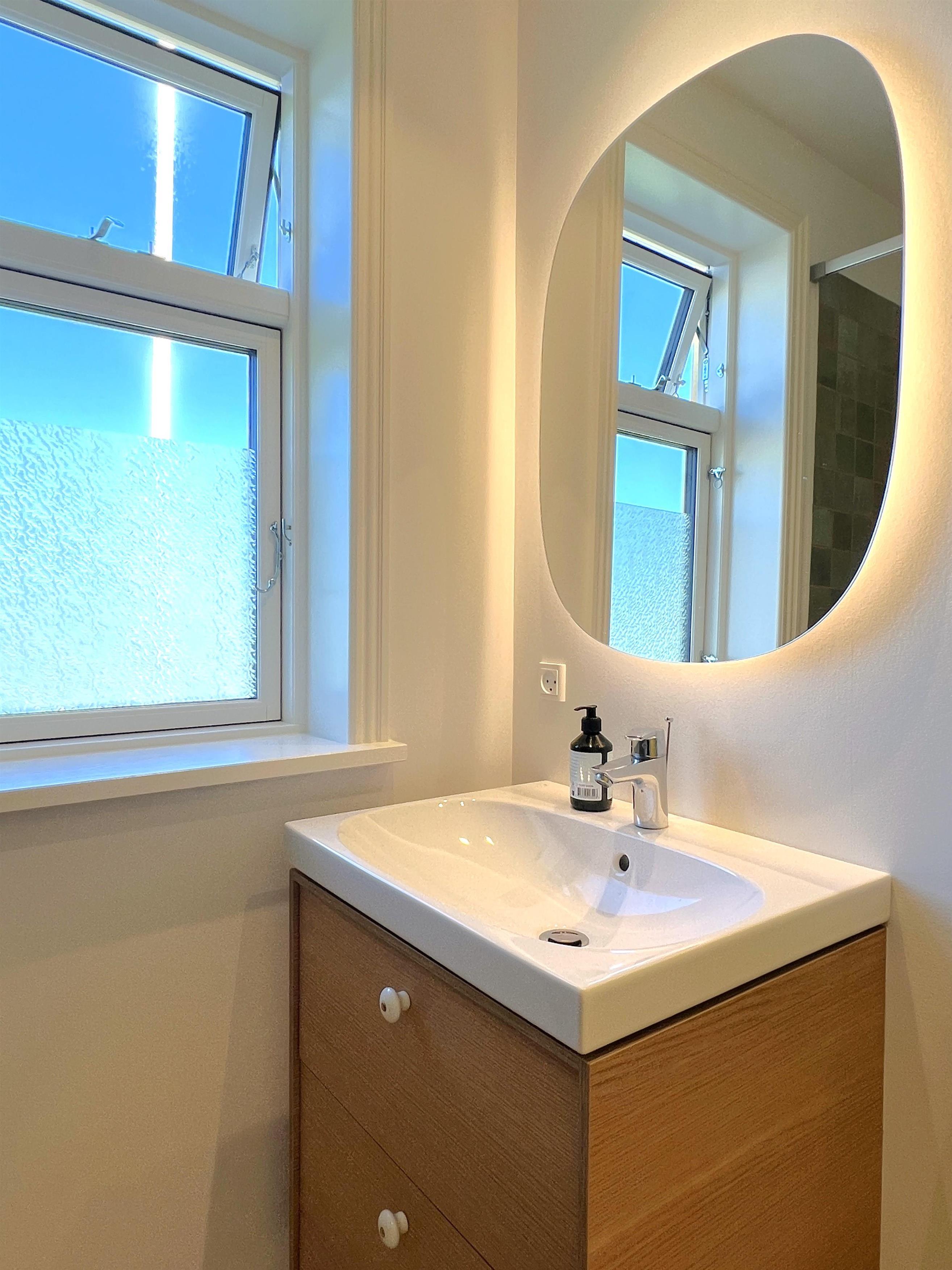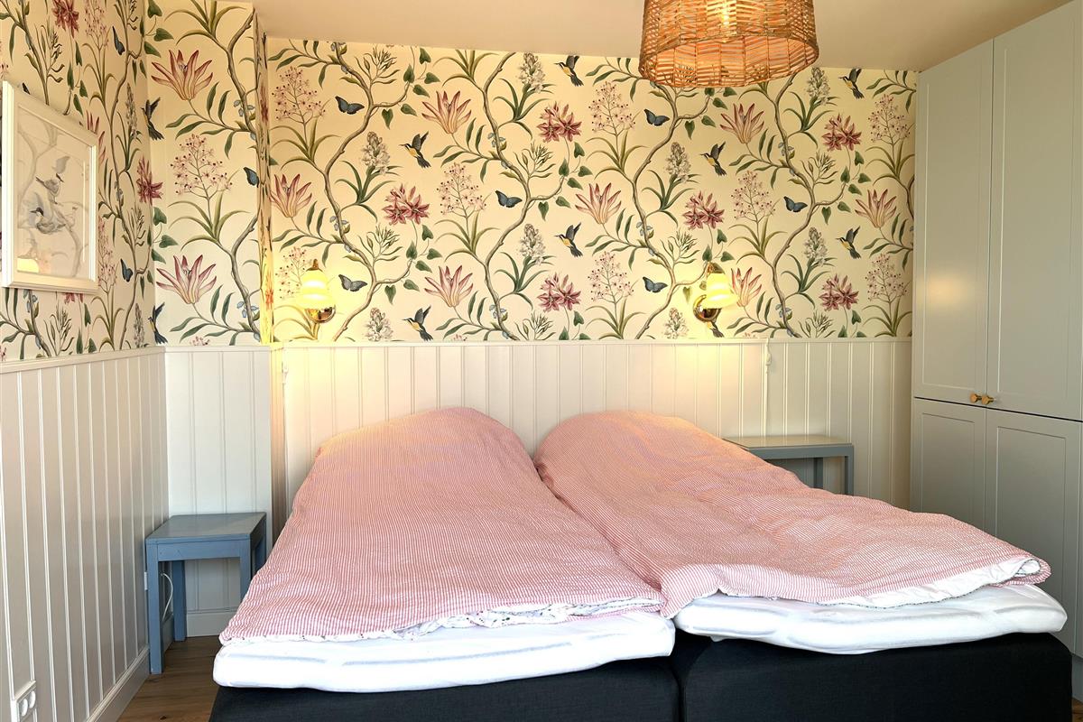 Es gibt ein großes Schlafzimmer mit einem Doppelbett und sehr viel Stauraum. Das Schlafzimmer hat, wie die anderen Zimmer im Haus, seinen eigenen charmanten Stil und Sie wachen mit der schönsten Aussicht über das Kattegat auf. Schönes neues Badezimmer mit Dusche.