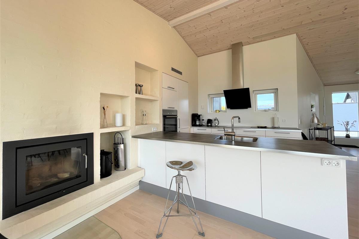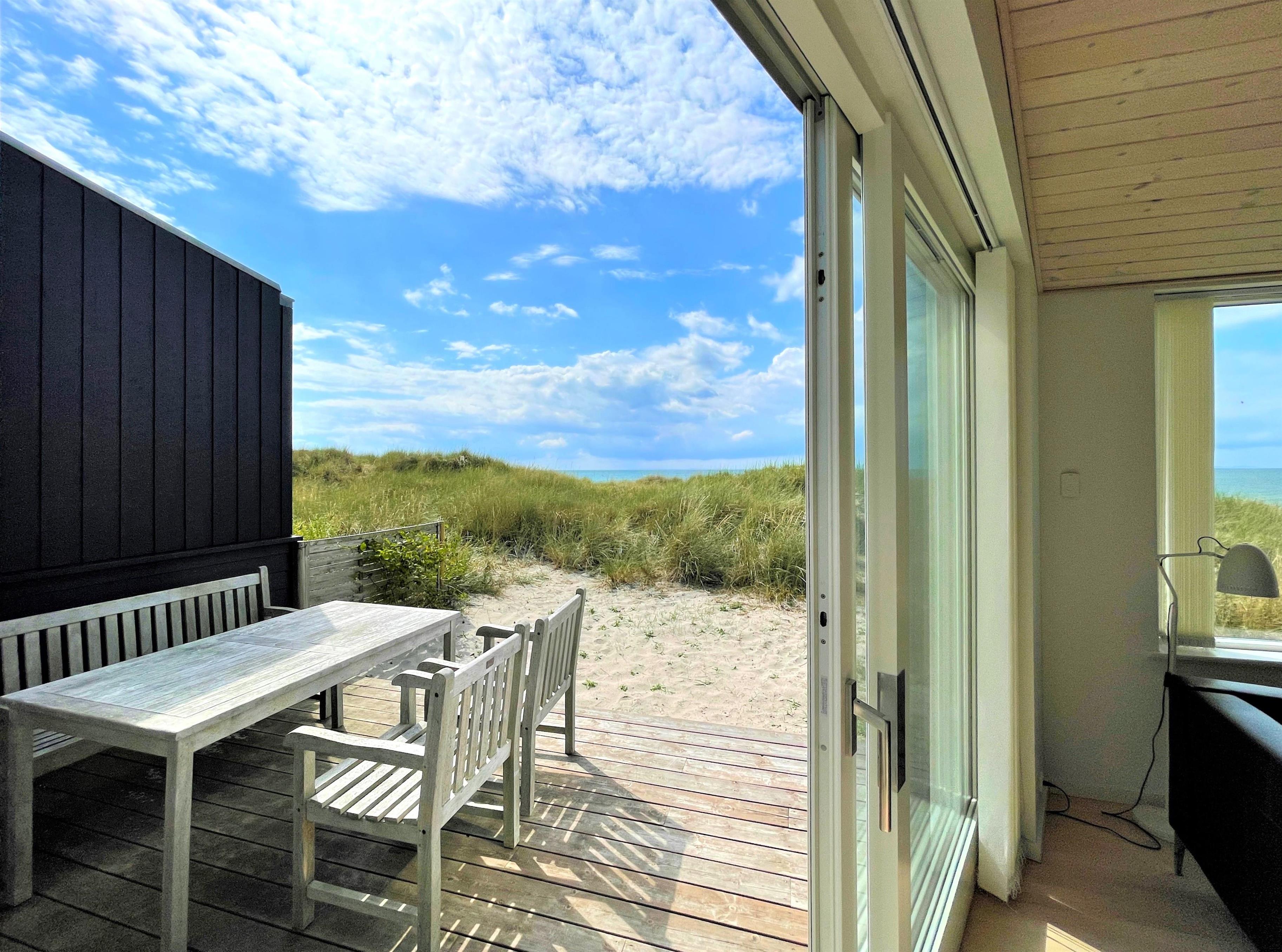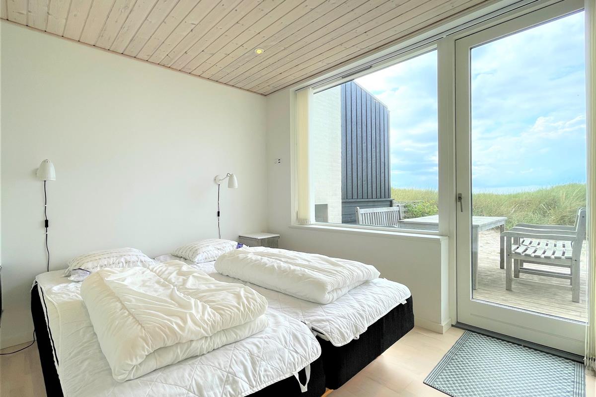 und Sofaecke mit einem eingebautem Kamin in der Wand. Das Haus hat 2 Schlafzimmer , eins mit Doppel und eines mit 2 Einzelbetten. Vom Schlafzimmer mit Doppelbett und vom Wohnzimmer, gibt es einen Ausgang zur Terasse mit Panoram-Meersicht. Via Ausgang steht man direkt inmitten von Strandgräser und Heckenrosen. Auf der Terrasse befindet sich einen Aussenkamin und bequemen Gartenmöbeln. Eine nach Osten gewandte Terrasse auf der einen Seite des Hauses. Grosses helles Badezimmer mit Dusche.