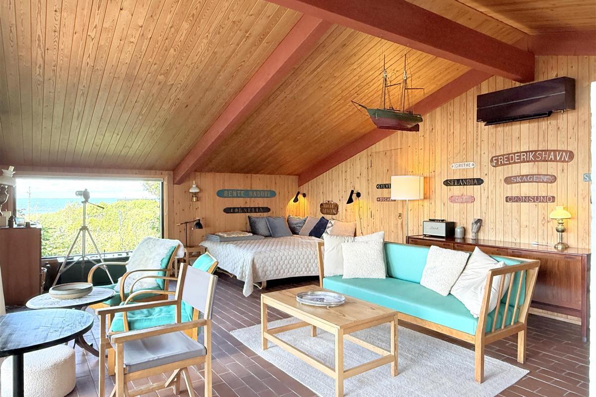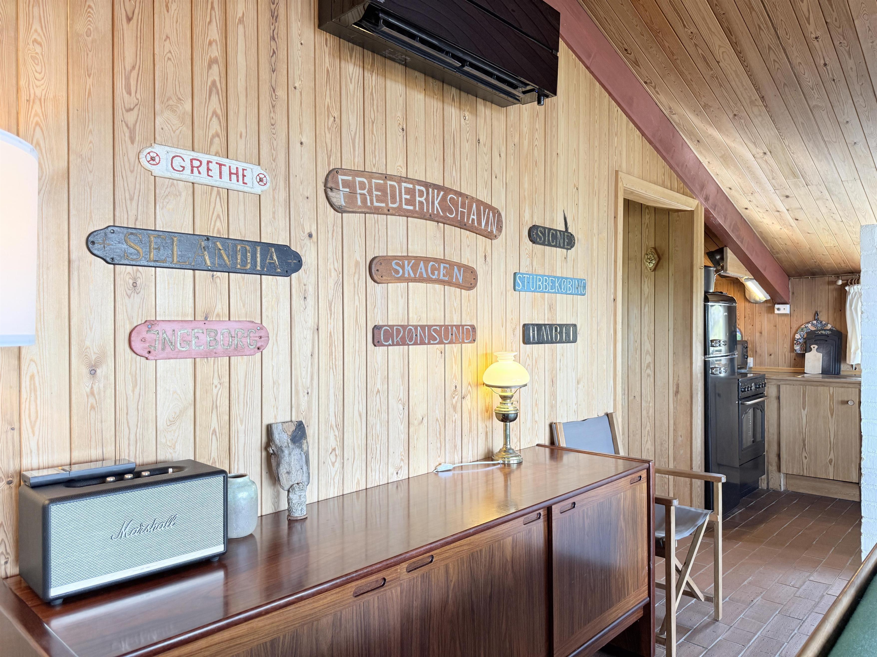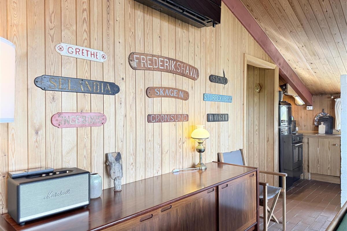 Die alten Bootstafeln schmücken die Wände, das es das Ferienhaus zu einem gemütlichem Ort macht. Der Garten ist uneinsehbar, mit einer überdeckten Terrasse Richtung Meer, das gibt die Garantie für gemütliche Stunden und Ferien-erlebnisse. Das Essen können sie auf einem Kohlen oder Gasgrill zubereiten, und geniessen. Und am Abend können die Lichter von Frederikshavn und der Führturm von Rønnerne das Gemüt zur Ruhe bringen.