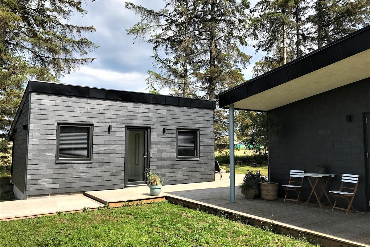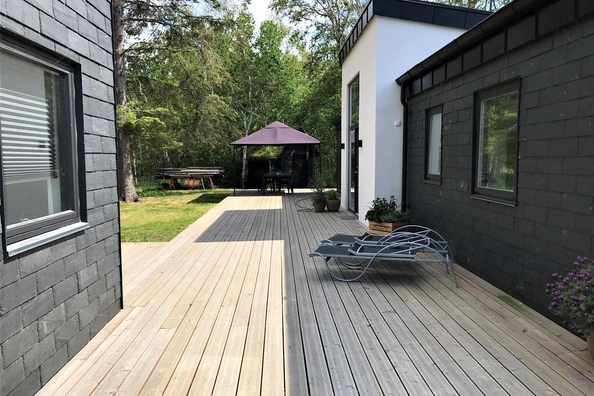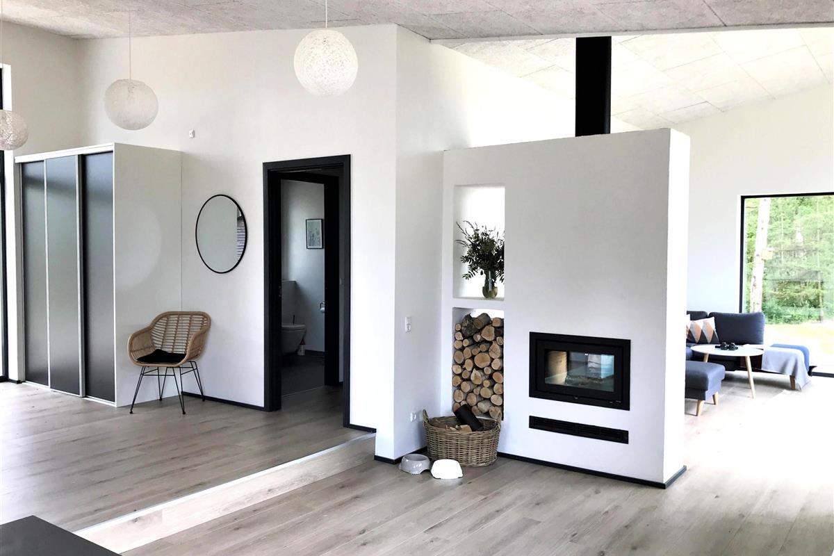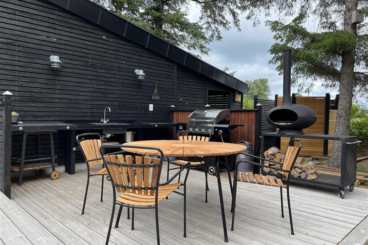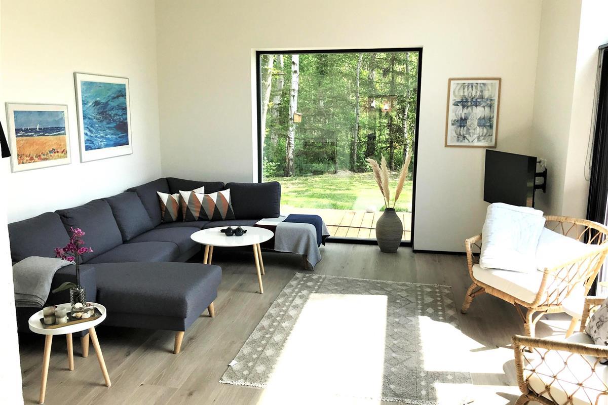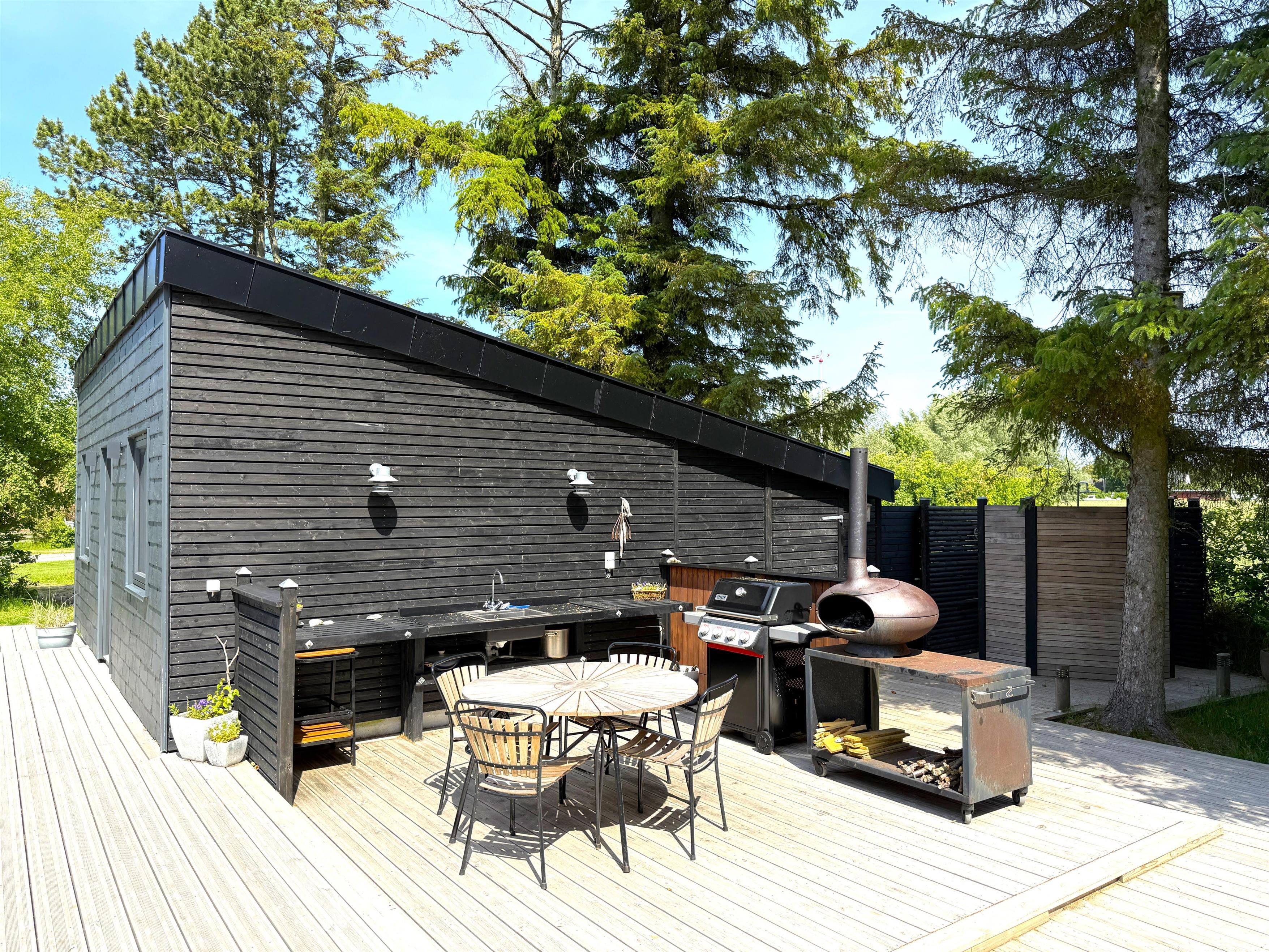 Dieses wunderschöne neugebaute Haus liegt nur 300m vom Strandweg zum Kongestrand. Das Haus besteht aus einem Haupthaus auf 140 kvm, mit 2 Schlafzimmern mit Doppelbetten. Beide Zimmer haben ihr eigenes privates Badezimmer mit Dusche. Das eine Zimmer hat dazu noch einen Ausgang zur Terrasse. Dazu beinhaltet das Haus eine offene äusserst schöne Küche mit Esszimmer und Wohnzimmer mit viel Licht und Platz. Das Haus ist im modernen Baustil, und hat sehr viel Charme. Es hat zum Beispiel einen eingebauten Wandkamin, Aussenküche, Grillplatz und eine überdeckte Terrasse. Neben dem Haus liegt ein Gästehaus auf 30 kvm, das 2 Zimmer beinhaltet. Eins mit Doppelbett, und eines mit ¾ Bett, zudem noch ein Badezimmer mit Dusche. Das Haus ist darum bestens geignet für eine Grossfamilie oder Freundespaare, die gerne zusammen Ferien verbringen wollen. Das Haus ist umrandet mit einer grosszügigen Holzterrasse, und mit vielen Möglichkeiten für Sonnenplätze. Von der Rückseite des Hauses haben sie Aussicht auf Felder und der beginn von Vesterø Stadt. Dieses Haus setzt den Rahmen hoch für einen besonderen Urlaub. Das Haus wird geheizt mit einer Wärmepumpe.