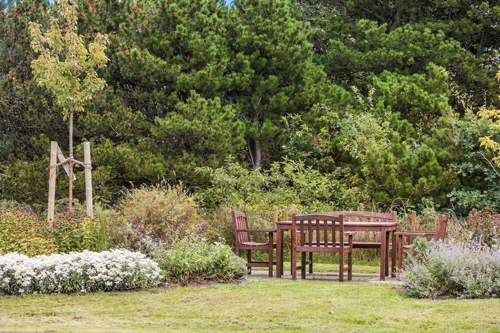 Das Naturgrundstück ist beeindruckend groß, was bedeutet, dass das Haus in guter Entfernung zu den Nachbarn in der schönen Landschaft von Vesterhede liegt. Rund um das Ferienhaus erstreckt sich ein gepflegter Garten, der eine wunderbare Oase mit blühenden Beeten, schützender Bepflanzung und einer schönen Rasenfläche bildet, auf der die Kleinen spielen, Purzelbäume schlagen und den vorbeiziehenden Wolken zusehen können. Wenn die Sonne scheint und die Temperaturen warm und sommerlich sind, können alle Mahlzeiten, von der ersten Tasse Kaffee zum Frühstück bis zum Abendessen, auf der Terrasse serviert werden.