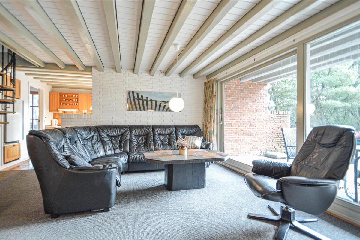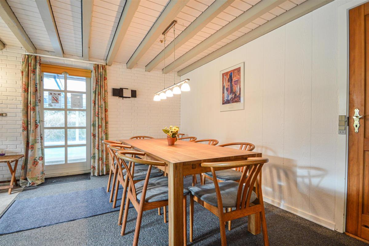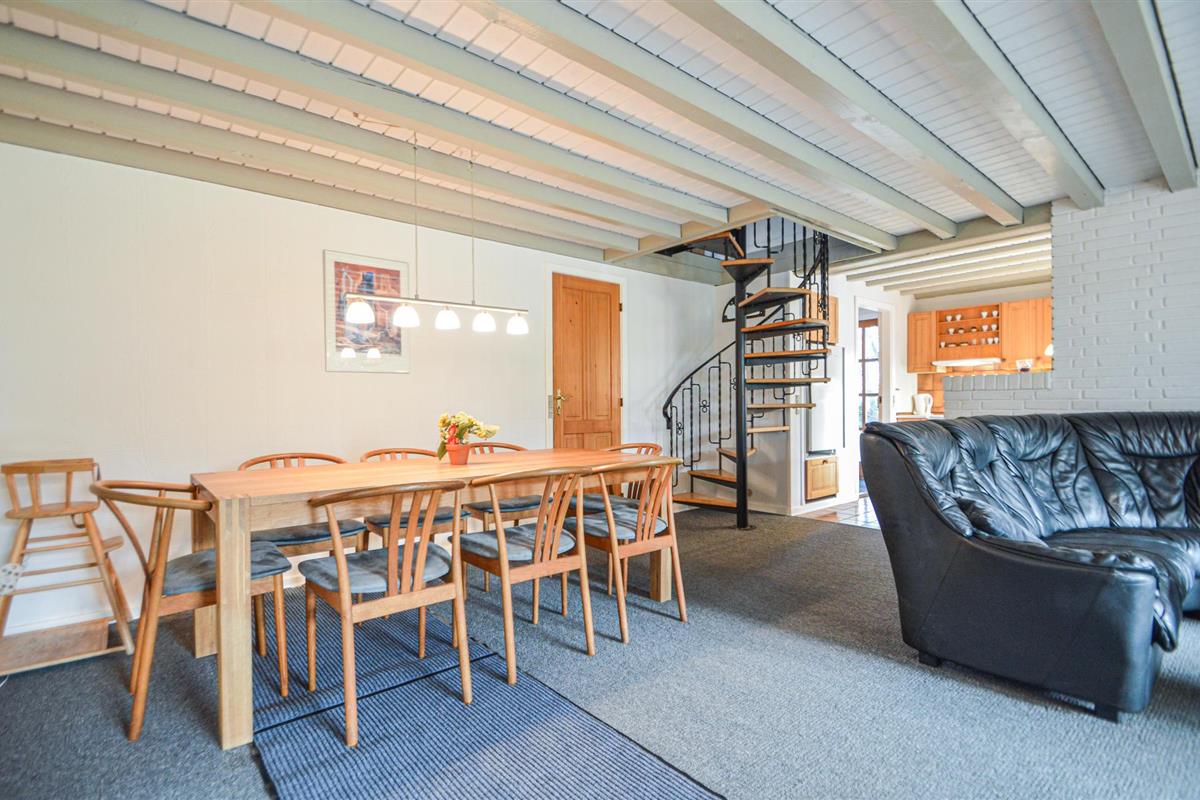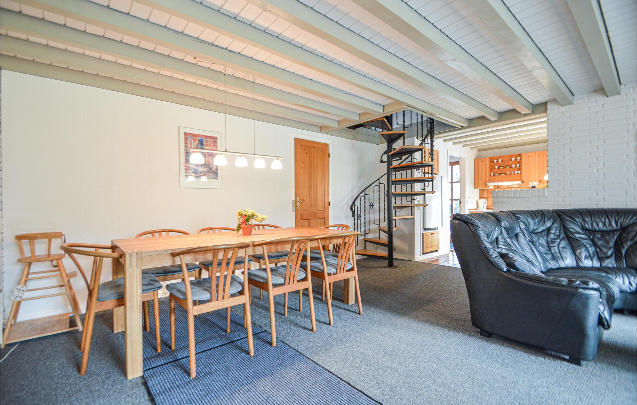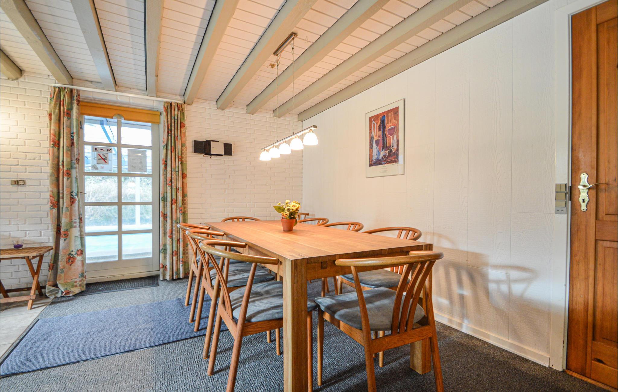Geniet van de rustige sfeer van dit vakantiehuis met twee verdiepingen op een groot natuurperceel, omgeven door bomen en frisse Noordzeelucht. Kom binnen in de gezellige woonkamer, die een houten plafond heeft, grote ramen en een houtkachel voor gezellige warmte. Maak het jezelf gemakkelijk op de bank, lees een boek of kijk 's avonds een film. In de aangrenzende keuken, die in open verbinding staat met de woonkamer, kun je in een ontspannen sfeer je maaltijden bereiden. De eethoek biedt ruimte voor iedereen, ideaal voor lange spelletjesavonden of gezamenlijke maaltijden.