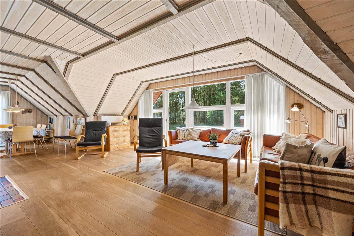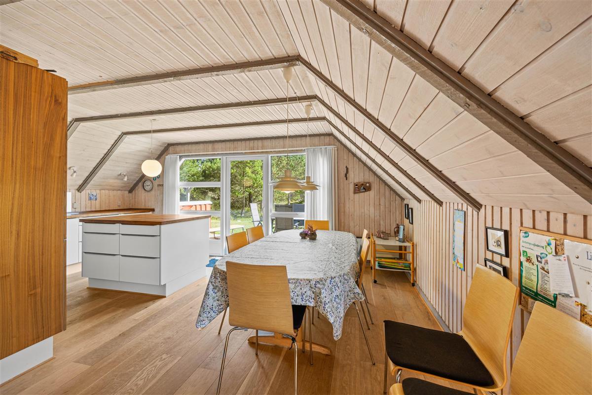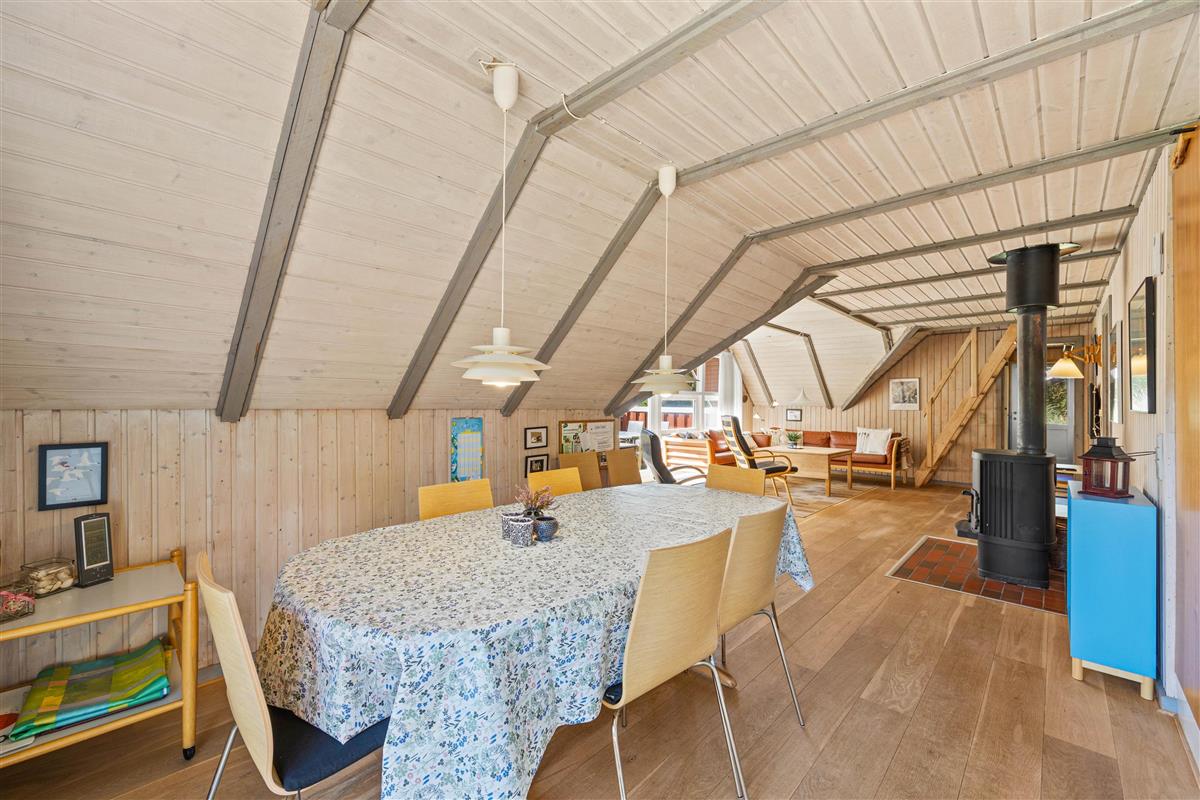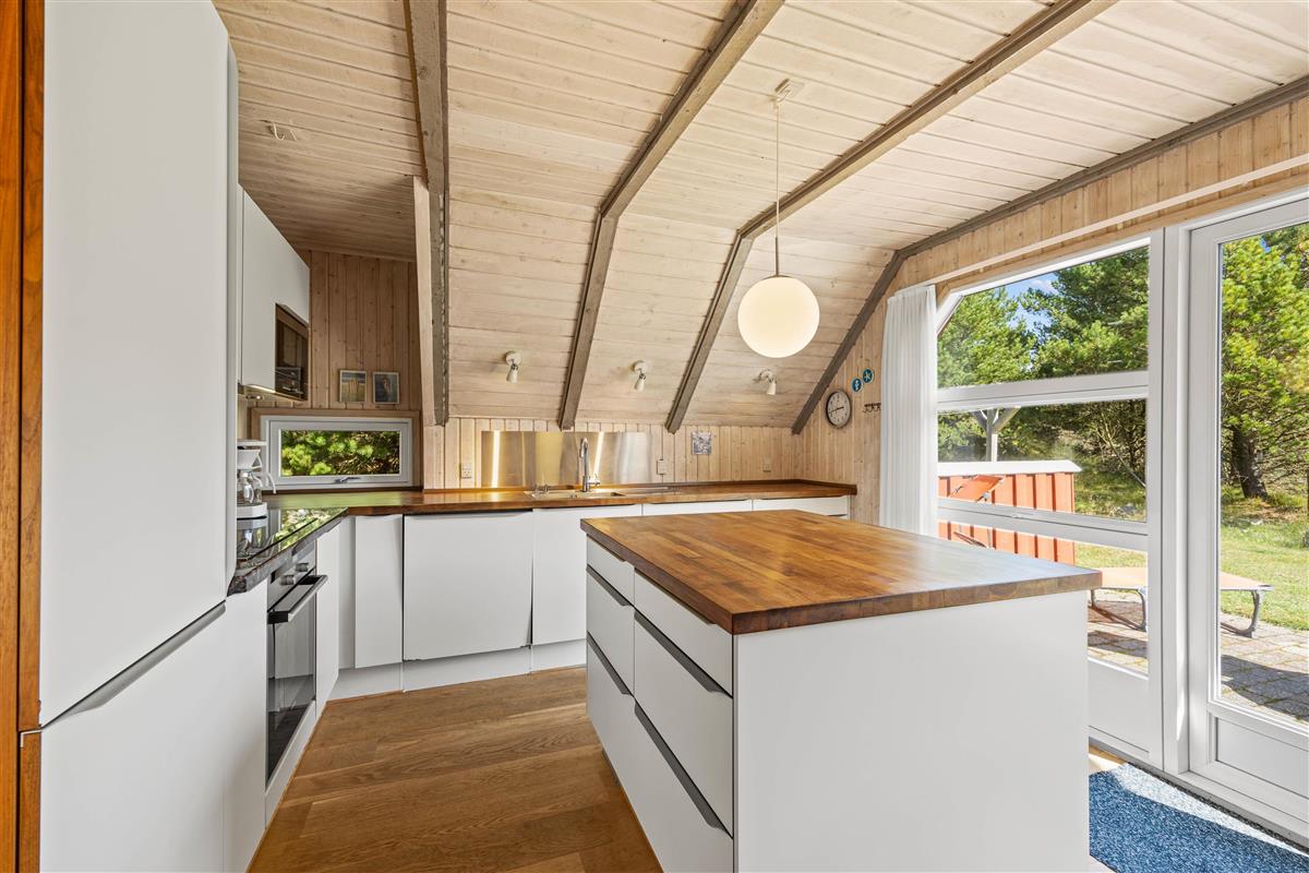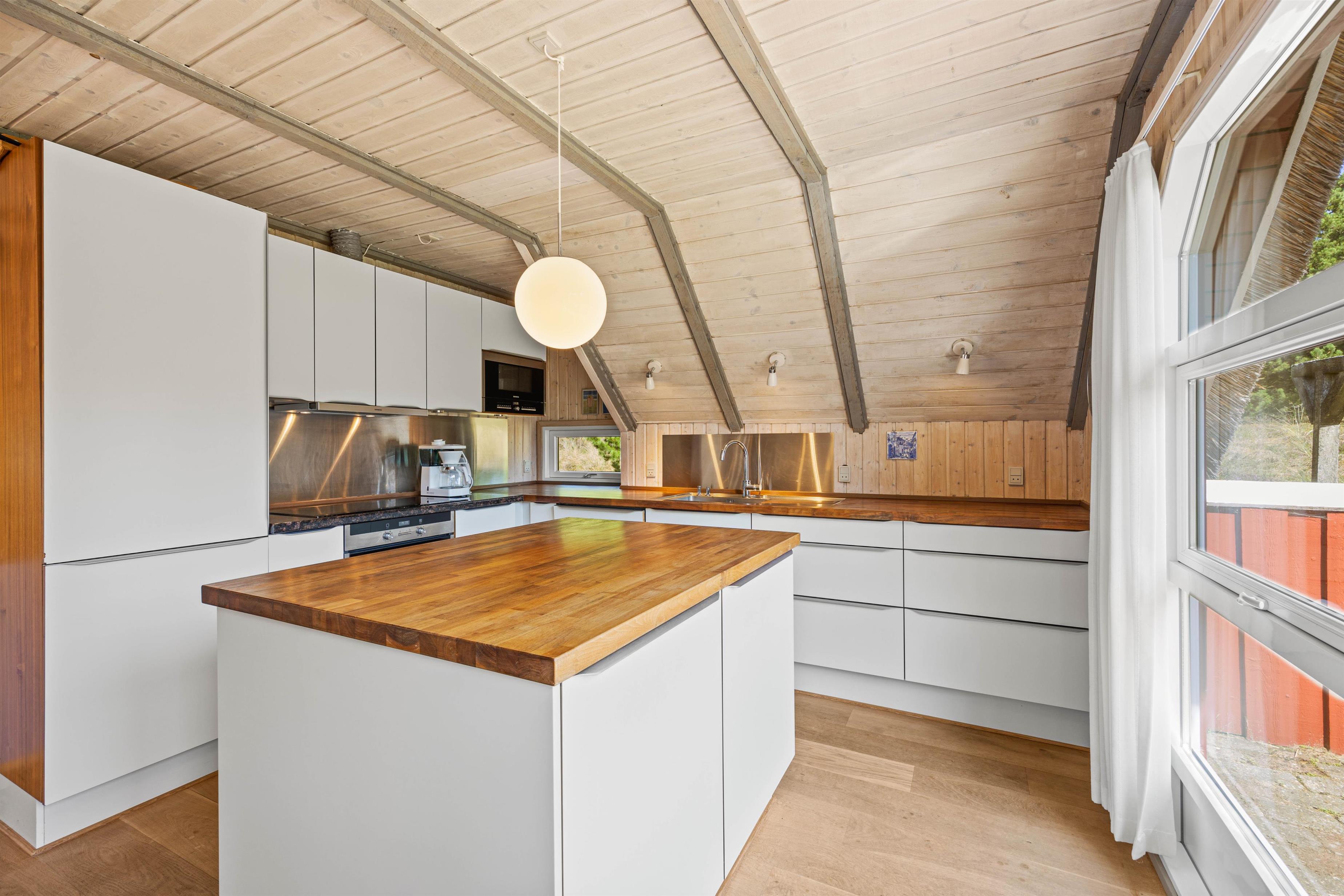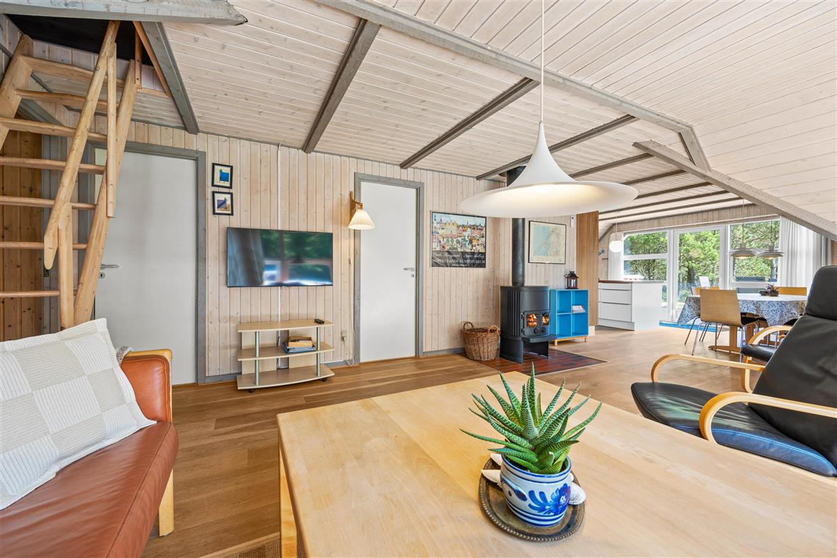 Following the hallway leads you to the living area, featuring numerous windows. The light wood and low ceilings create an immediate sense of cosiness. Here you can relax on the sofa, enjoy a glass of wine, and listen to the crackling of the wood-burning stove. In the evening, cook together in the modern kitchen - perhaps try your hand at traditional Danish recipes.