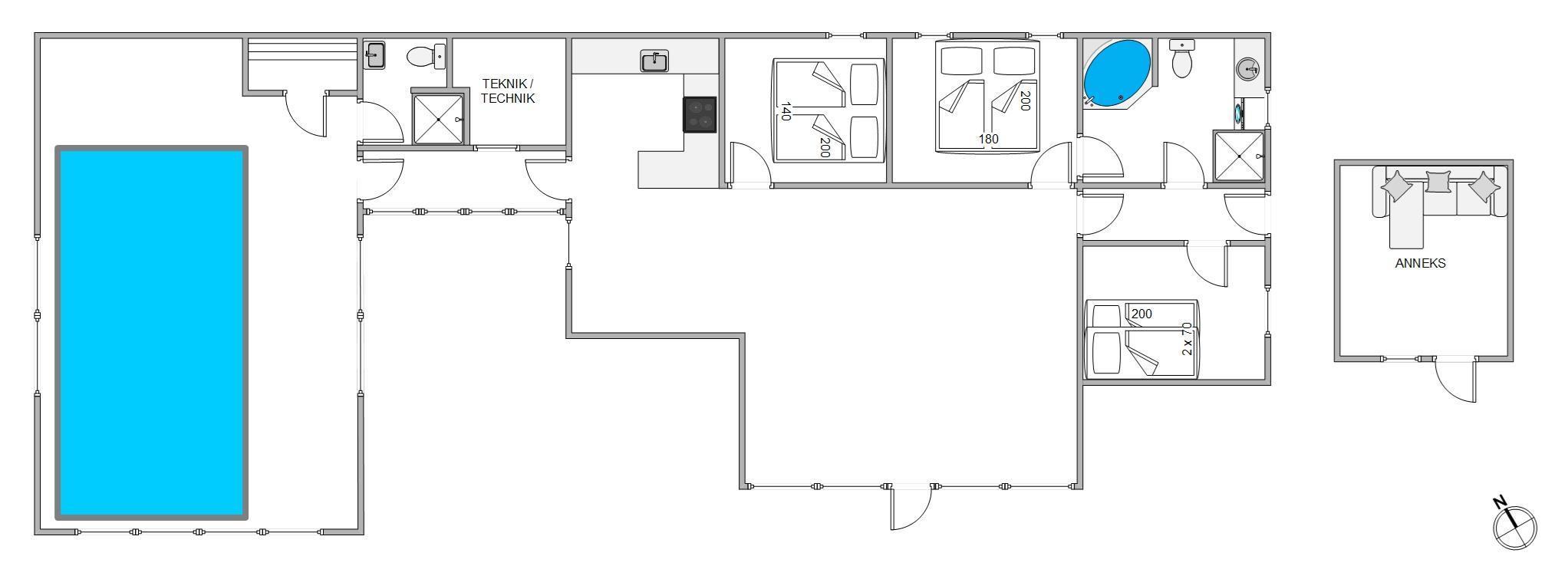 This spacious house offers 185 square metres of living space, comfortably accommodating 6 adults and 2 children or teenagers. The bright kitchen with dishwasher opens onto the dining area and living room. The living area features comfortable seating and a wood-burning stove which, alongside the energy-efficient heat pump, provides cosy warmth during the cooler months. The pool room houses a 20-square-metre swimming pool, offering fun and relaxation for all ages. The pool water is pleasantly heated - a heat pump helps reduce electricity consumption. You might also enjoy a relaxing water massage in the hot tub, while the sauna provides additional wellness benefits.