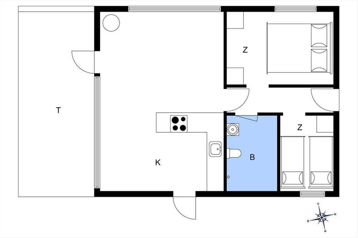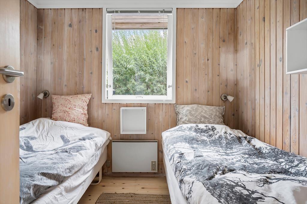 Dieses Ferienhaus strahlt Gemütlichkeit und Geselligkeit aus und bietet Platz für bis zu 4 Personen in zwei Schlafzimmern. Die Schlafzimmer haben viel Stauraum und Fenster mit Blick auf den grünen Garten. Ein Schlafzimmer hat ein bequemes Doppelbett, während das andere, etwas kleinere Zimmer zwei Einzelbetten hat. Neben den Schlafzimmern befindet sich das Badezimmer, das hell und funktional mit Stauraum, einer Dusche und Fußbodenheizung ausgestattet ist.
