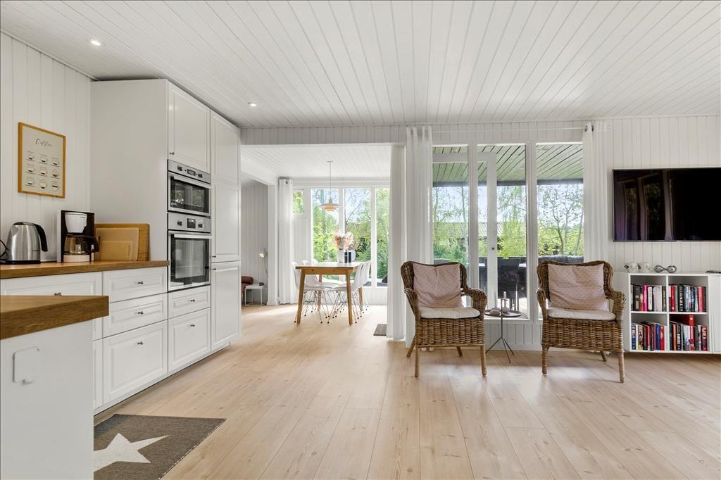 Draußen erwartet dich eine große, teils überdachte Holzterrasse, auf der du den ganzen Tag Sonne und Schatten genießen kannst. Der umliegende Garten bietet viel Platz zum Spielen und Entspannen – mit einer Schaukel für die Kinder und einer Rasenfläche für Ballspiele. Abends kannst du den Grill anwerfen und das Abendessen unter freiem Himmel genießen, während die Sonne über Vesterløkken untergeht. Auch ein Carport steht zur Verfügung, sodass dein Auto geschützt steht.